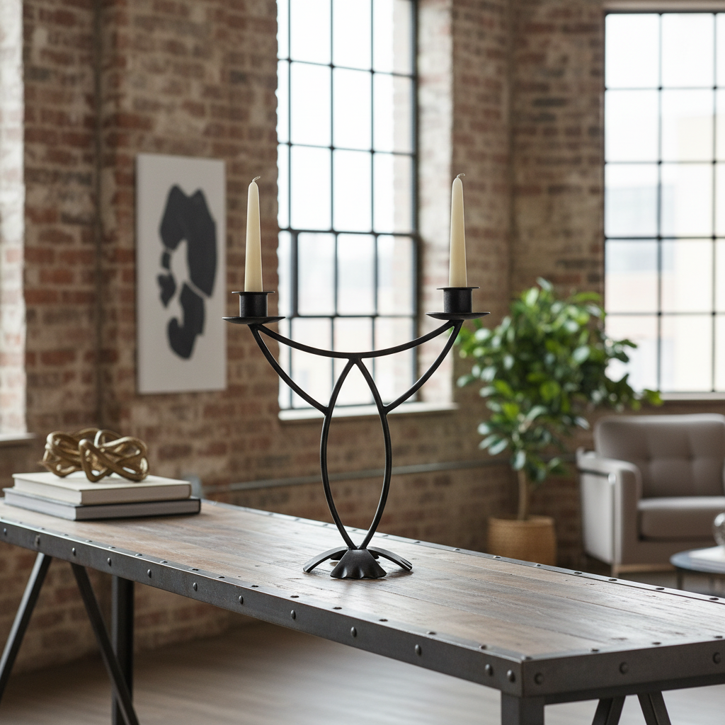 Intersecting Arches and Fluted Base Artistic blacksmithing is on full display in the meticulously crafted silhouette. The central stem splits into two gracefully intersecting curves creating a beautiful open geometric motif. These fluid arms sweep upward to support two deep cylindrical candle cups each equipped with a wide protective drip pan. A curved horizontal bar elegantly connects the two holders adding structural integrity and visual harmony. The entire piece is perfectly grounded by a heavy four petal base with deeply fluted edges resembling an abstract forged flower.