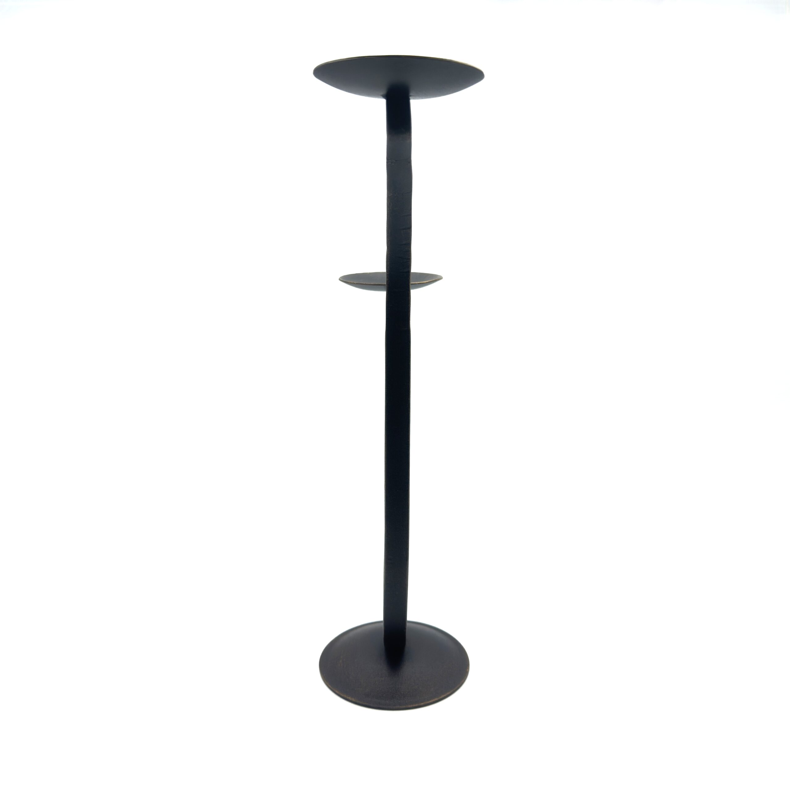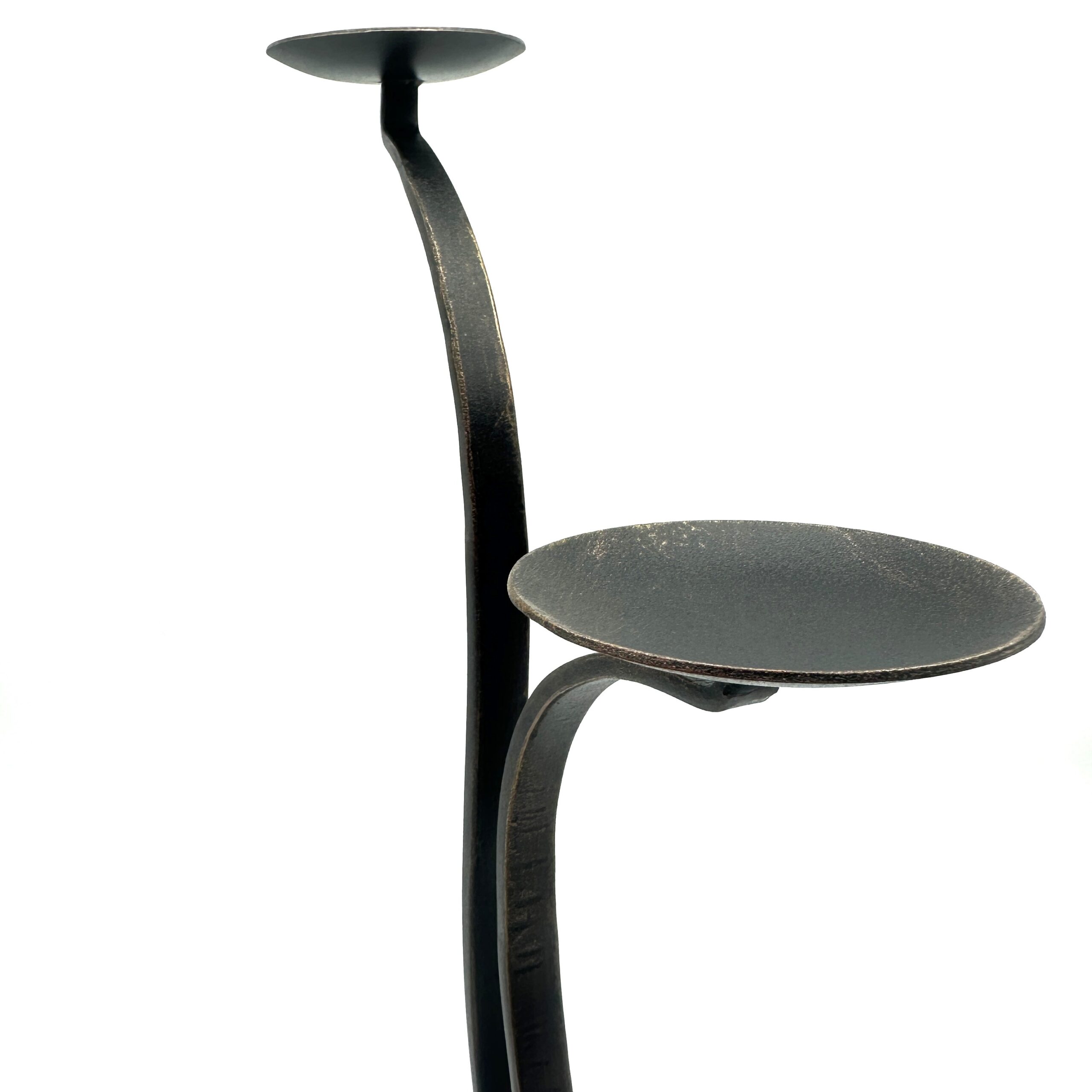 Intricate Ribbon Scroll Design Artistic blacksmithing is on full display in the mesmerizing central structure. Solid flat iron bars are expertly heated and hammered into graceful open scrolled ribbons that seem to flow effortlessly through the air. These fluid curves showcase incredible traditional skill while supporting two robust candle cups each equipped with a wide protective drip pan. The entire structure rests securely on a heavy weighted round base ensuring stable display and perfect horizontal balance.