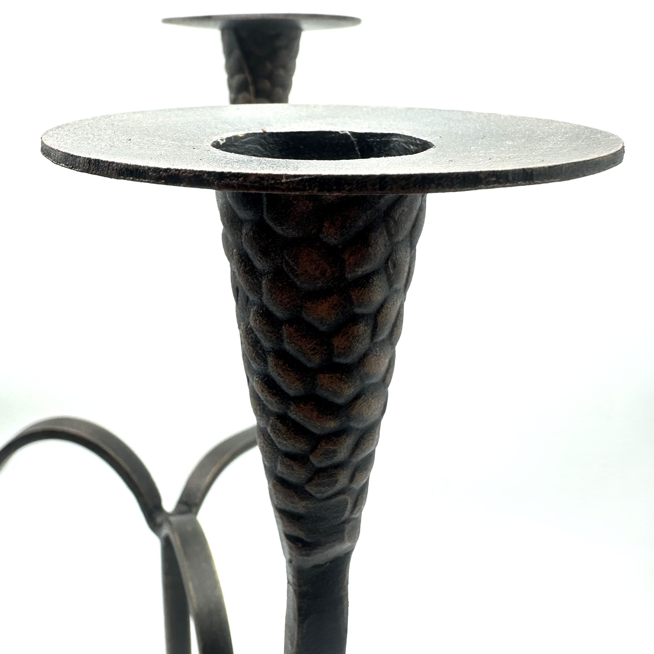 Intense Relief Hammered Textures Artistic mastery is immediately apparent in the extraordinary detailing of this piece. The heavy solid round base and the three tall candle cups are meticulously forged with a deep relief texture. This intense raised surface contrasts beautifully with the smooth flowing lines of the solid iron arms which curve downward in elegant U shapes before rising to support the side lights. The wide flat drip plates cap off the design providing both historical authenticity and practical wax protection.