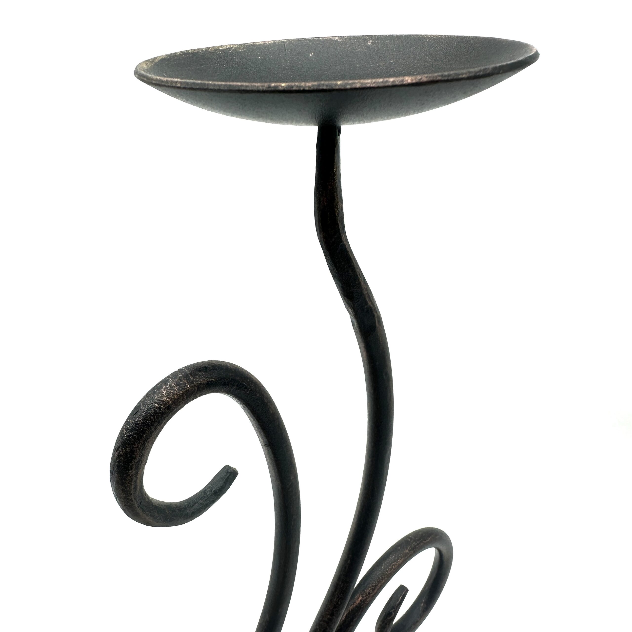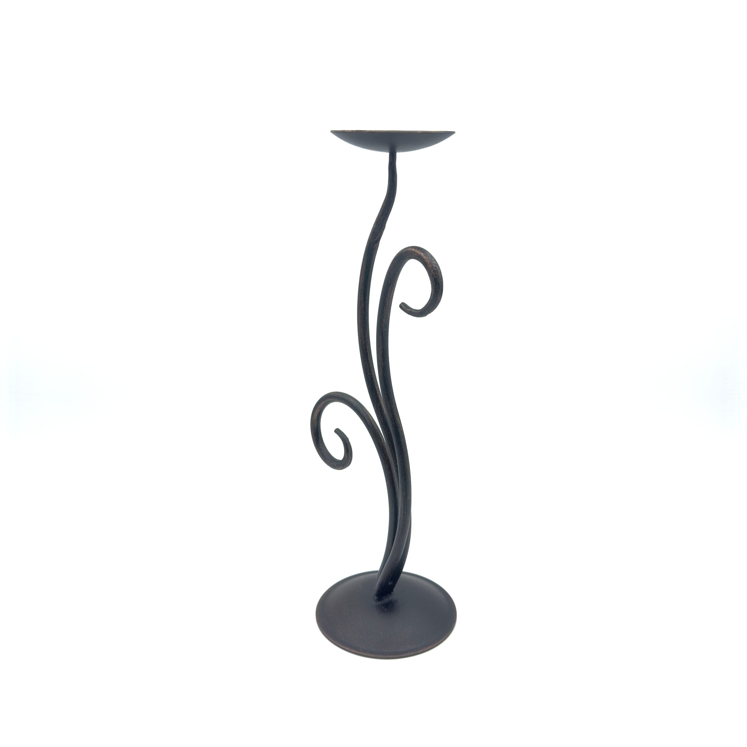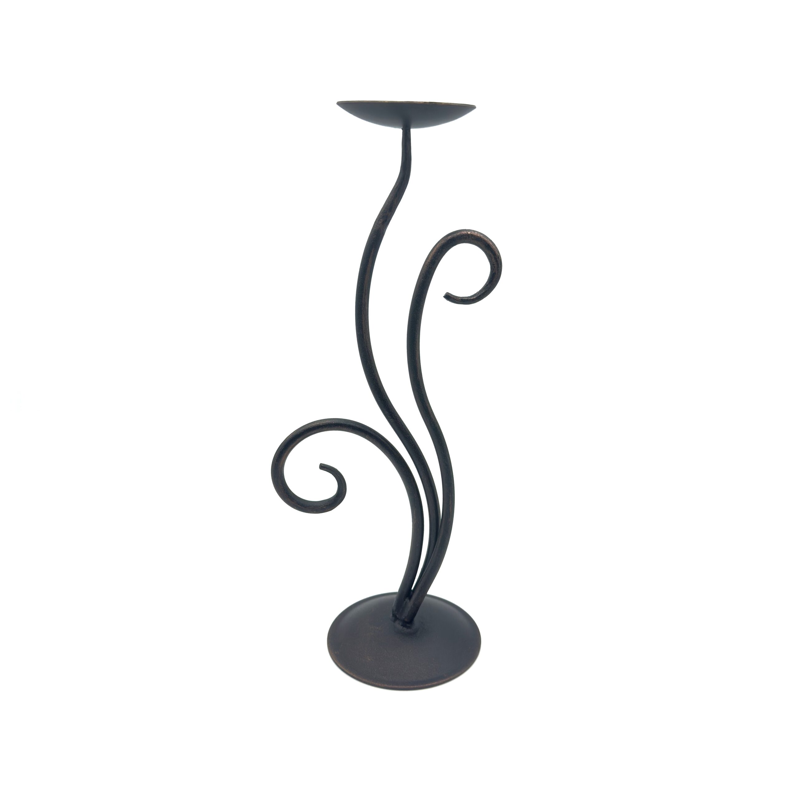 Infuse your home with organic elegance. This 14 inch (35cm) hand forged iron candle holder features a beautifully flowing central stem framed by asymmetrical scrolls and a flat pillar candle plate resting securely on a solid round base.