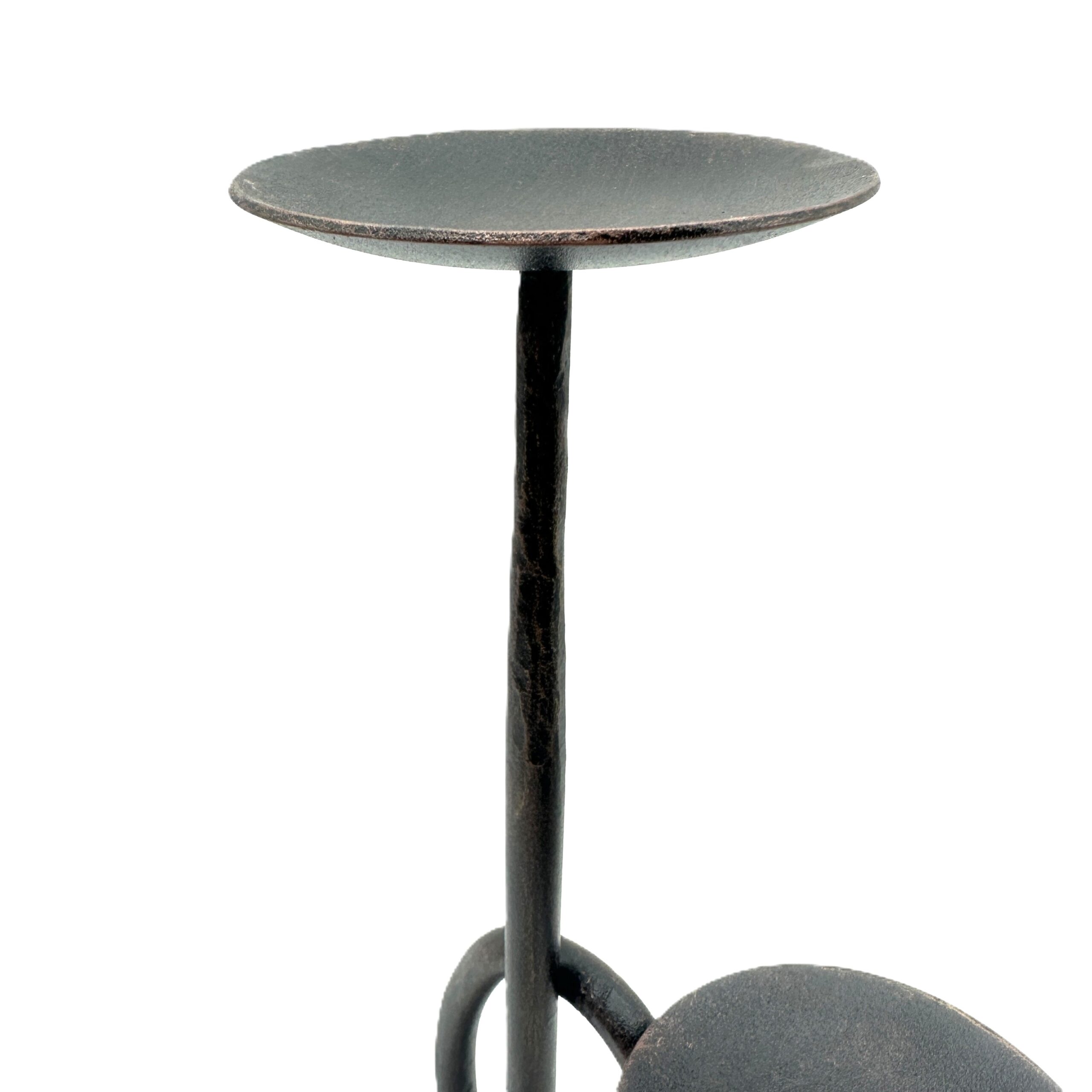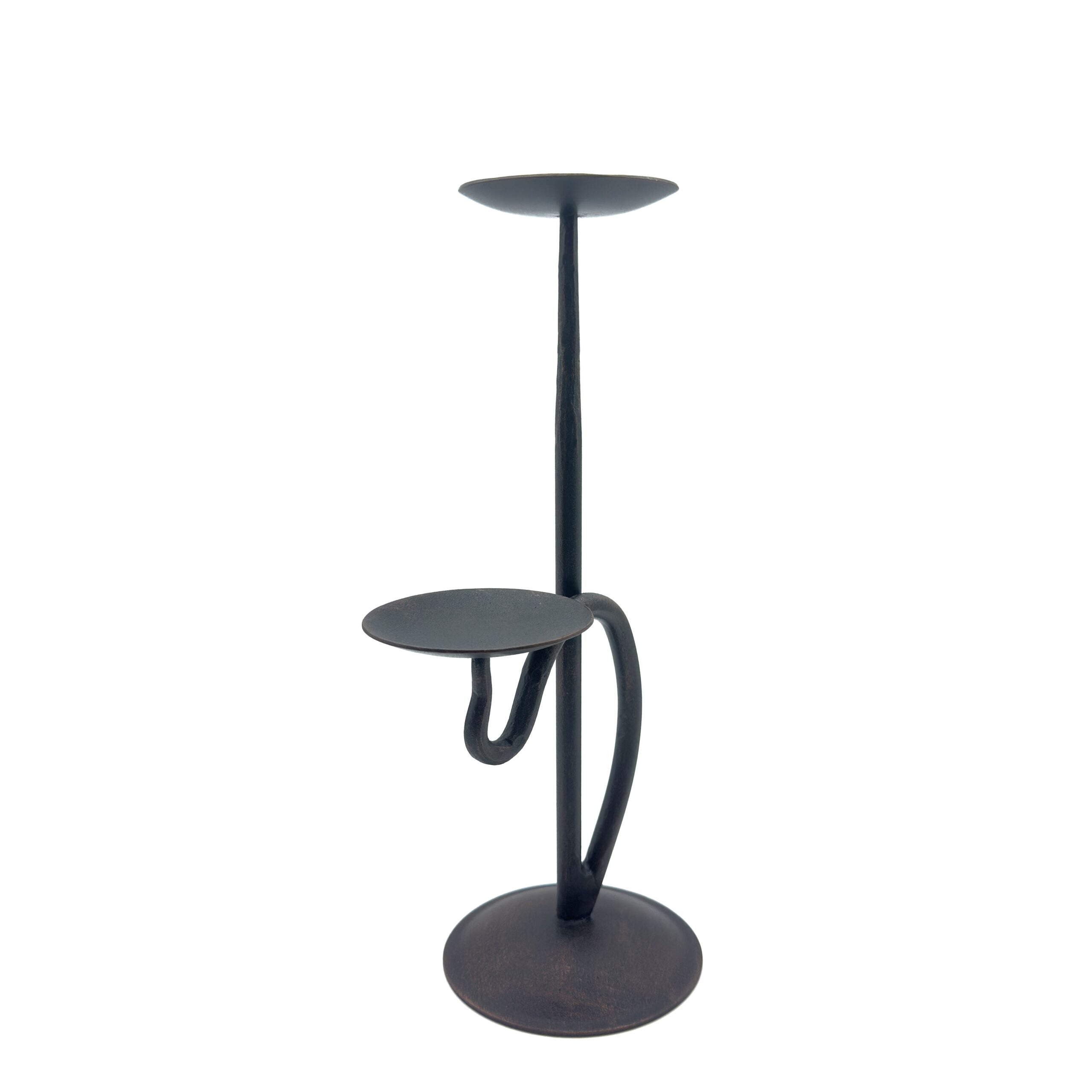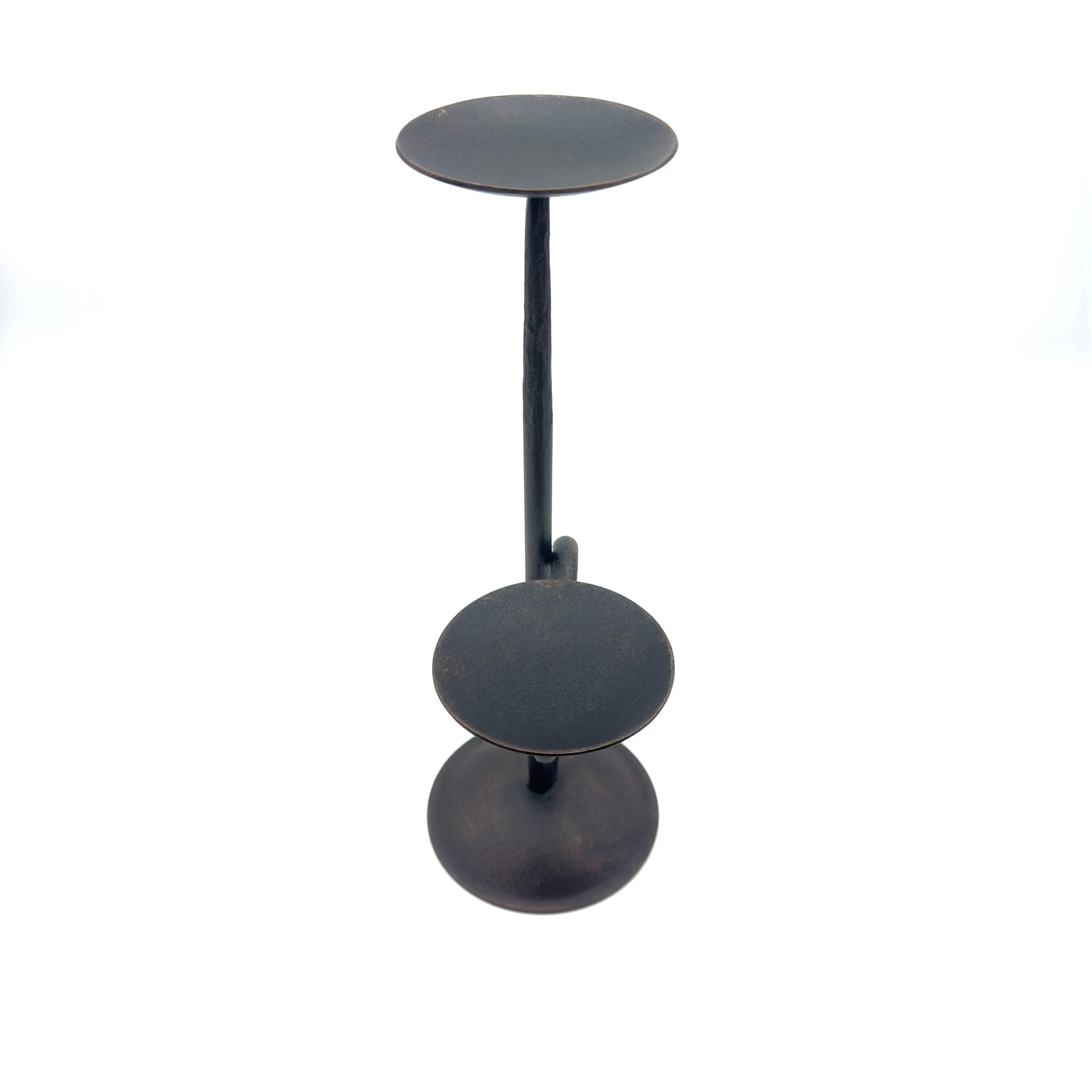 Bring architectural depth to your intimate spaces. This compact 15 centimeter tall hand forged iron candle holder features a unique two tier design with dual flat plates and a graceful connecting curve perfect for elegantly displaying block candles side by side.