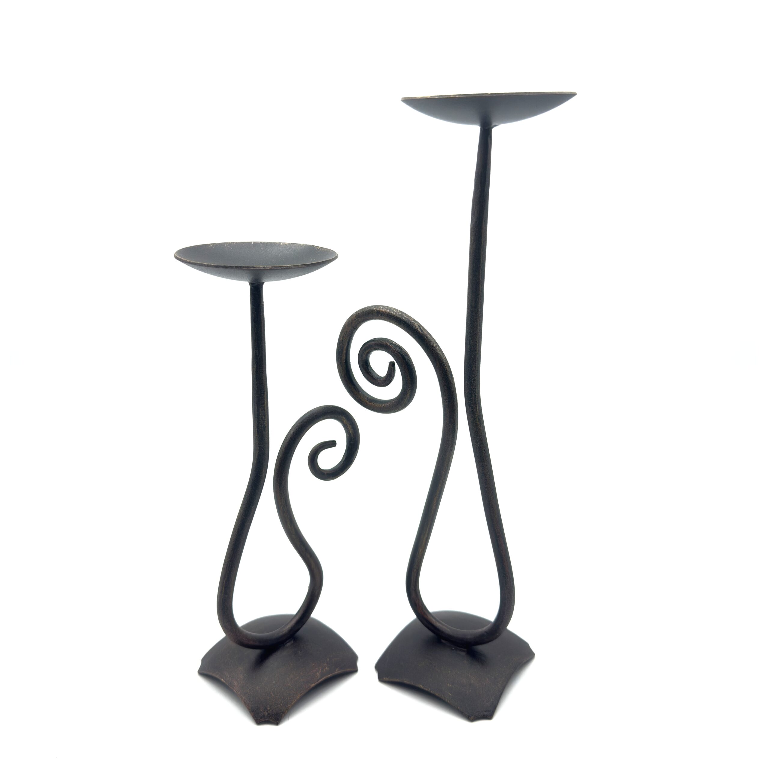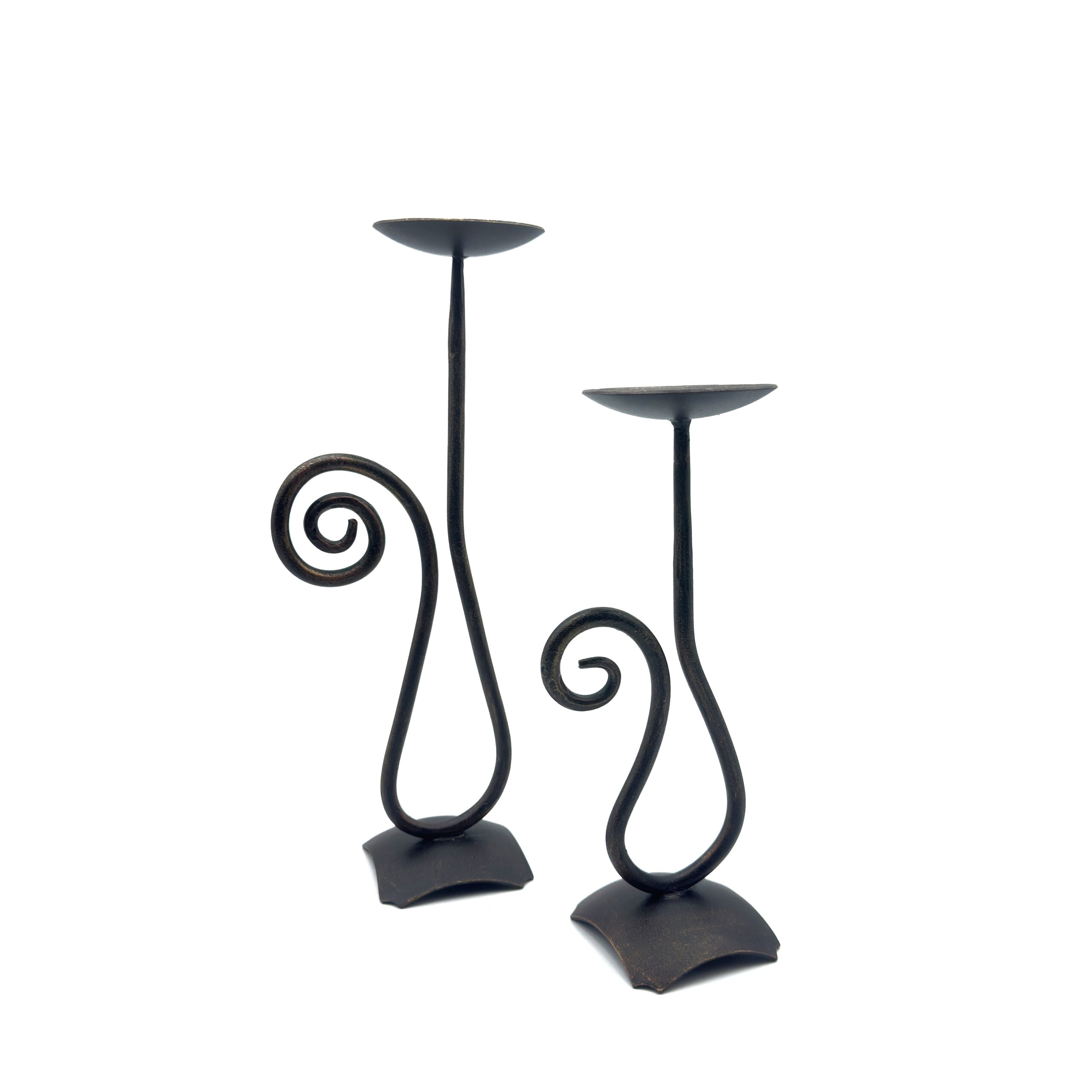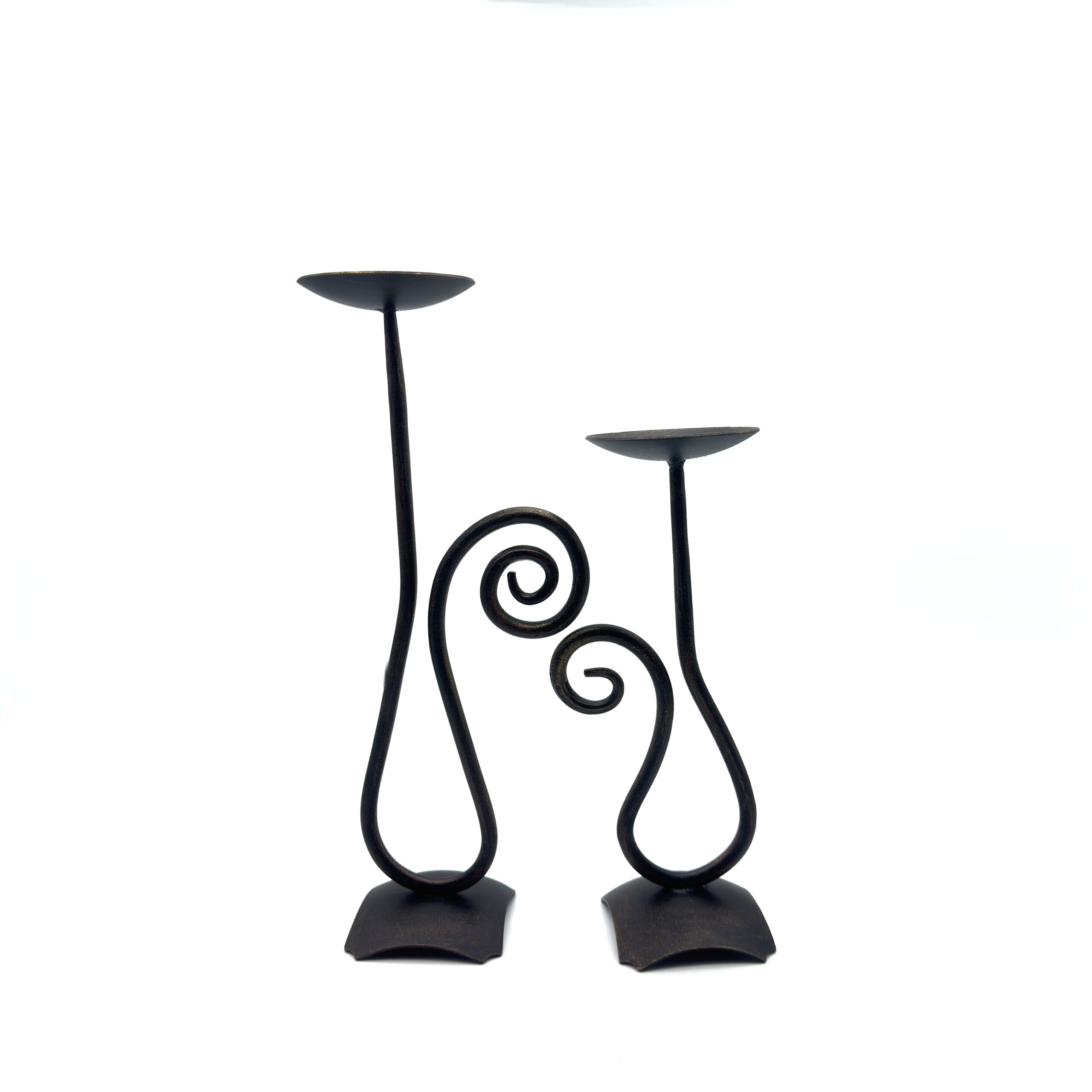 Complementary Spiral Design Artistic blacksmithing is beautifully showcased in the synchronized bodies of these two stands. Rising from distinctly curved convex square bases the solid iron stems sweep downward into graceful loops before culminating in delicate inward facing spirals. When placed side by side these varied height pieces create a mesmerizing interlocking visual dance. Both pieces feature wide flat plates specifically designed to safely and elegantly accommodate large pillar candles.