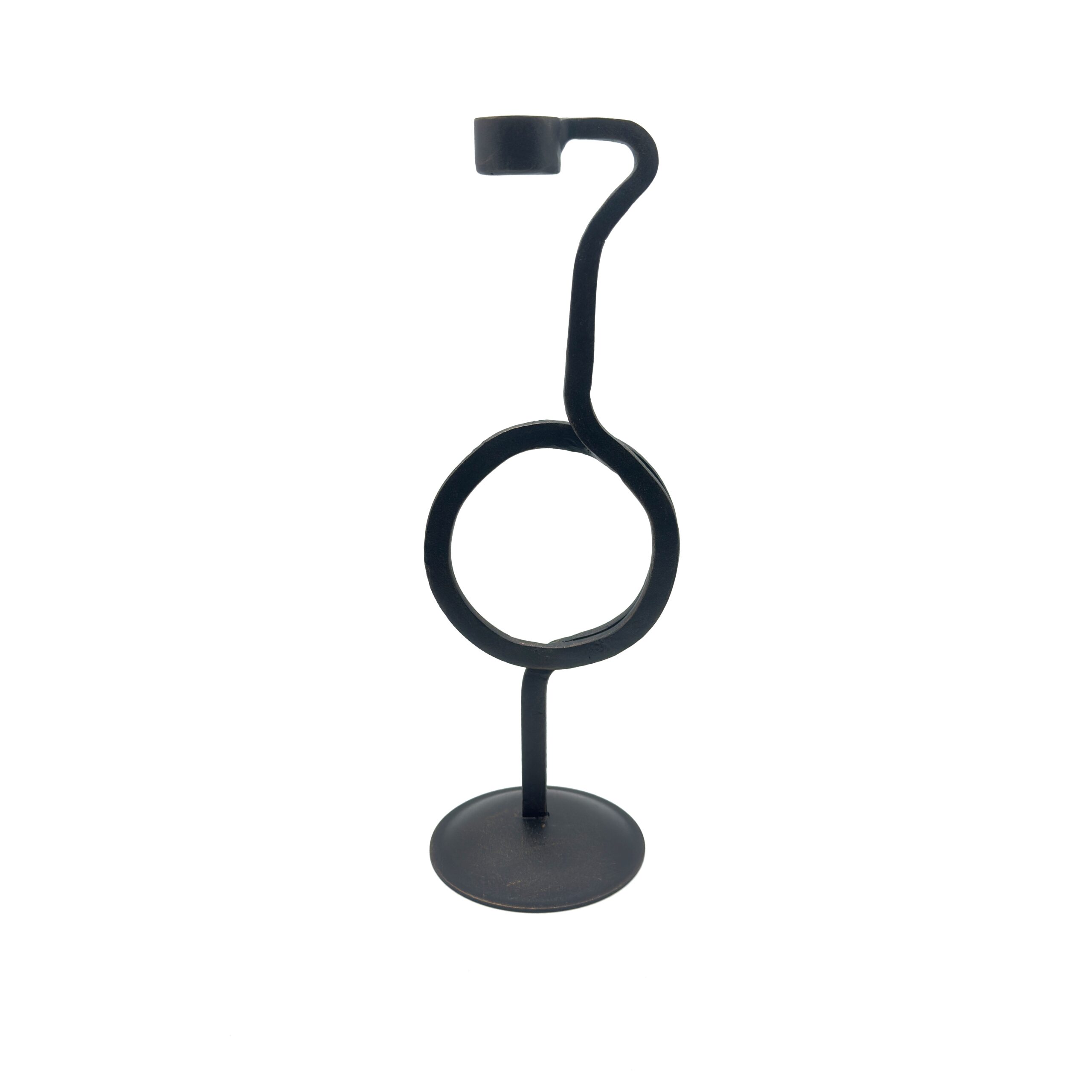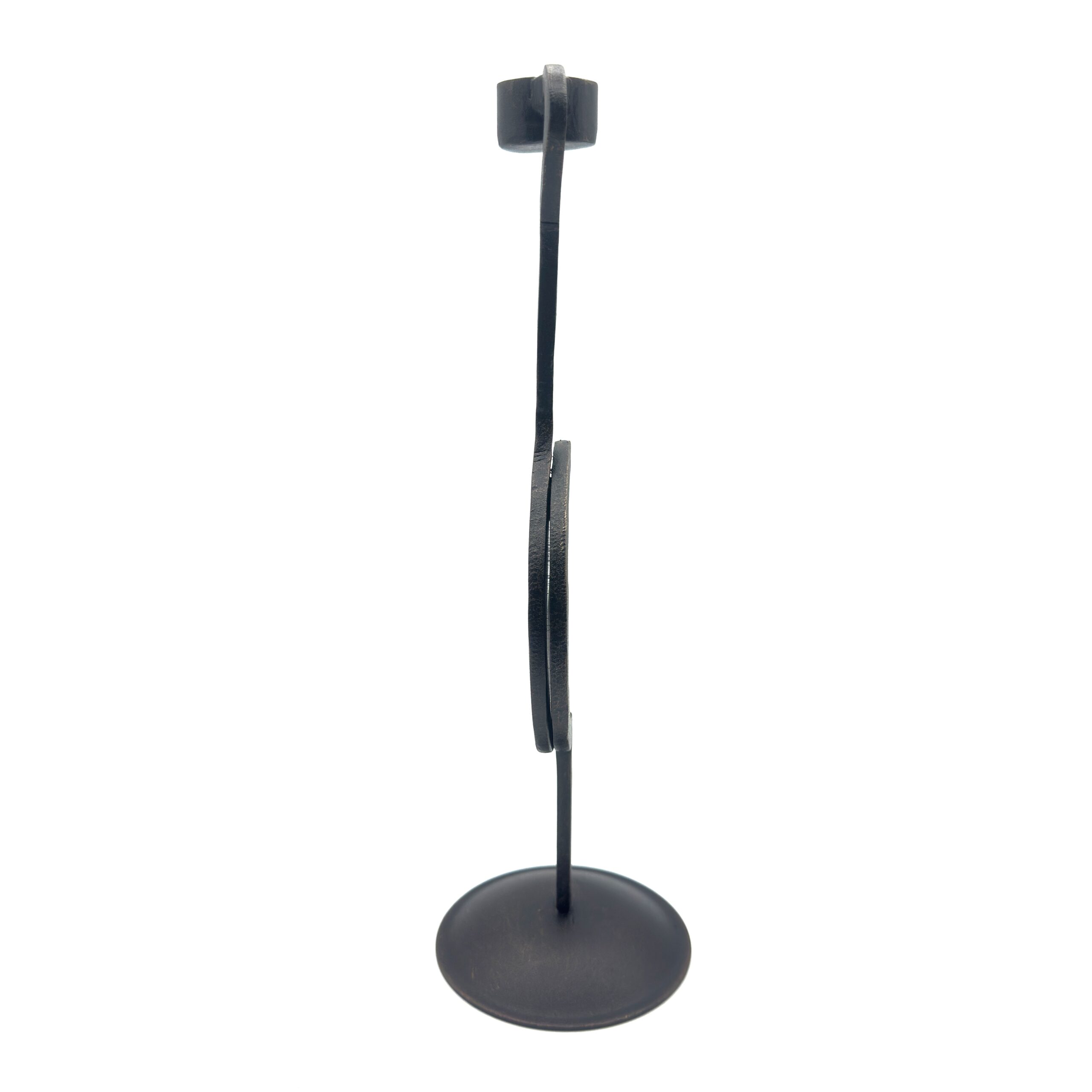 Striking Circular Focal Point Artistic mastery is immediately apparent in the unconventional structure of this piece. Rising from a solid round base the central iron stem transitions into a breathtaking geometric ring before continuing upward. This unexpected circular motif creates a stunning window of negative space. At the peak a deeply hammered candle cup is uniquely attached to the side of the stem providing an asymmetrical and highly sophisticated profile designed specifically for classic taper candles.