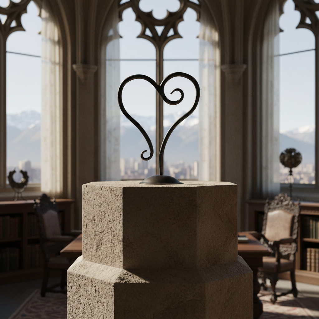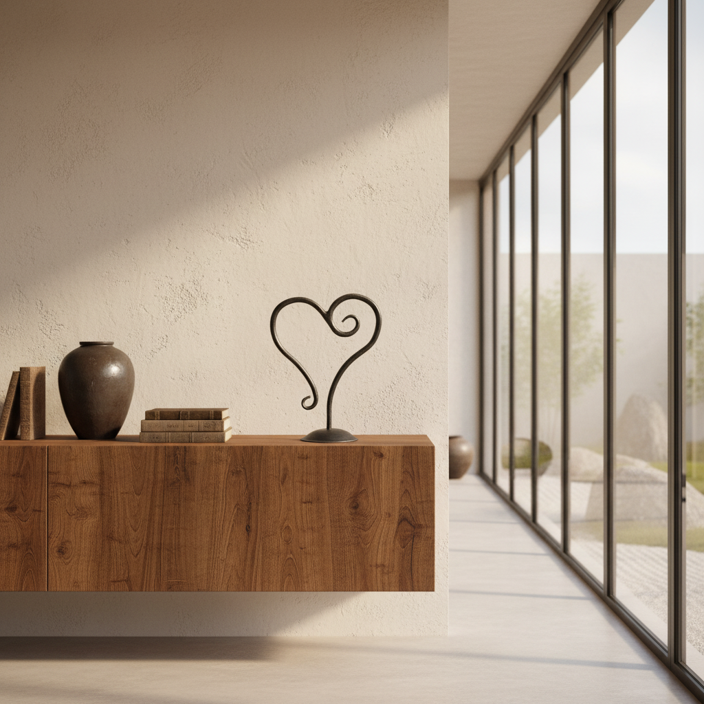 Sculptural Symmetry and Heart Motif Detailing Artistic mastery is immediately apparent in the extraordinary detailing of this piece. Rising from its massive heavy scrolled base composed of intersecting S-scrolls the central bükümlü pillar transition into two graceful sweeping arms. These arms sweep upward to unite at the center in a powerful hand forged scrolled heart shape which serves as a mesmerizing focal point showcasing the unmistakable marks of the blacksmiths hammer. This deliberate harmony between the rugged foundation and the complex flowing lines of the solid iron arms creates a mesmerizing visual tension.