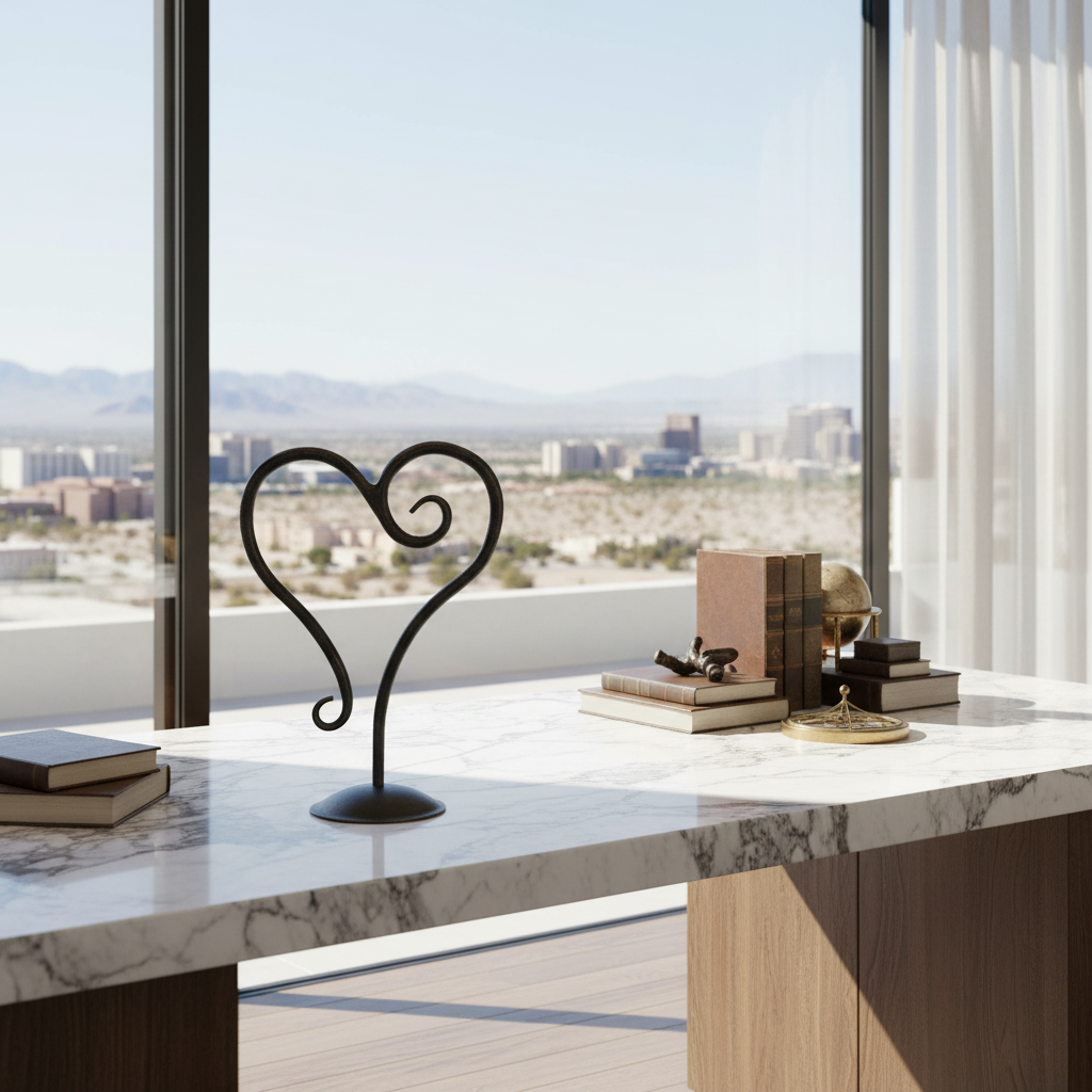Command attention with extraordinary structural form. Standing 10 inches (26cm) tall this hand forged iron decorative object features dramatic symmetrical scrollwork uniting in a beautifully forged heart shape above a substantial heavy curvilinear foundation offering a breathtaking visual anchor for your curated spaces.