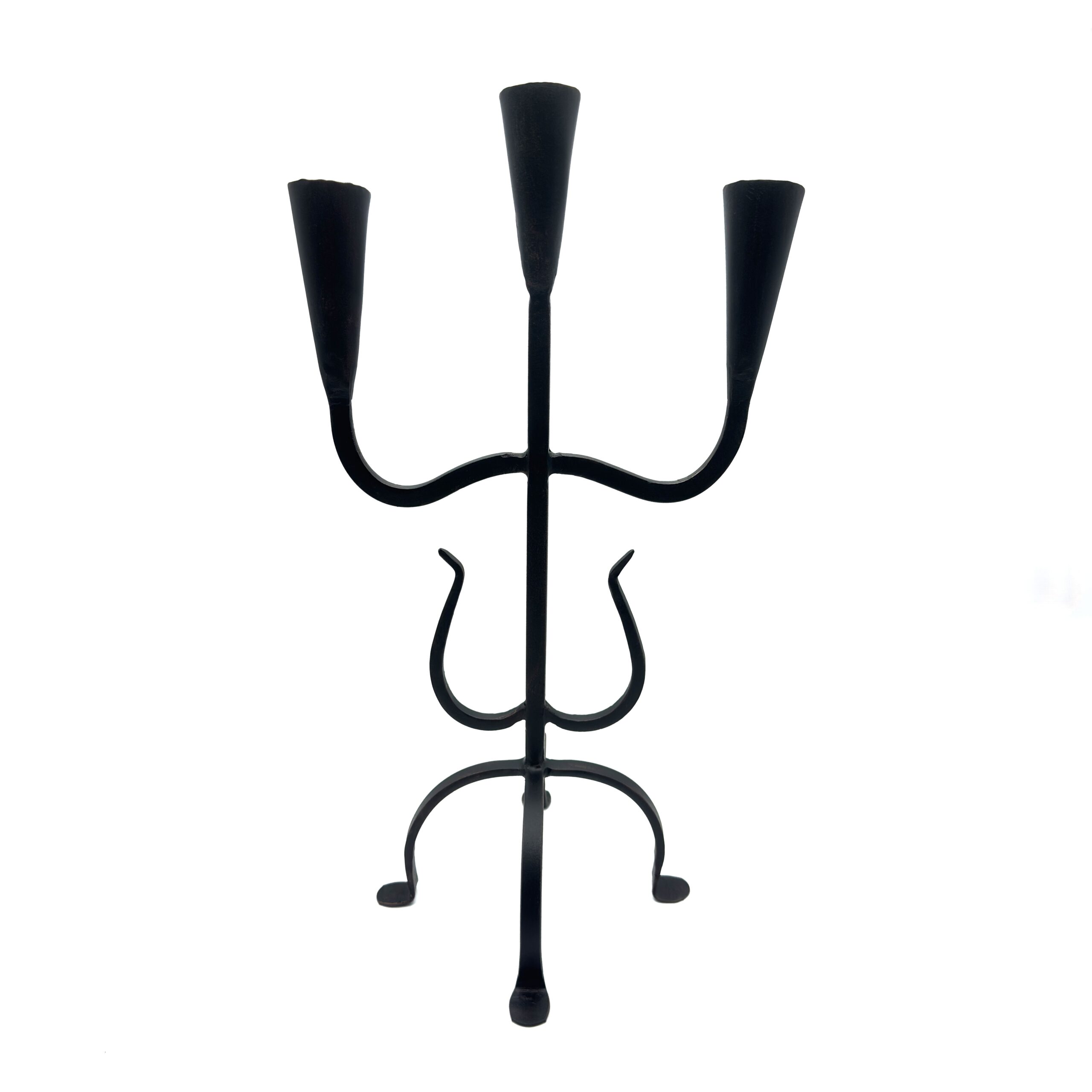 Bring the raw beauty of traditional blacksmithing into your modern space with this spectacular hand forged wrought iron three light candelabra. Blending heavy duty solid iron construction with graceful sweeping lines and a stable flat base this tabletop candle holder is the perfect addition to any rustic farmhouse or classically styled home.