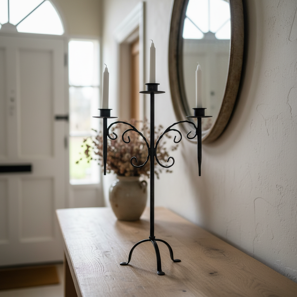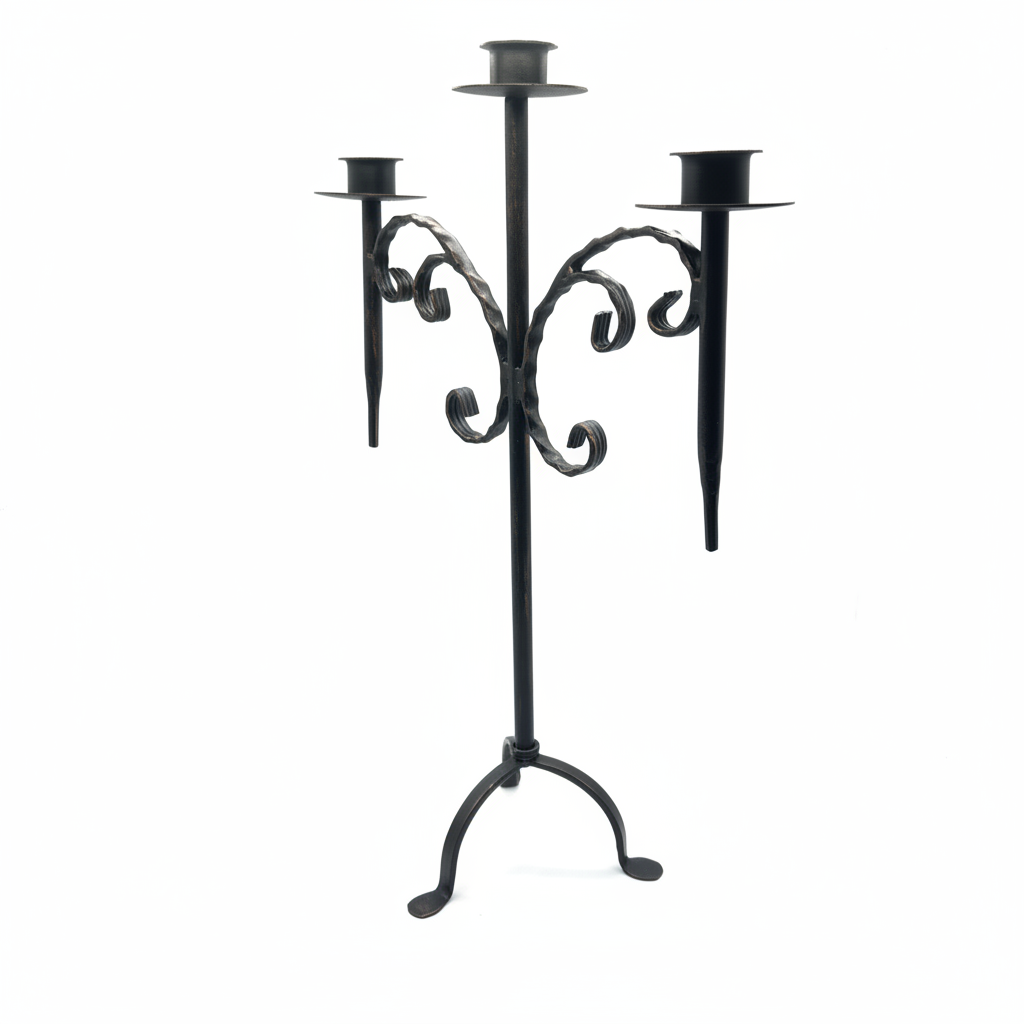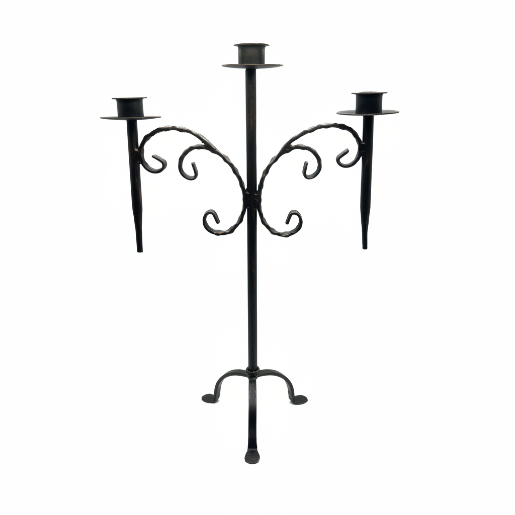 Transform your dining experience and living spaces with this stunning three light solid wrought iron candelabra. Blending heavy duty traditional blacksmithing with graceful sweeping lines this tall candle holder is the perfect addition to any rustic farmhouse or classically styled home.