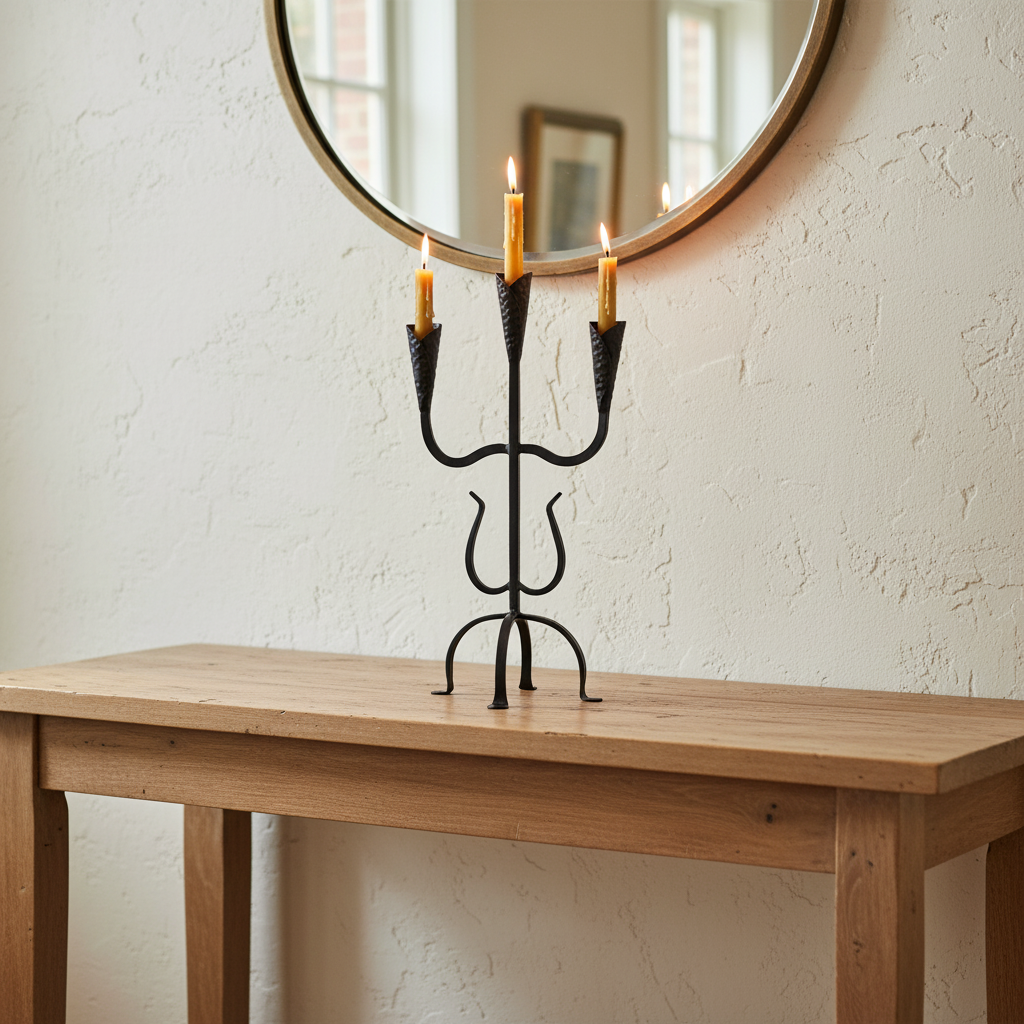 Hand Forged Wrought Iron 3 Light Candelabra (Antique Patina) Solid Flat Base Candle Holder