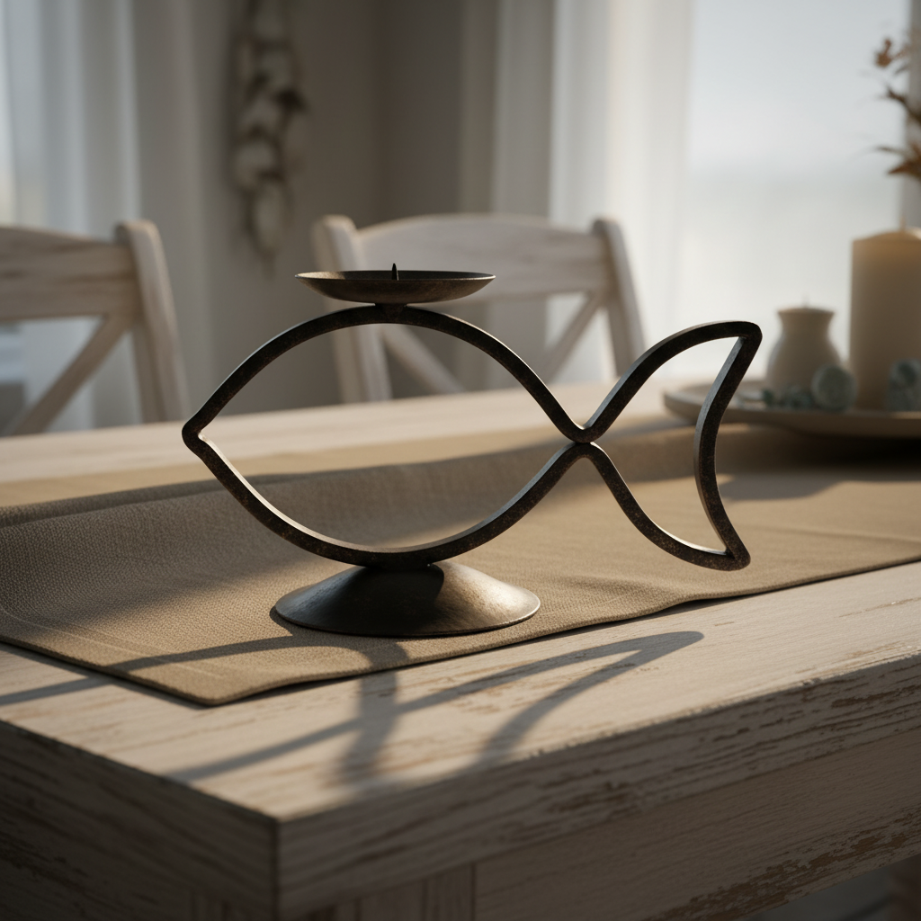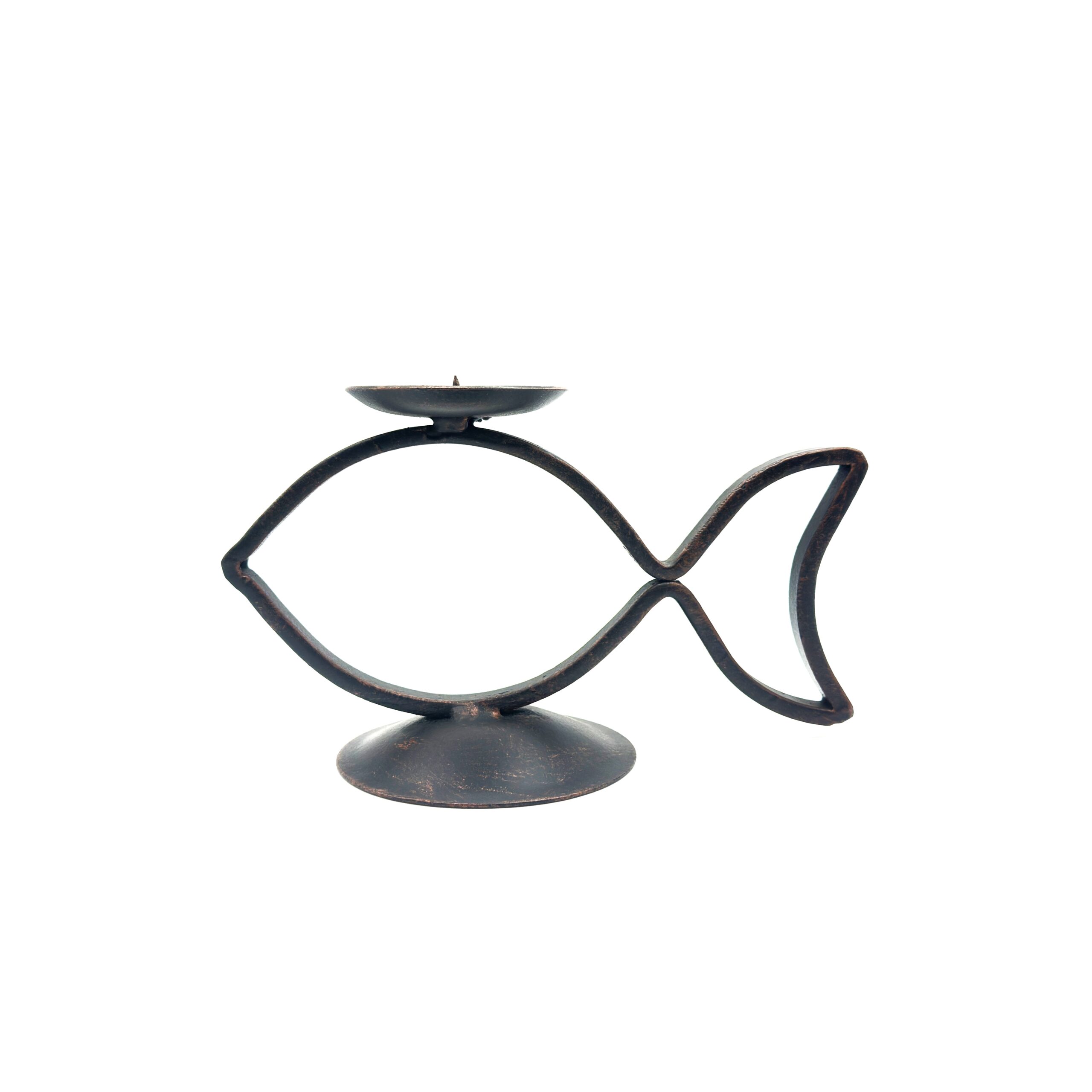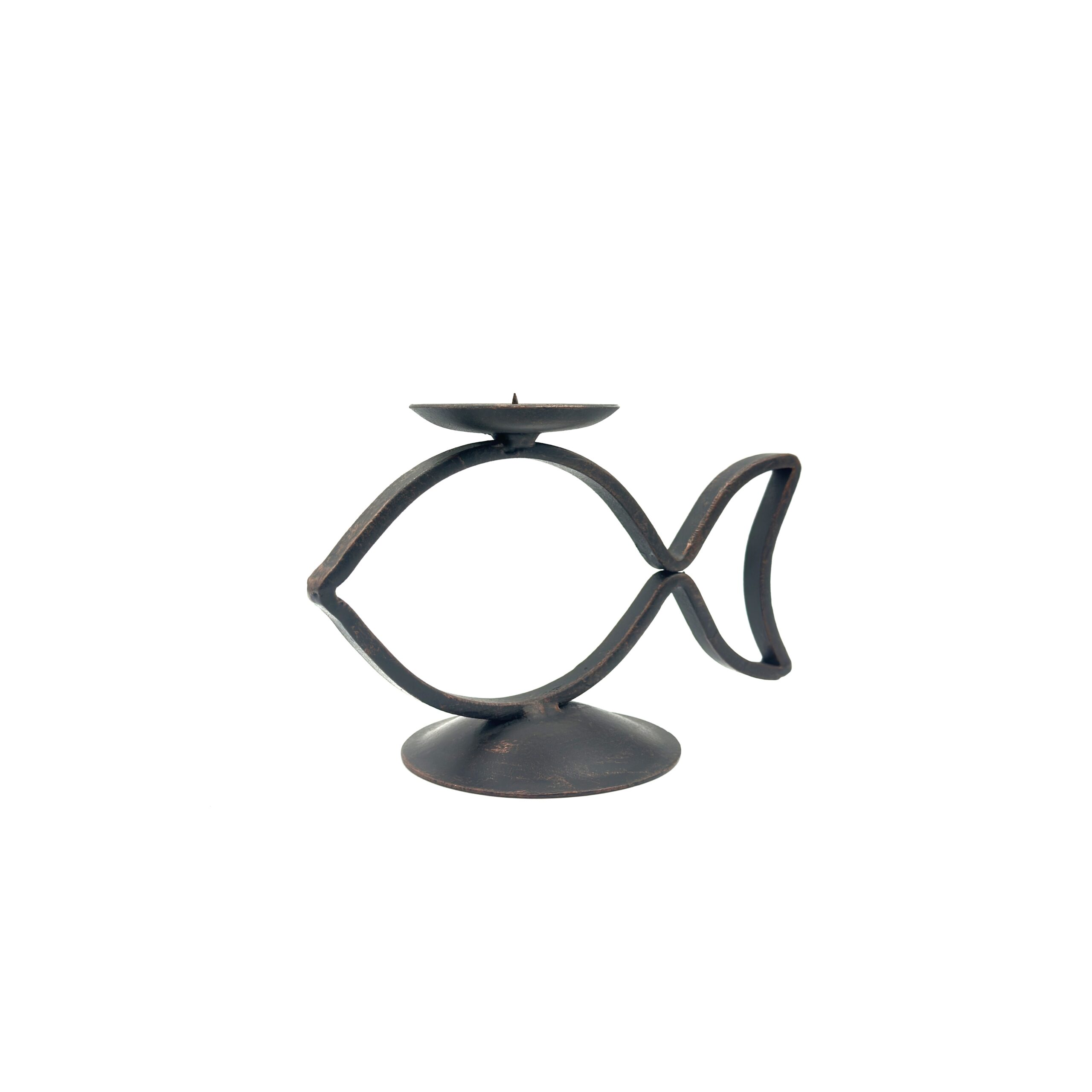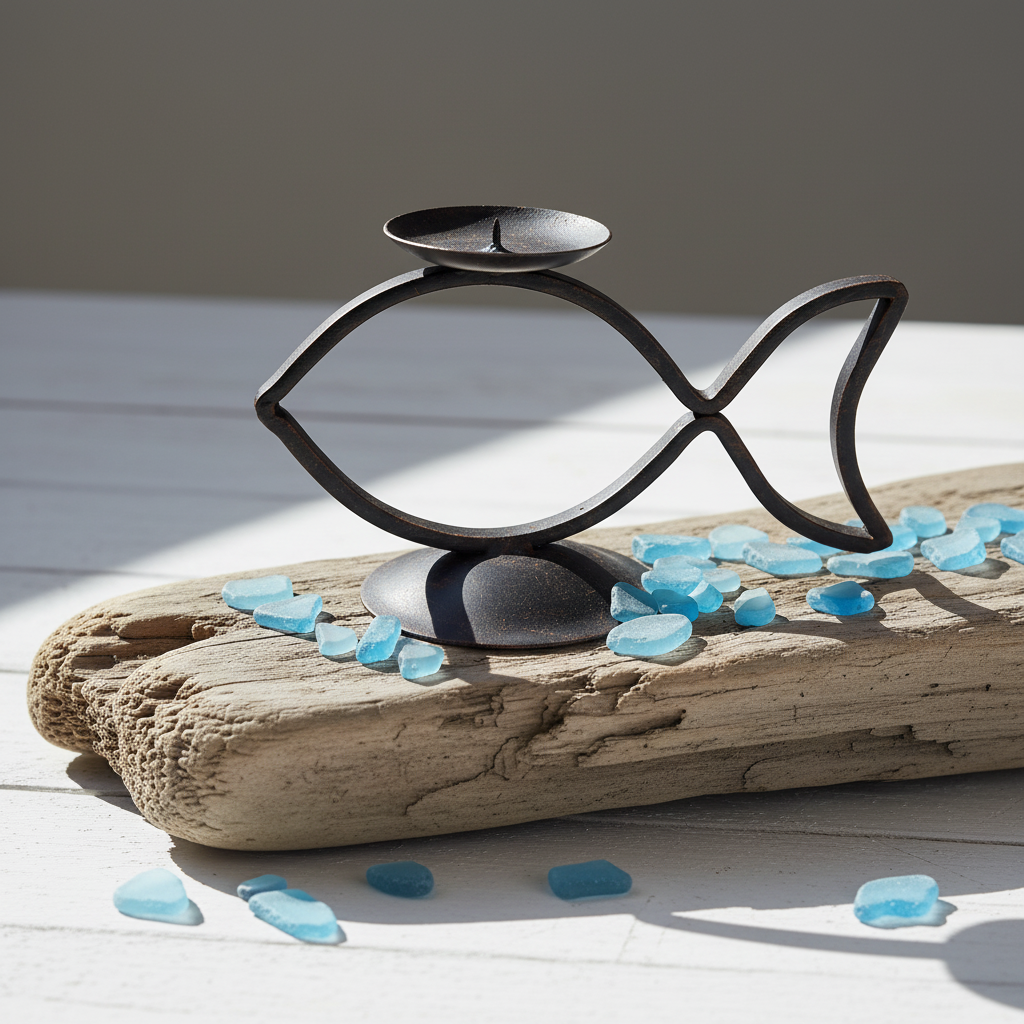 Elevate your interior design with the exquisite charm of this Hand Forged Iron Candle Holder. Standing 23 cm tall this piece effortlessly blends minimalist coastal design with classic iron craftsmanship. The graceful fish silhouette gives this candle holder a distinct boutique character that functions as both a vital lighting accessory and a standalone sculpture.