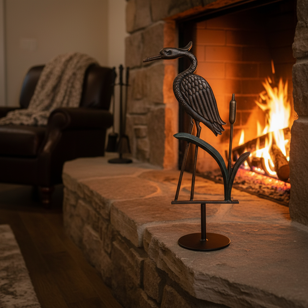 Versatile Staging & Decor Whether placed horizontally to frame a doorway or fireplace or vertically to bring dimension to an empty corner this heron sculpture provides a stable and balancing element on any flat surface. Its impressive scale and botanical details make it a stunning example of contemporary metalwork for the discerning homeowner looking to create an inviting and luxurious atmosphere.
