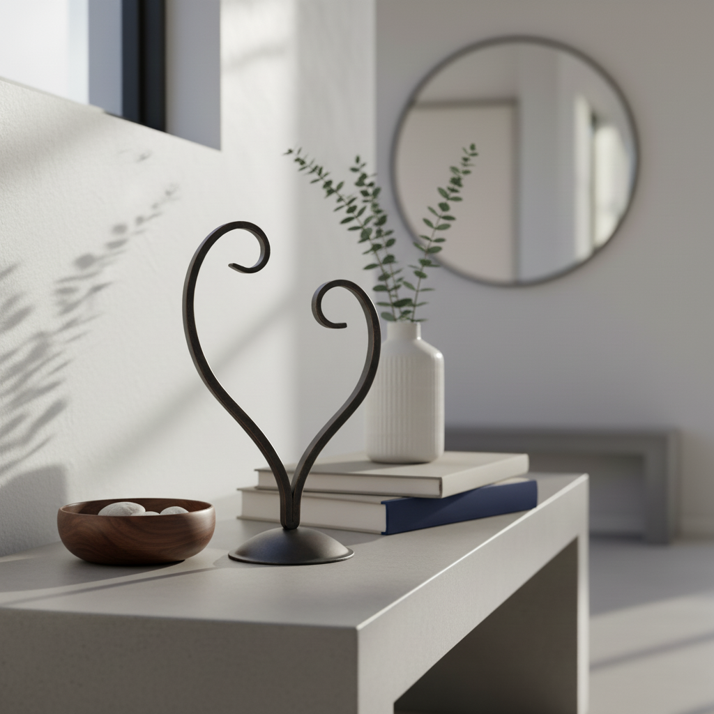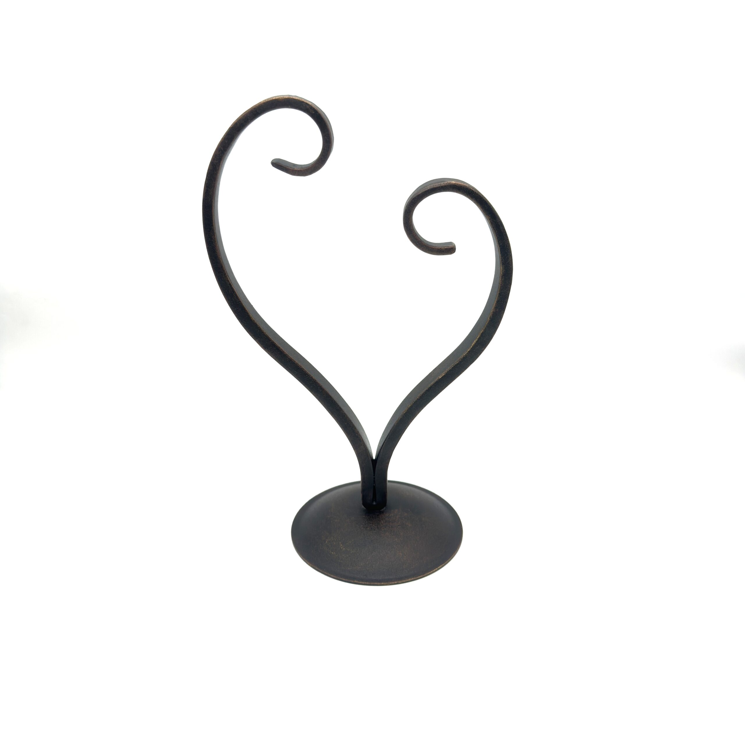 A timeless symbol of affection. This 25cm handmade wrought iron sculpture features a graceful asymmetrical heart silhouette and intricate central wire wrapping finished in a warm antique patina. It is the perfect centerpiece for your entry console table or mantle.