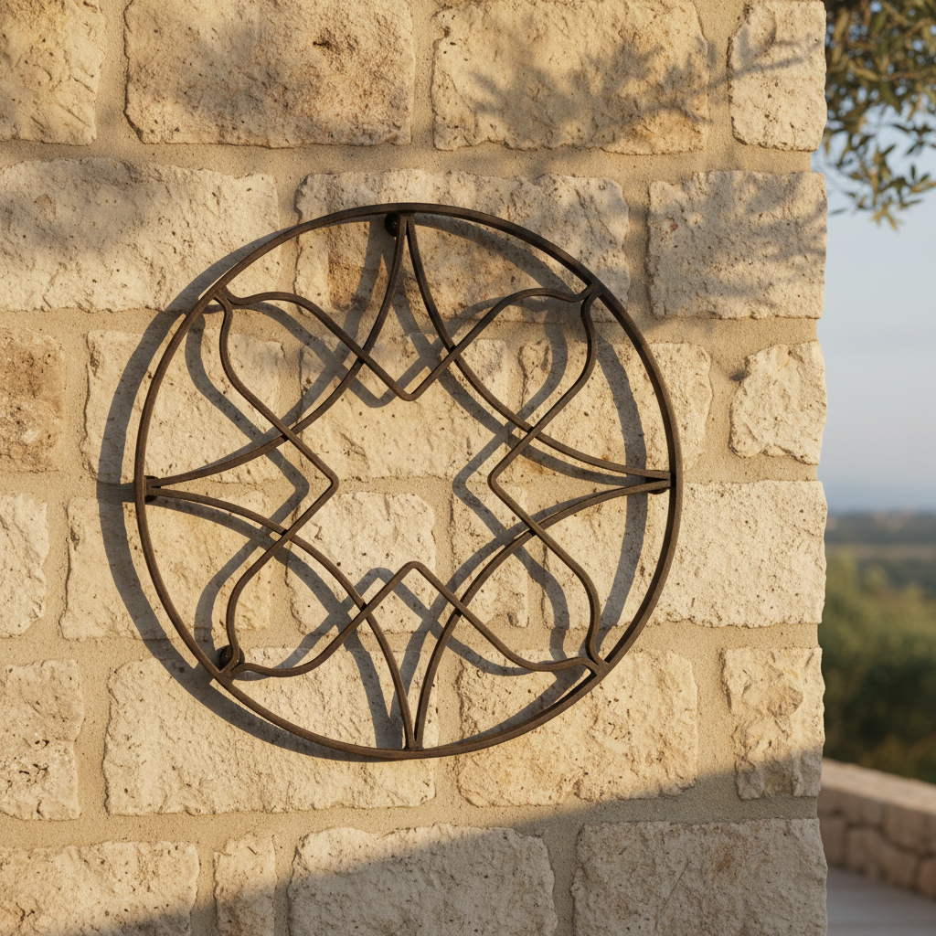 A masterpiece of geometric precision. This 45cm handmade wrought iron wall decor features a sophisticated circular frame with interlocking linear patterns finished in a warm antique patina. It is the perfect modern rustic accent for your living room office or hallway walls.