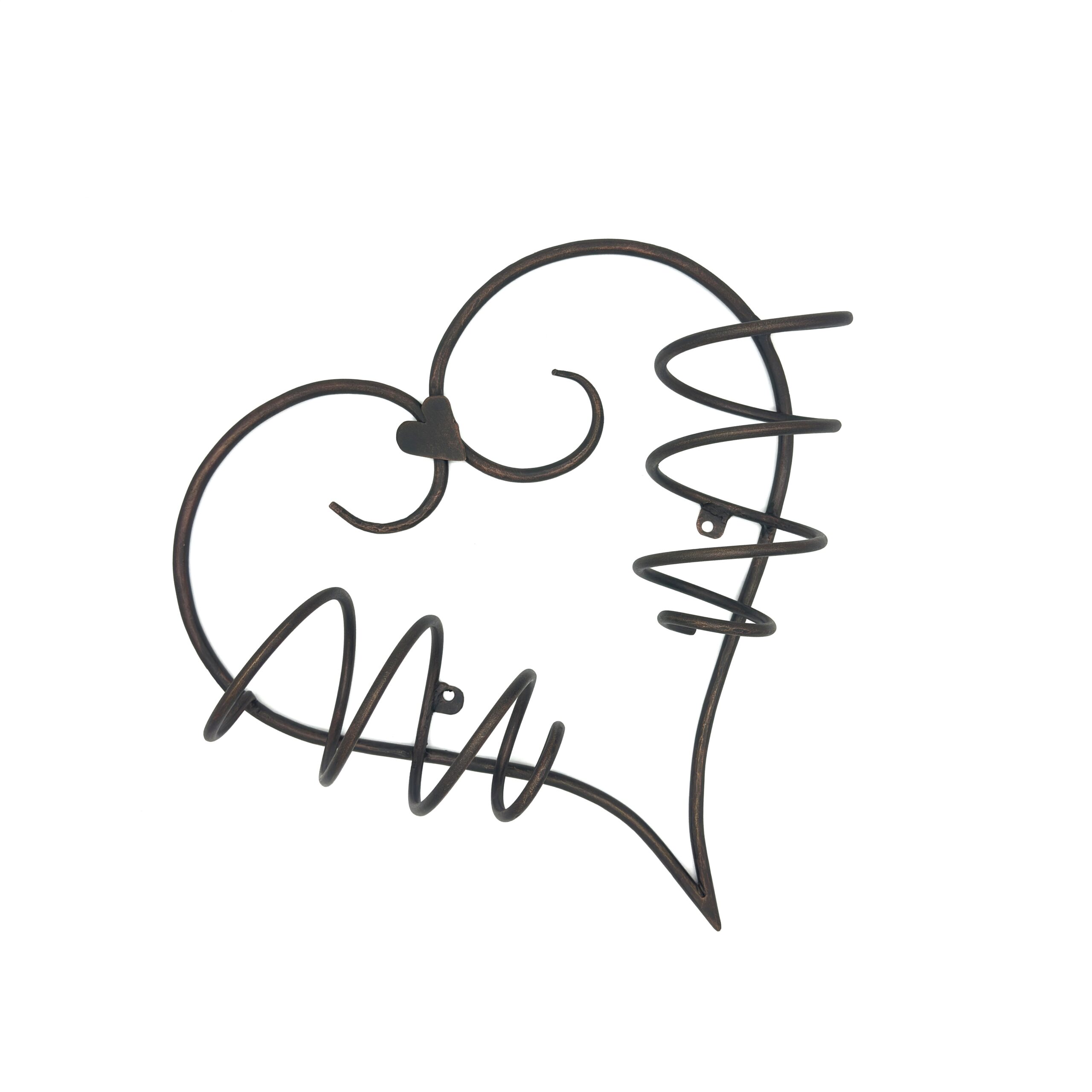 A romantic toast to style. This 39cm handmade wrought iron wall mounted wine rack features a graceful heart silhouette and holds two standard bottles finished in a warm antique patina. It is the perfect functional art piece for your kitchen or dining room.