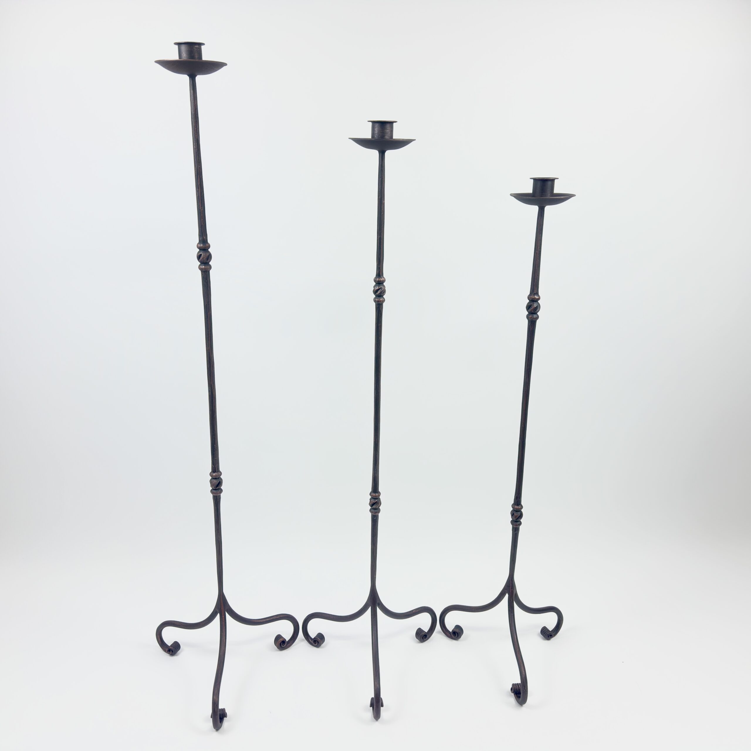 Hand Forged Iron Candelabra Set of 3 (92-112cm) Antique Copper Finish Slender Stem with French Scroll Base