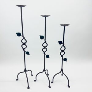 Artistic openwork design. This set of 3 floor-standing candelabras (107-127cm) features a distinctive open-twist iron stem and an elegant arched base, protected by durable electrostatic coating.