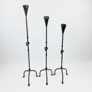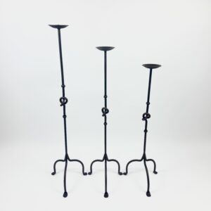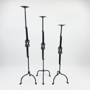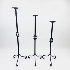 Strength in simplicity. This set of 3 floor-standing candelabras (82-102cm) features a double-rod stem tied in a Hercules Knot, supported by a compact arched base.