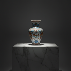 A warm architectural statement. This 30cm handmade ceramic vase features a unique faceted silhouette decorated with russet brown tulips and turquoise accents.