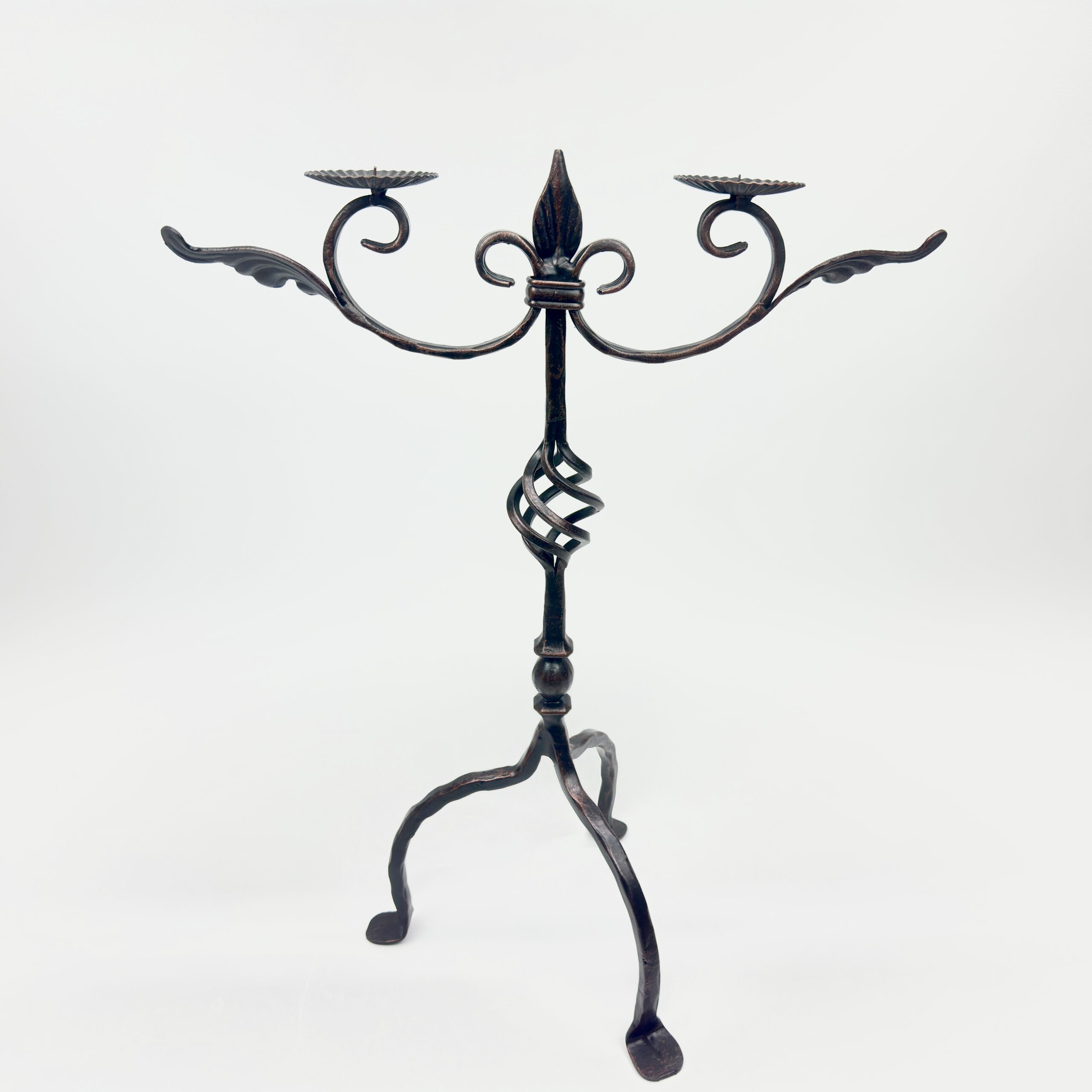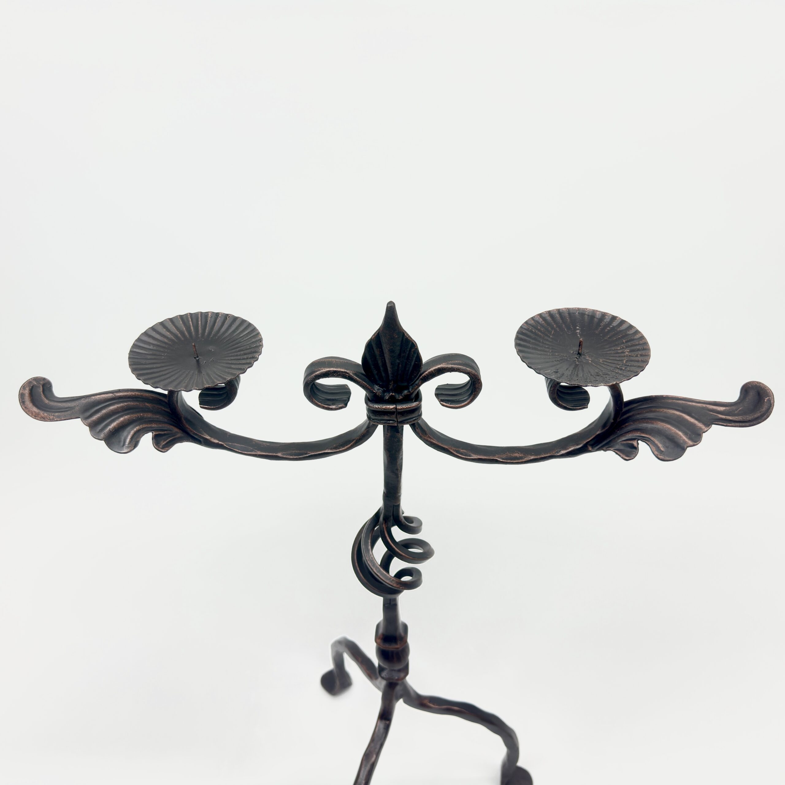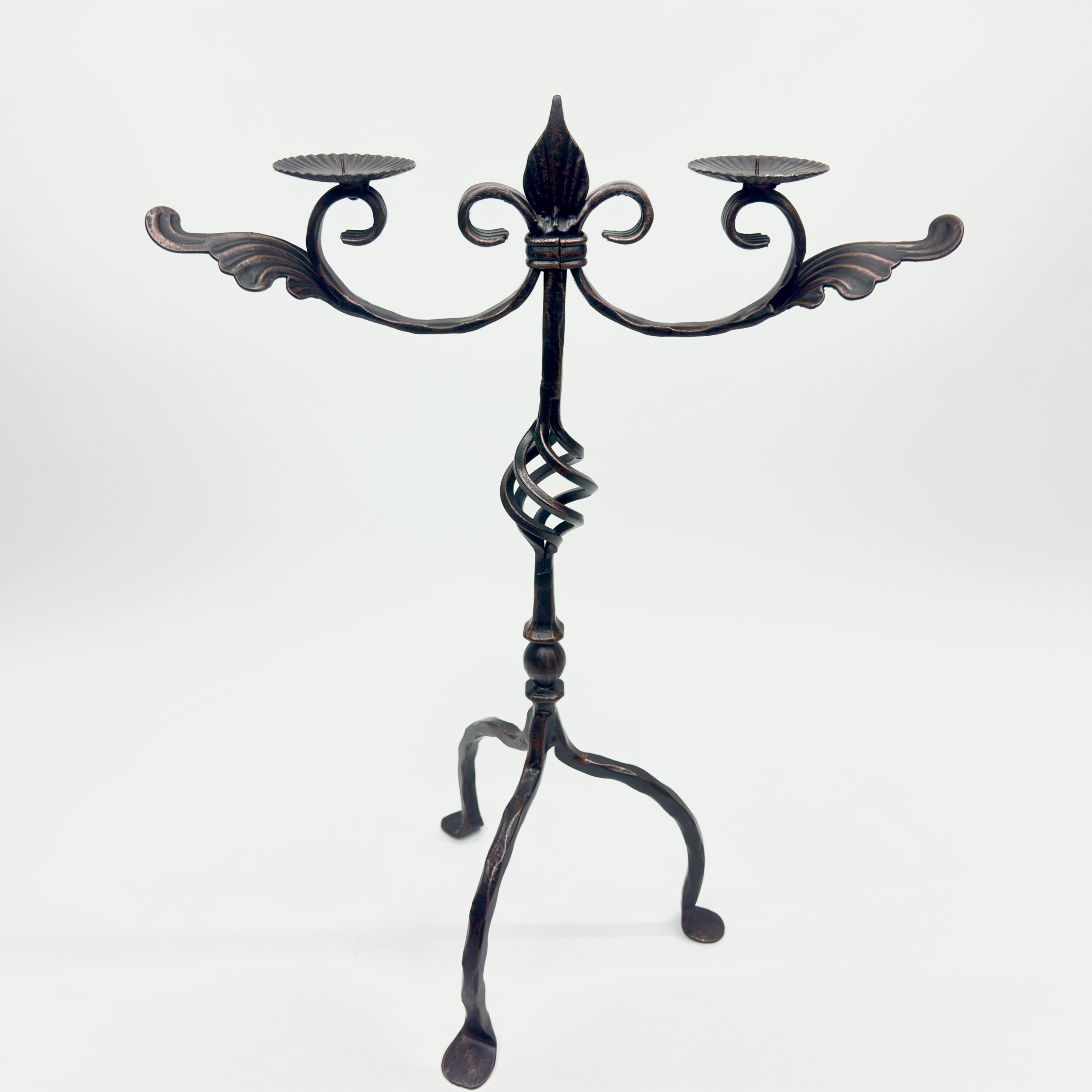 Make a majestic statement with this substantial hand-forged iron candelabra. Standing 23 inches (59cm) tall with an impressive wide span, its warm antique copper finish brings a sense of rustic grandeur and soulful atmosphere to larger spaces.