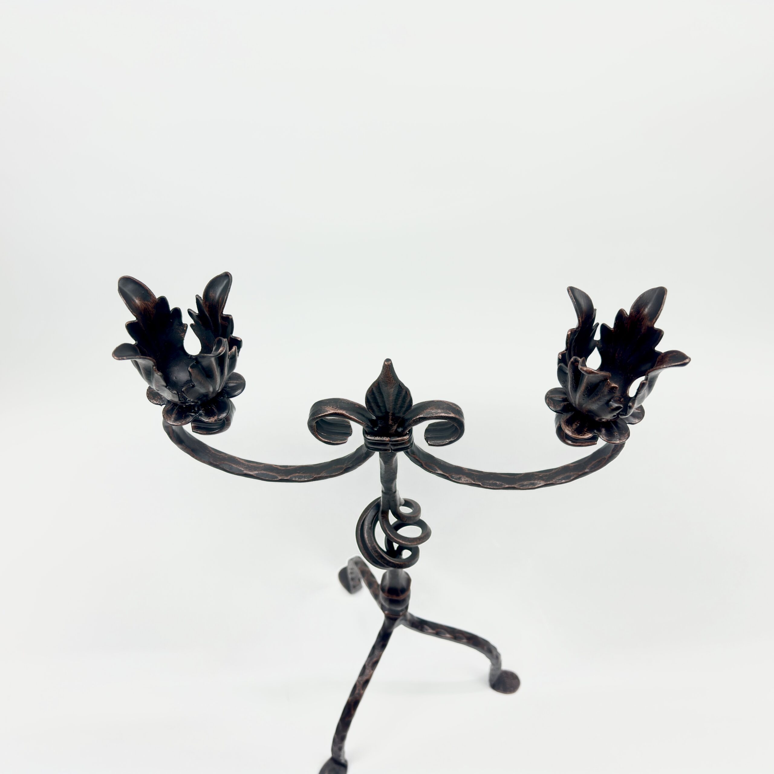 The Cups: Look closely at where the candles rest. These are not simple holders; they are hand-hammered iron leaves, opening up like a bloom to hold the light.