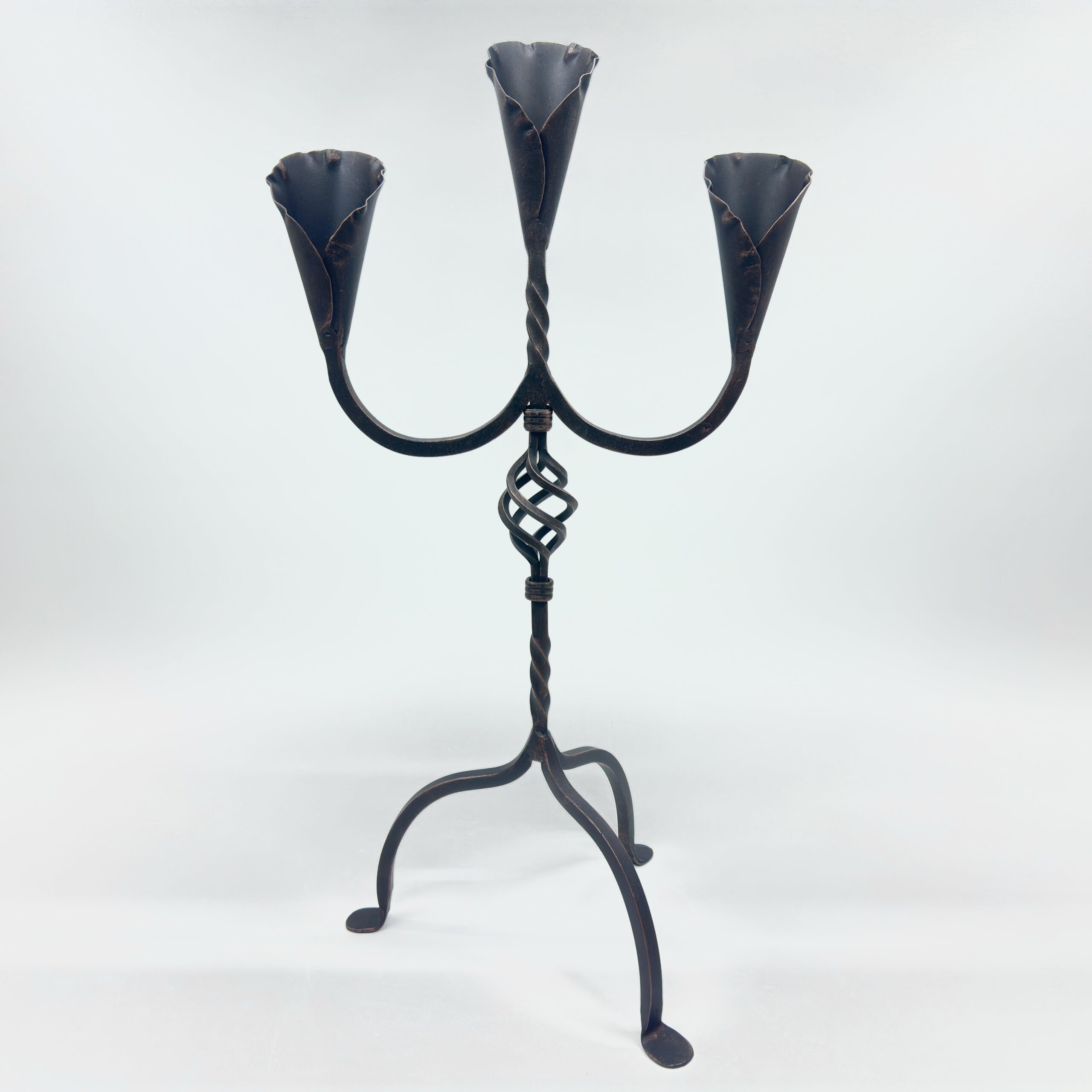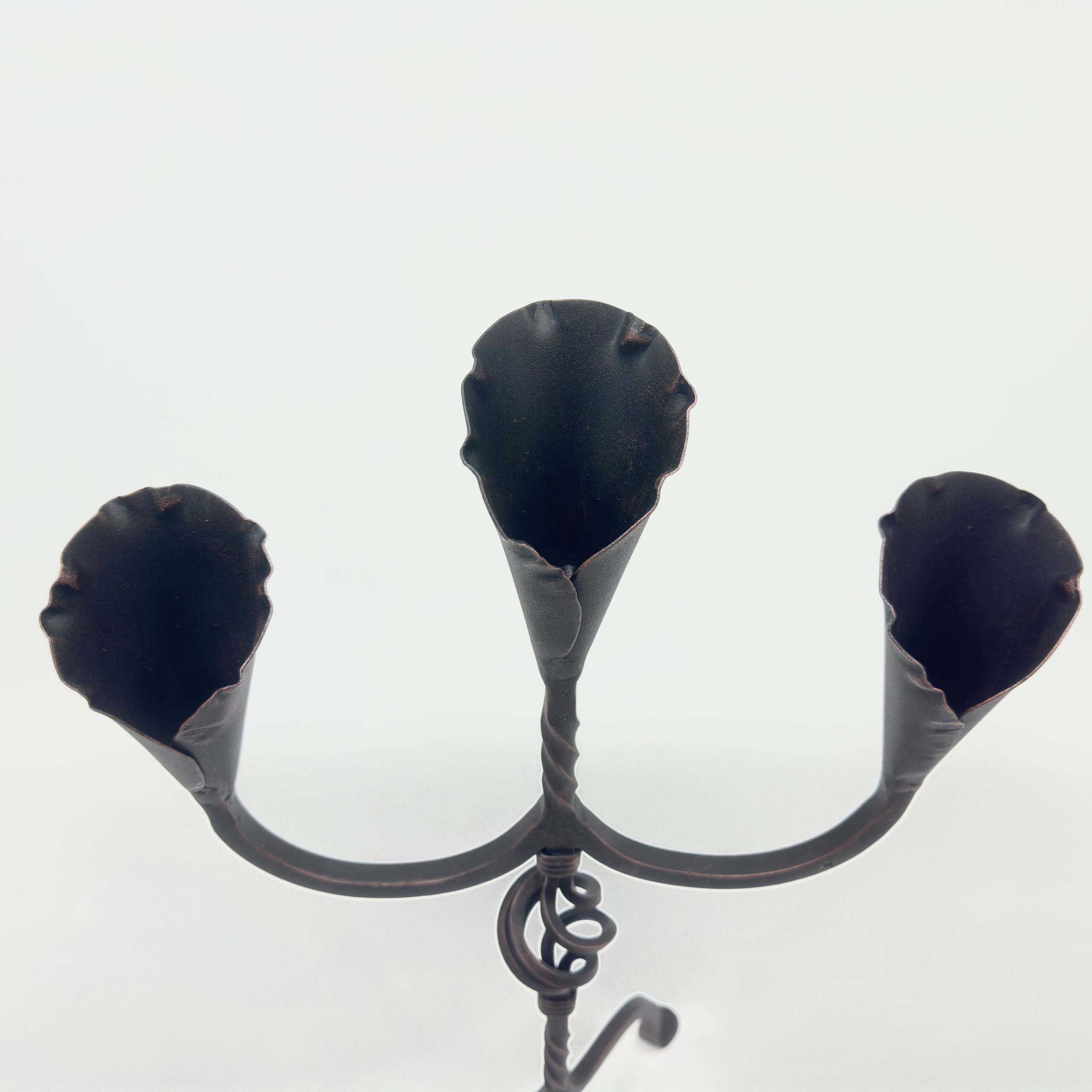 Hand Forged Iron Candelabra 27″ (68cm) Antique Copper Finish 3-Arm Sculptural Tulip Cup Centerpiece