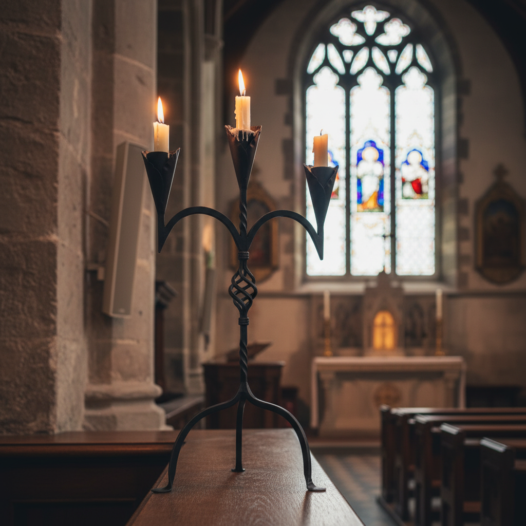 Artistic “Tulip” Cups: The candle holders are not simple plates; they are hand-hammered into the shape of opening tulips. This organic detail softens the heavy iron, adding a touch of romance to the industrial aesthetic.