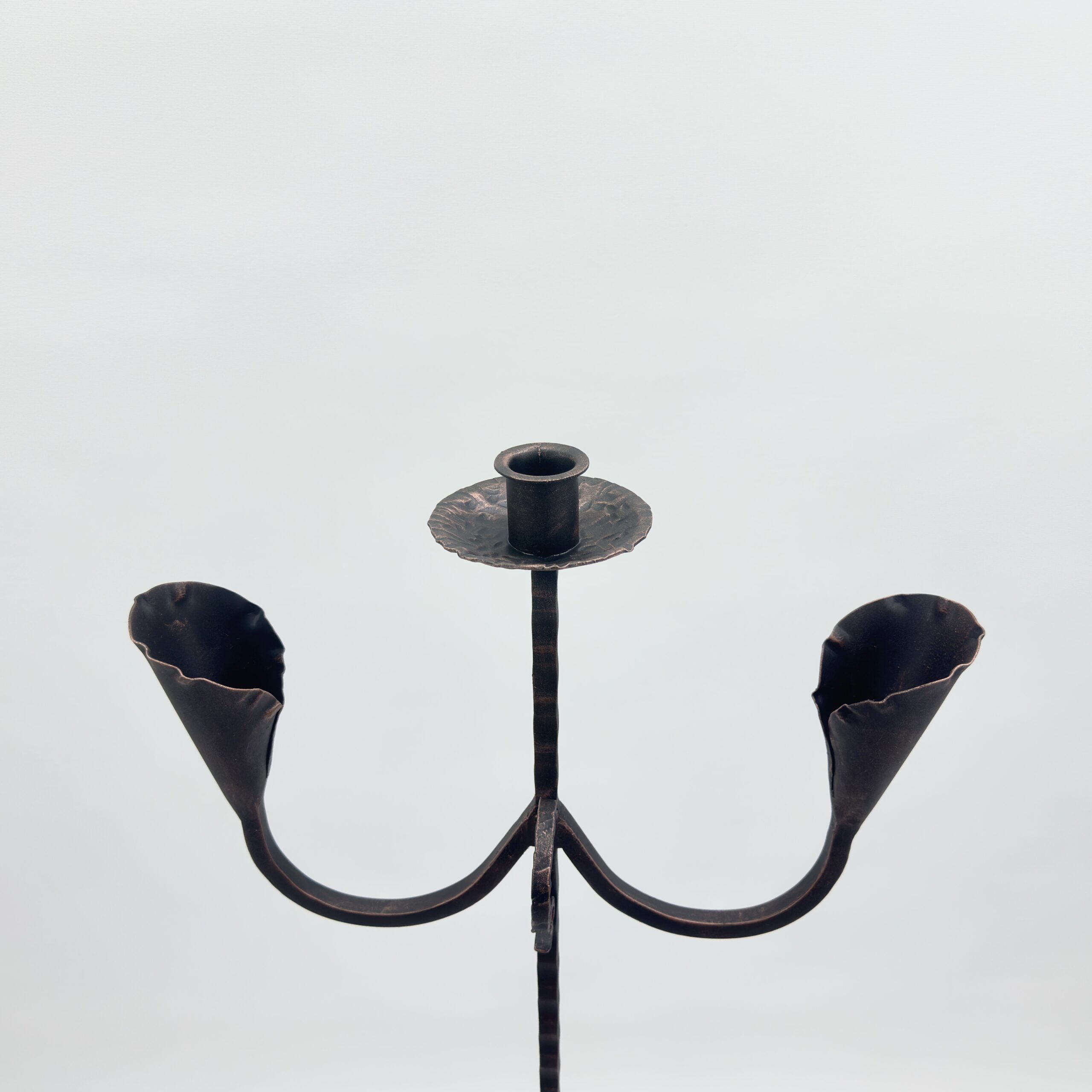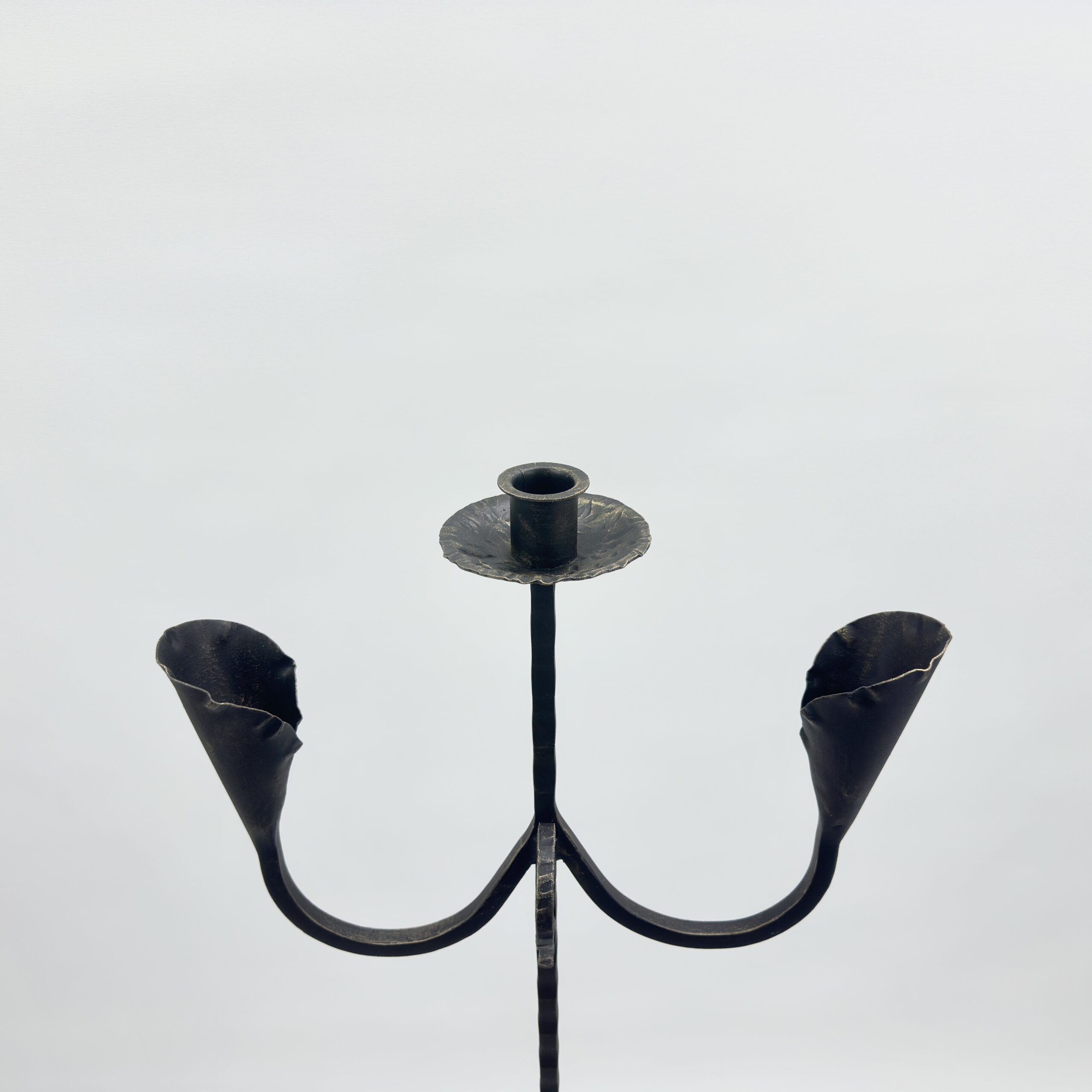 “Calla Lily” Candle Cups: Unlike standard round holders, the candle cups on this piece are hand-hammered into a conical, flower-like shape resembling a Calla Lily or Tulip. This organic form creates a stunning silhouette.