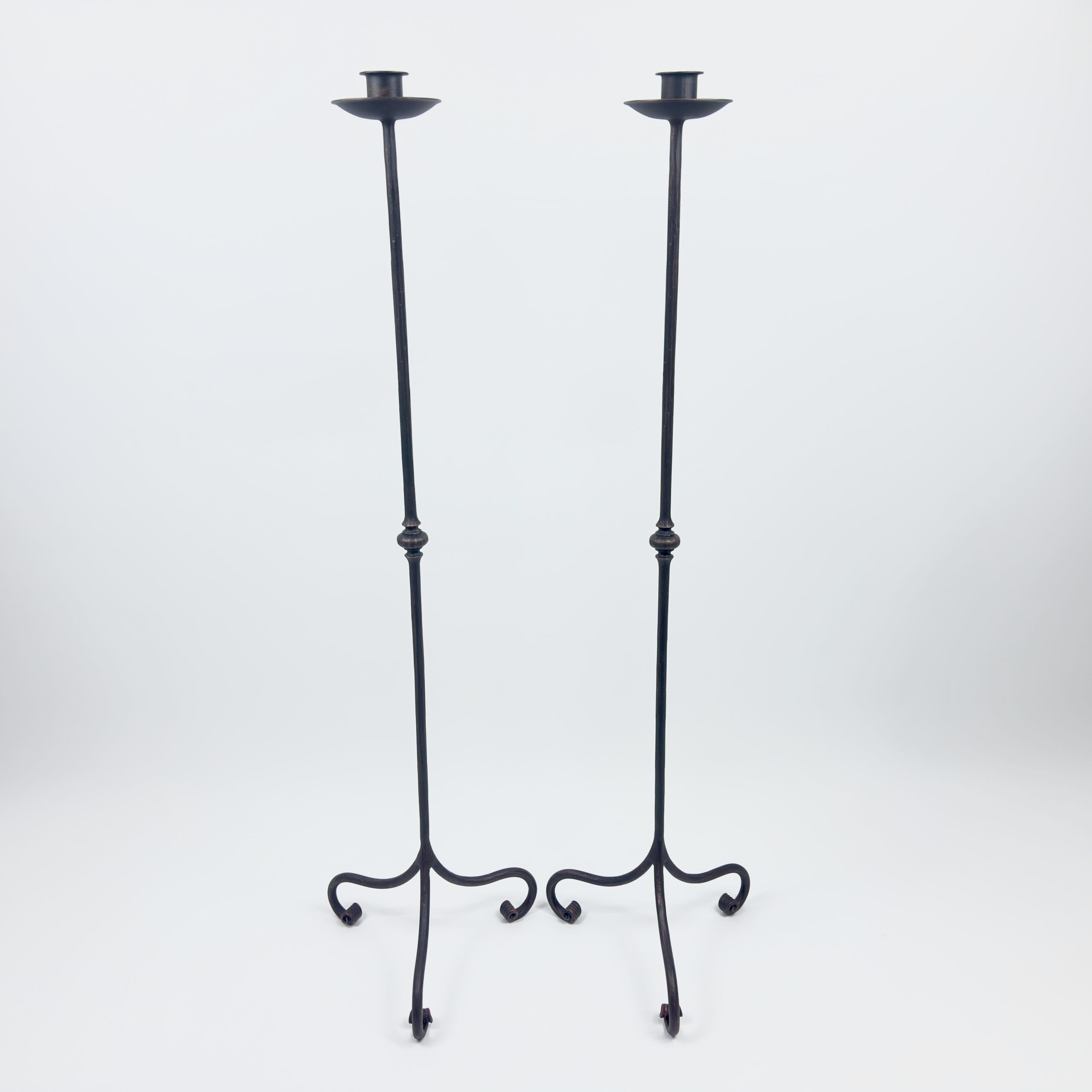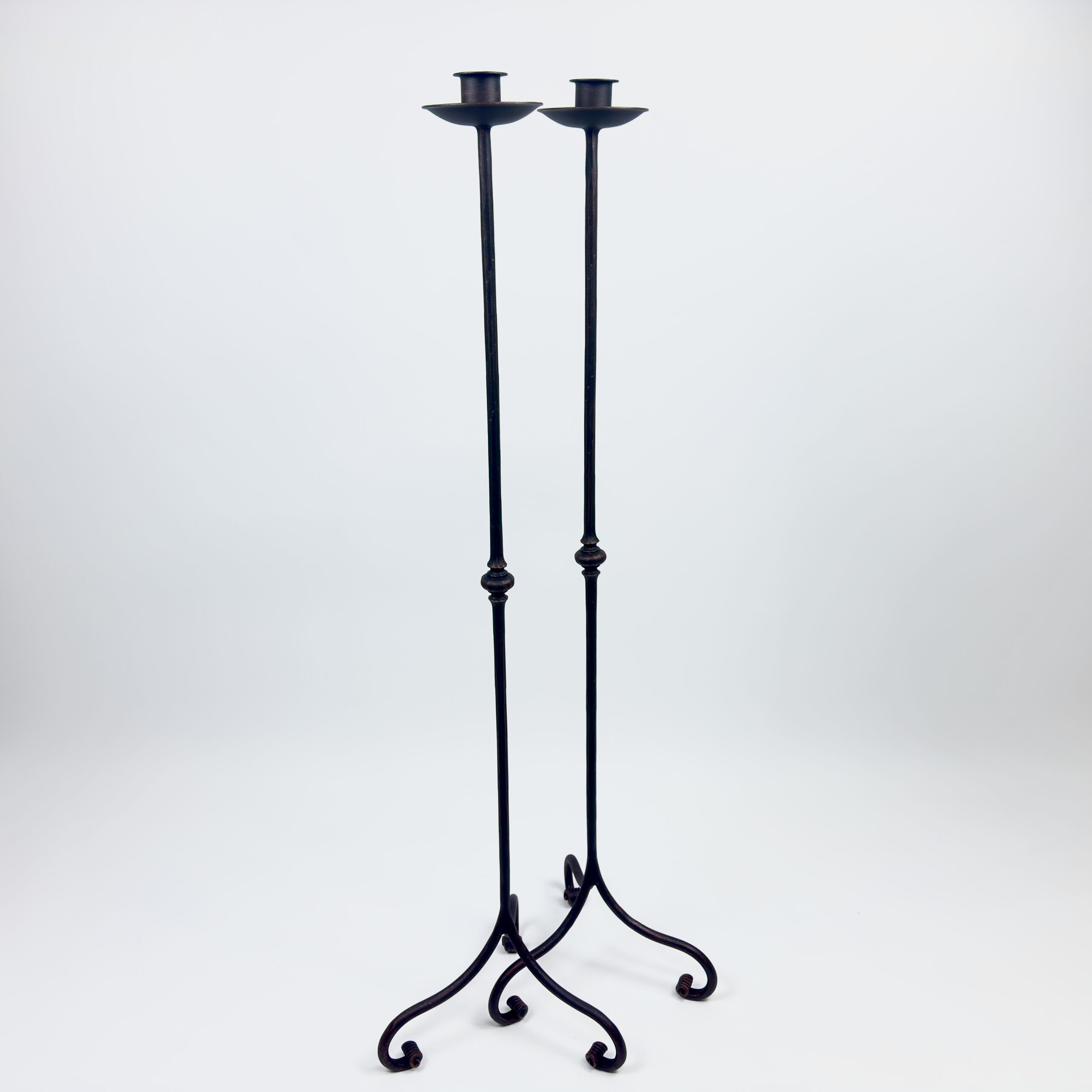 Pure blacksmith artistry. This set of 2 floor-standing candelabras (105cm) features a hand-forged tapered iron stem and a graceful French scroll base.