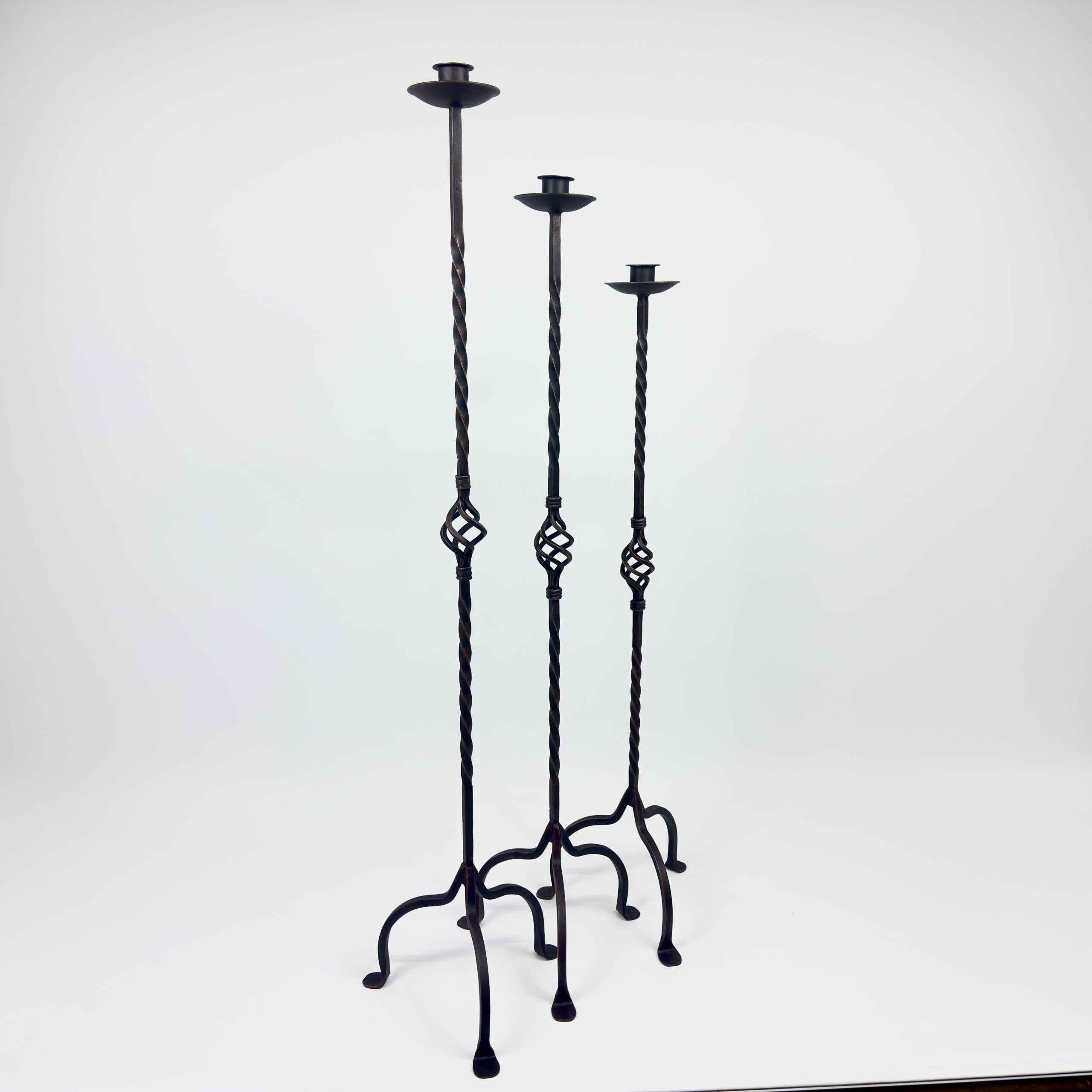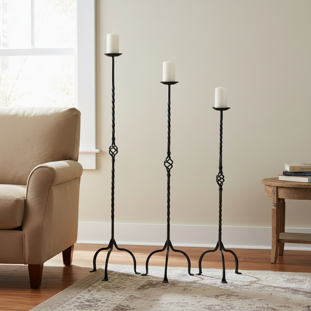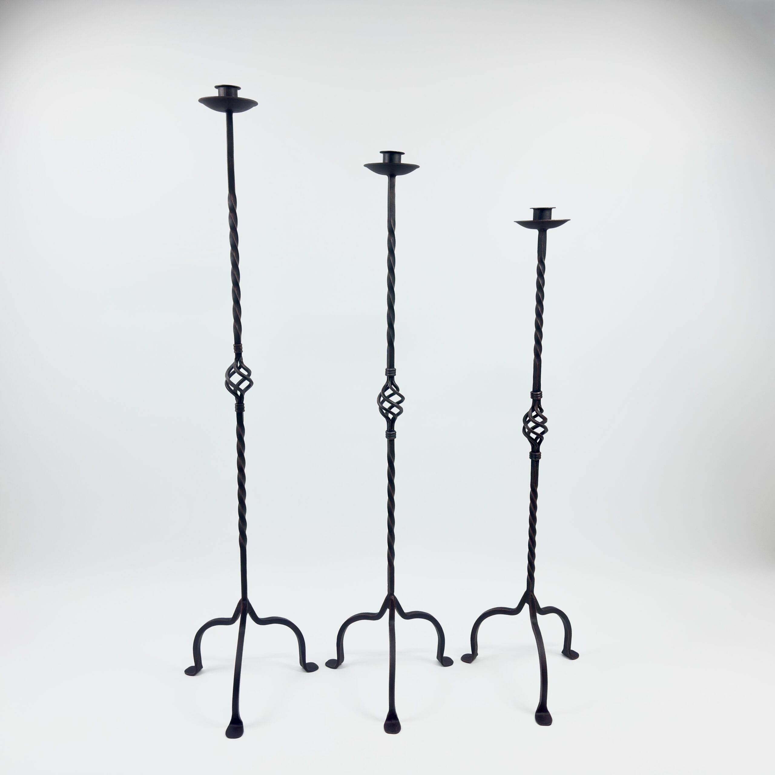 A statement of craftsmanship. This set of 3 floor-standing candelabras (101-121cm) features a heavy rope-twist stem and an intricate openwork iron cage detail, protected by durable electrostatic coating.