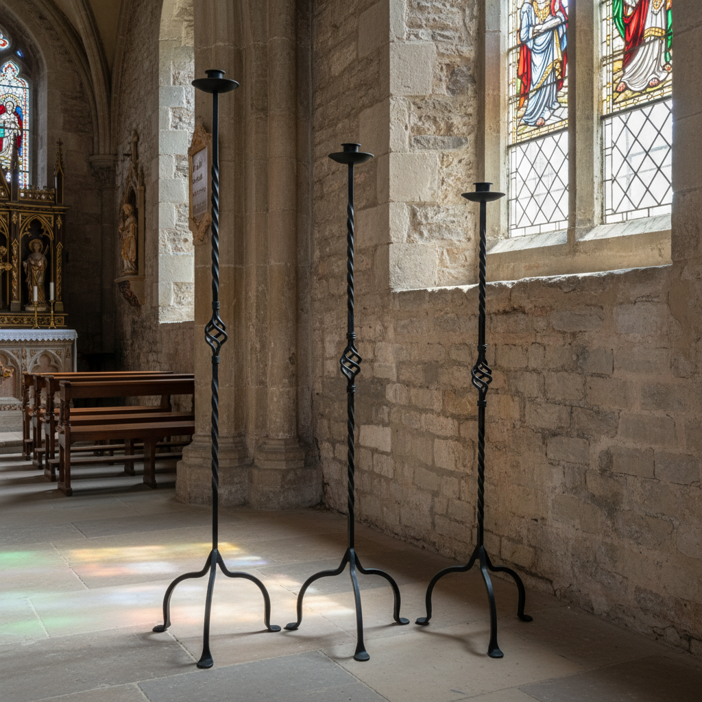The Rope Stem: Moving beyond smooth rods, the stem of this candelabra is forged into a thick rope twist. This “barley twist” texture mimics a heavy cable, giving the stand a robust, castle-like quality that feels substantial and grounded.
