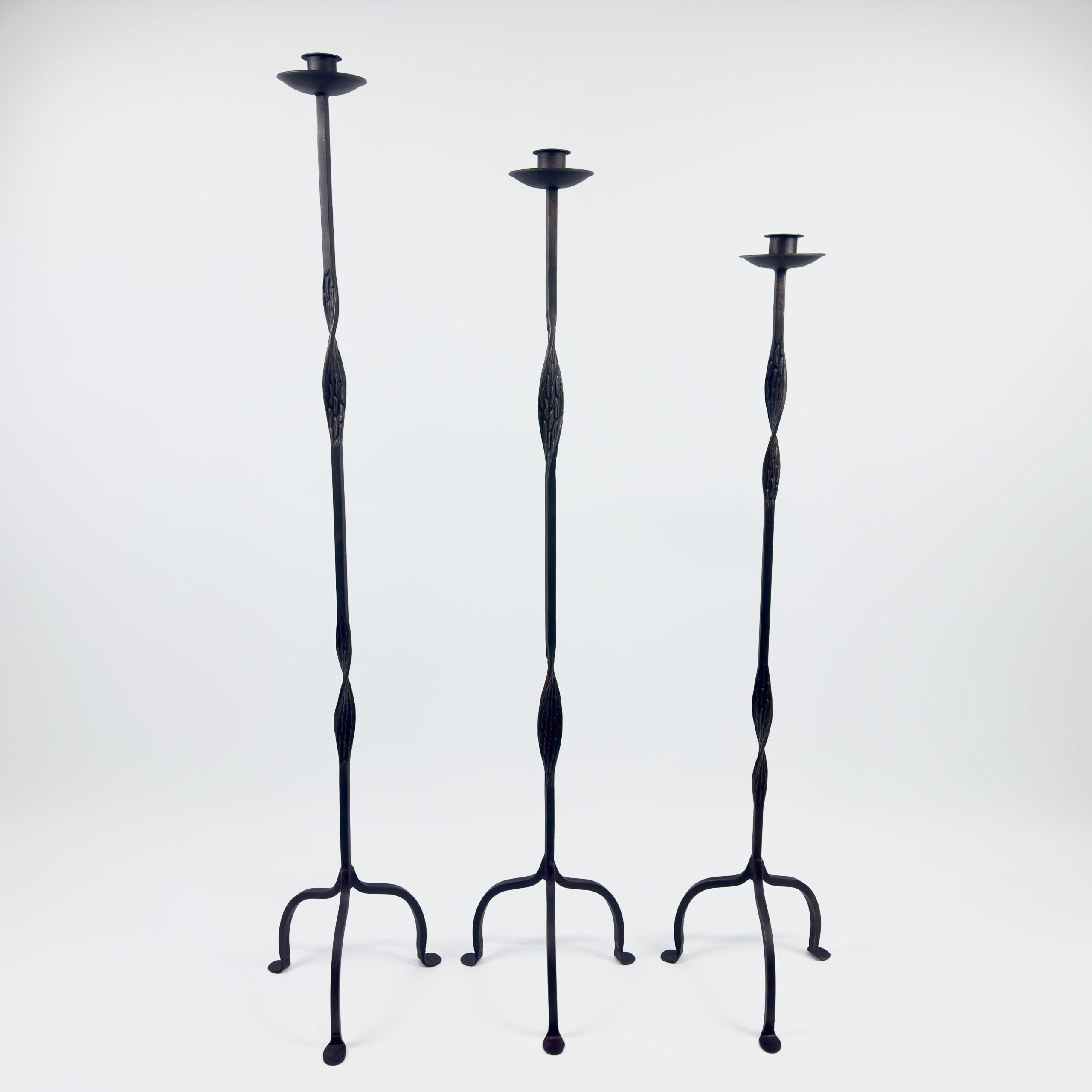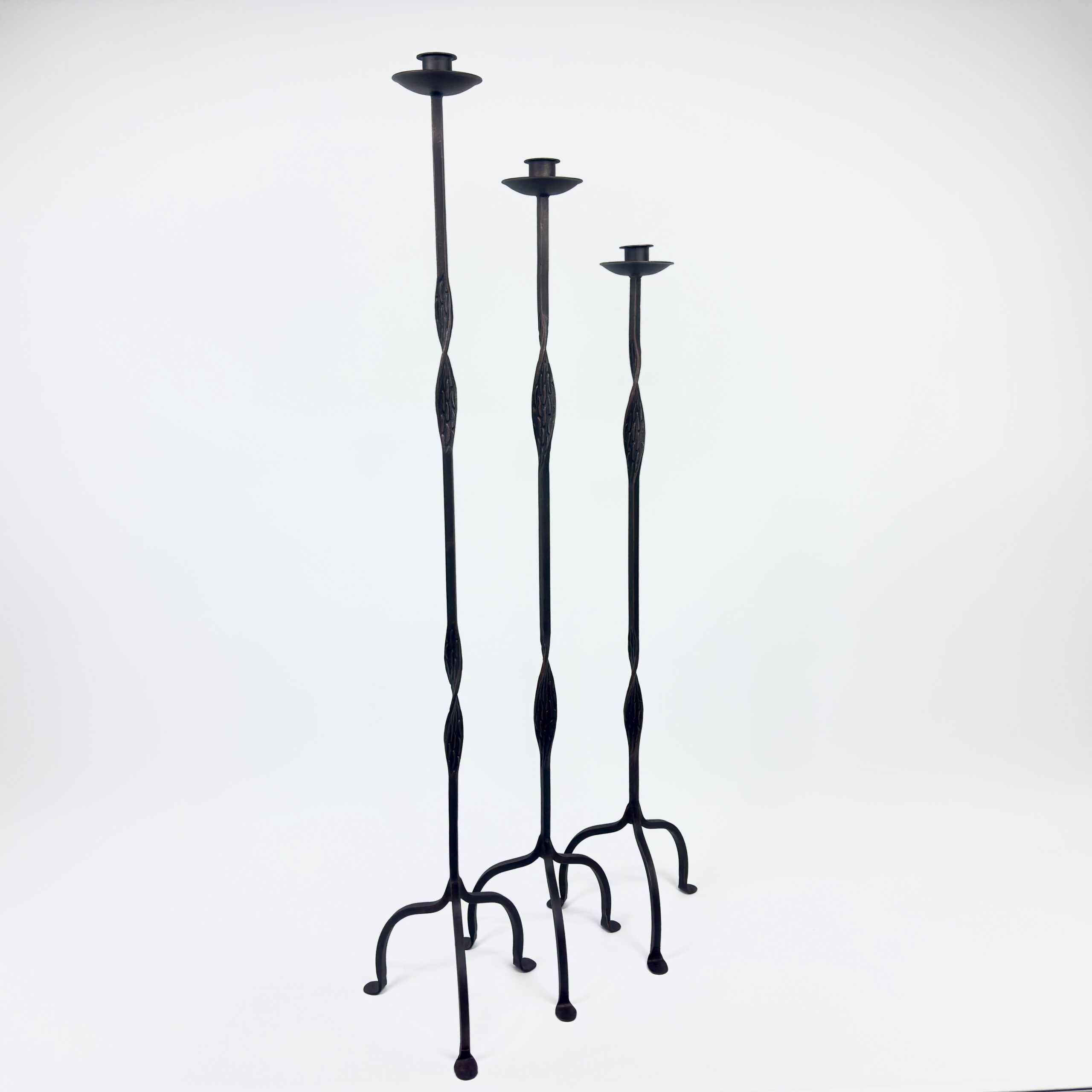 Artistic openwork design. This set of 3 floor-standing candelabras (107-127cm) features a distinctive open-twist iron stem and an elegant arched base, protected by durable electrostatic coating.