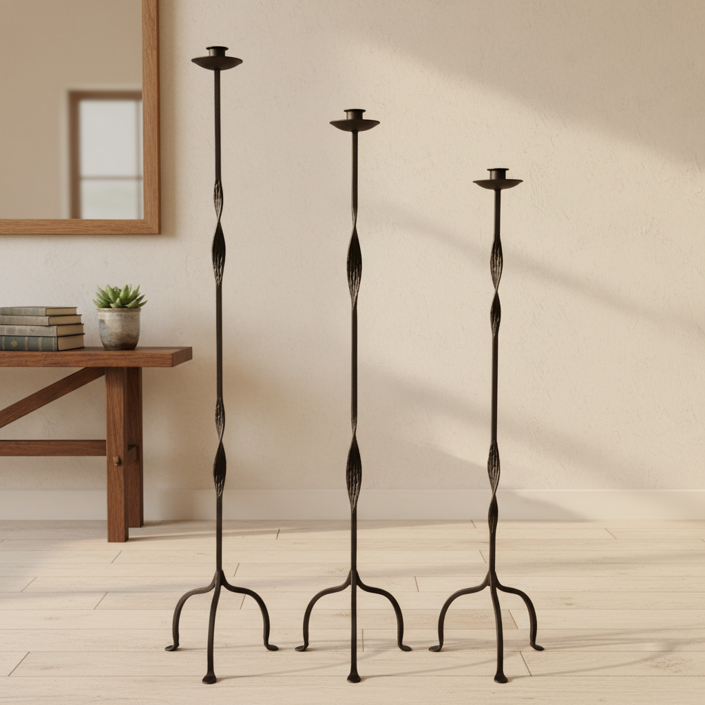 Elevate your interior with a piece of true iron artistry. This Hand-Forged Iron Set (127 cm, 117 cm, 107 cm) distinguishes itself with a unique “Open Twist” technique that transforms solid metal into something light and sculptural.