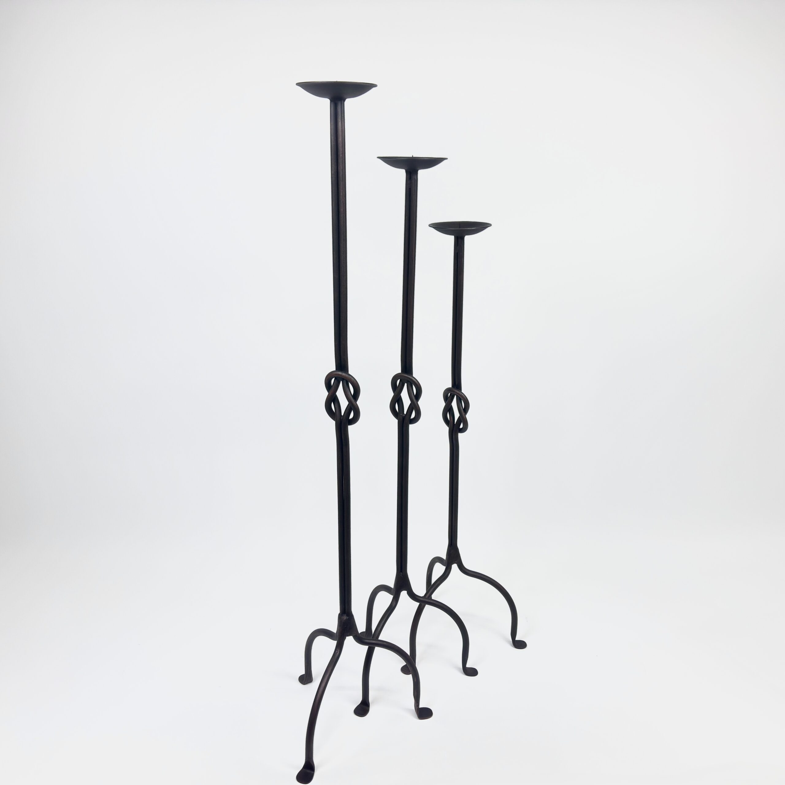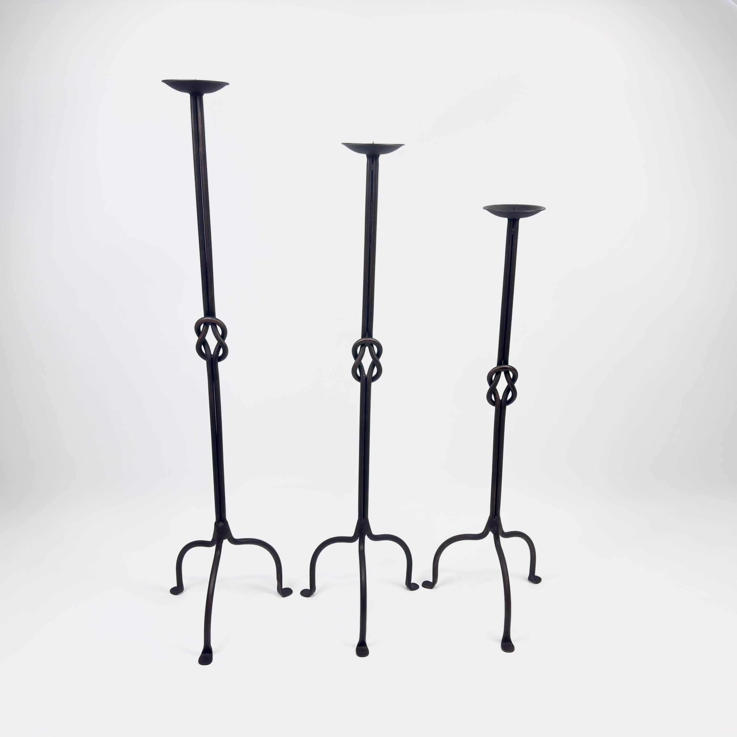 Strength in simplicity. This set of 3 floor-standing candelabras (82-102cm) features a double-rod stem tied in a Hercules Knot, supported by a compact arched base.
