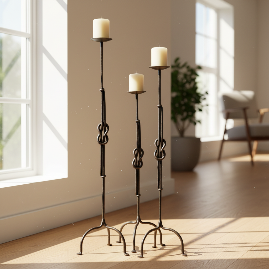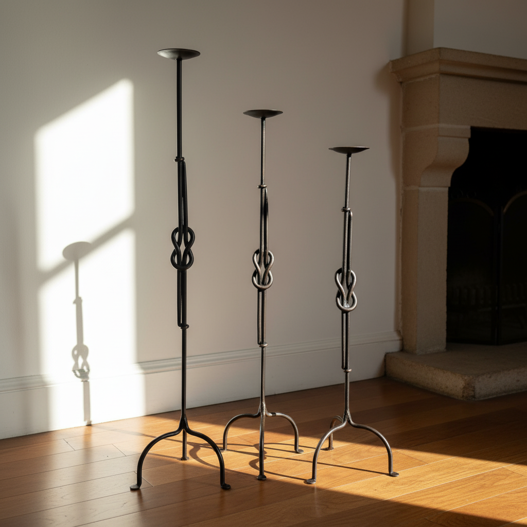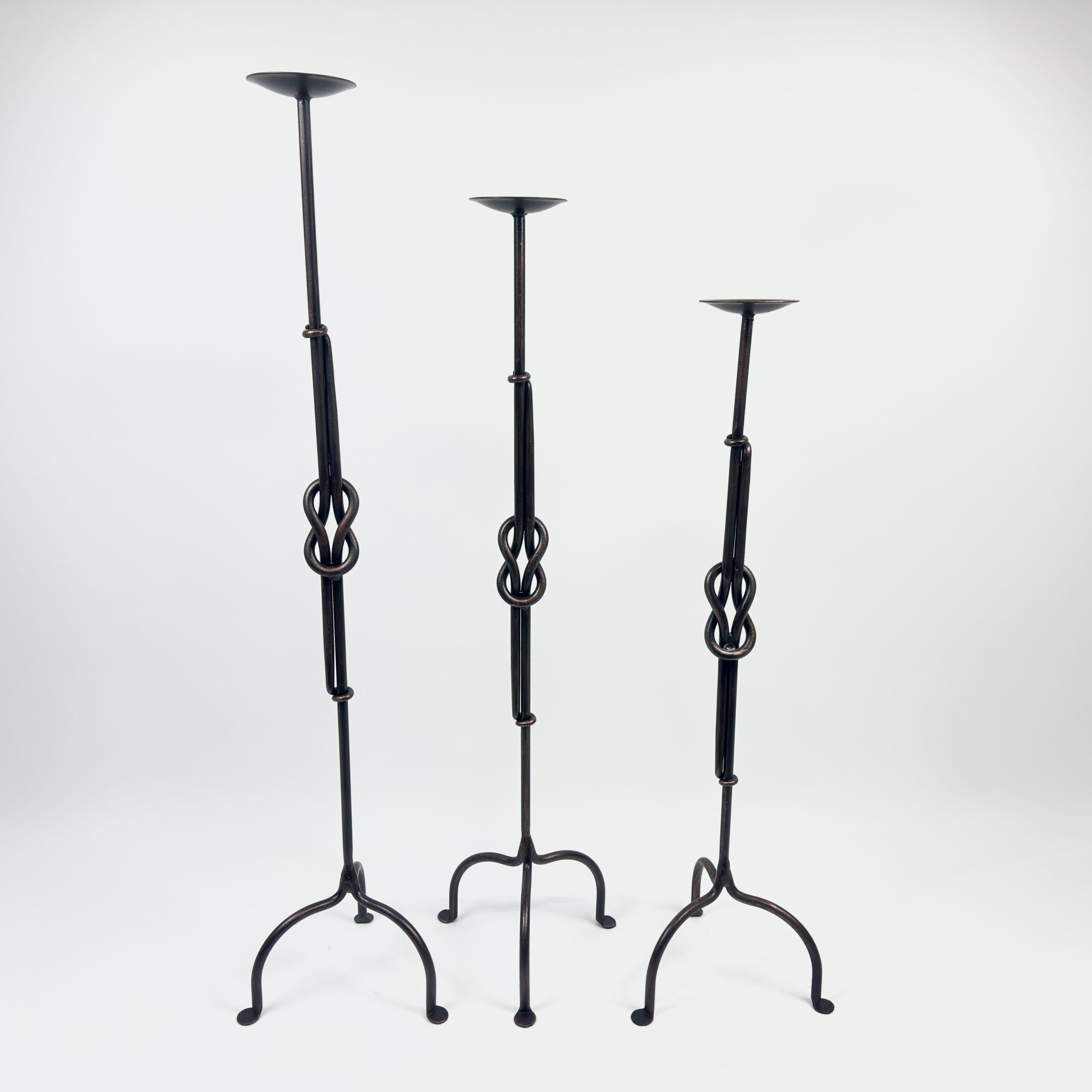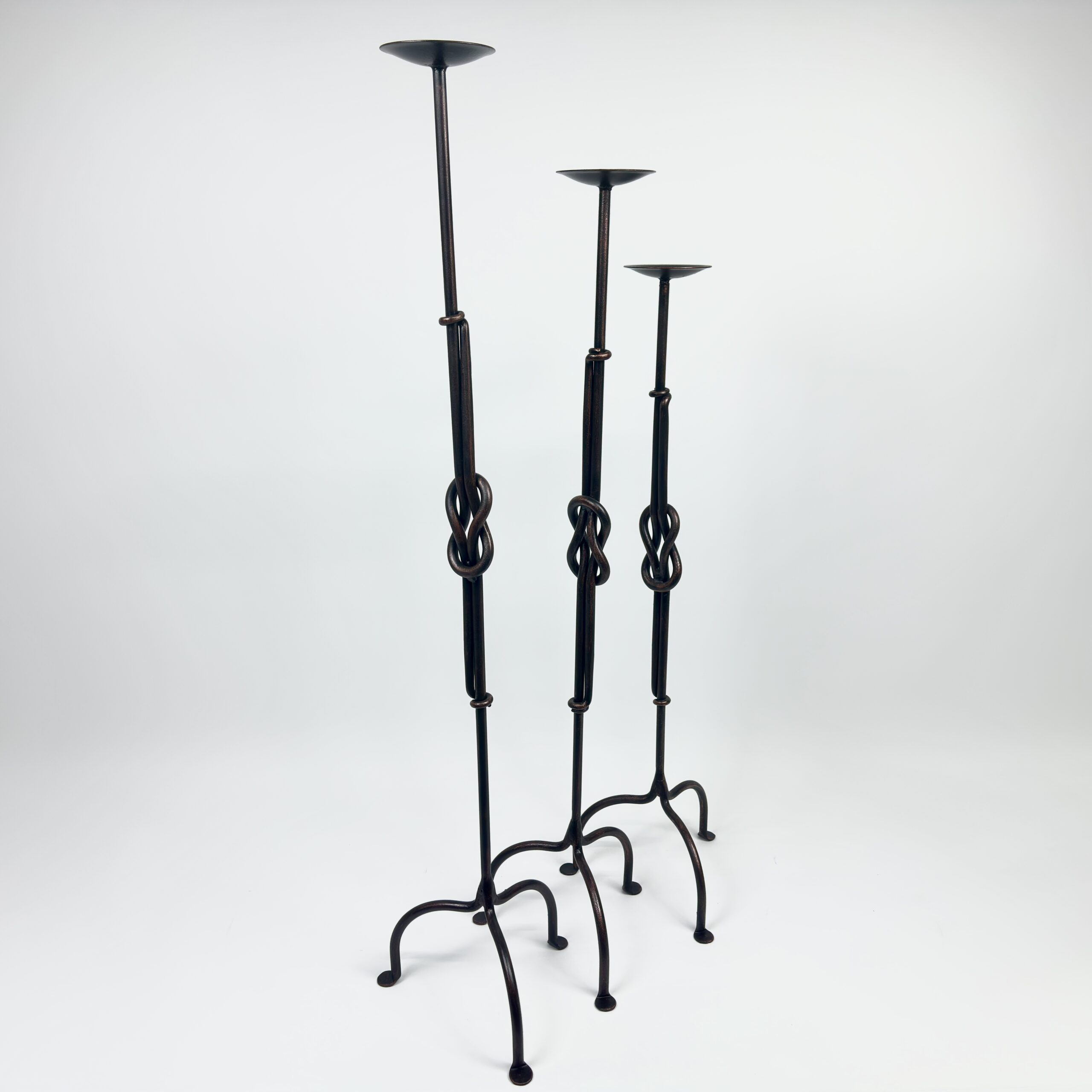 Tall and symbolic. This set of 3 floor-standing candelabras (88-108cm) features a double-rod stem tied in a Hercules Knot, supported by a space-saving arched base.