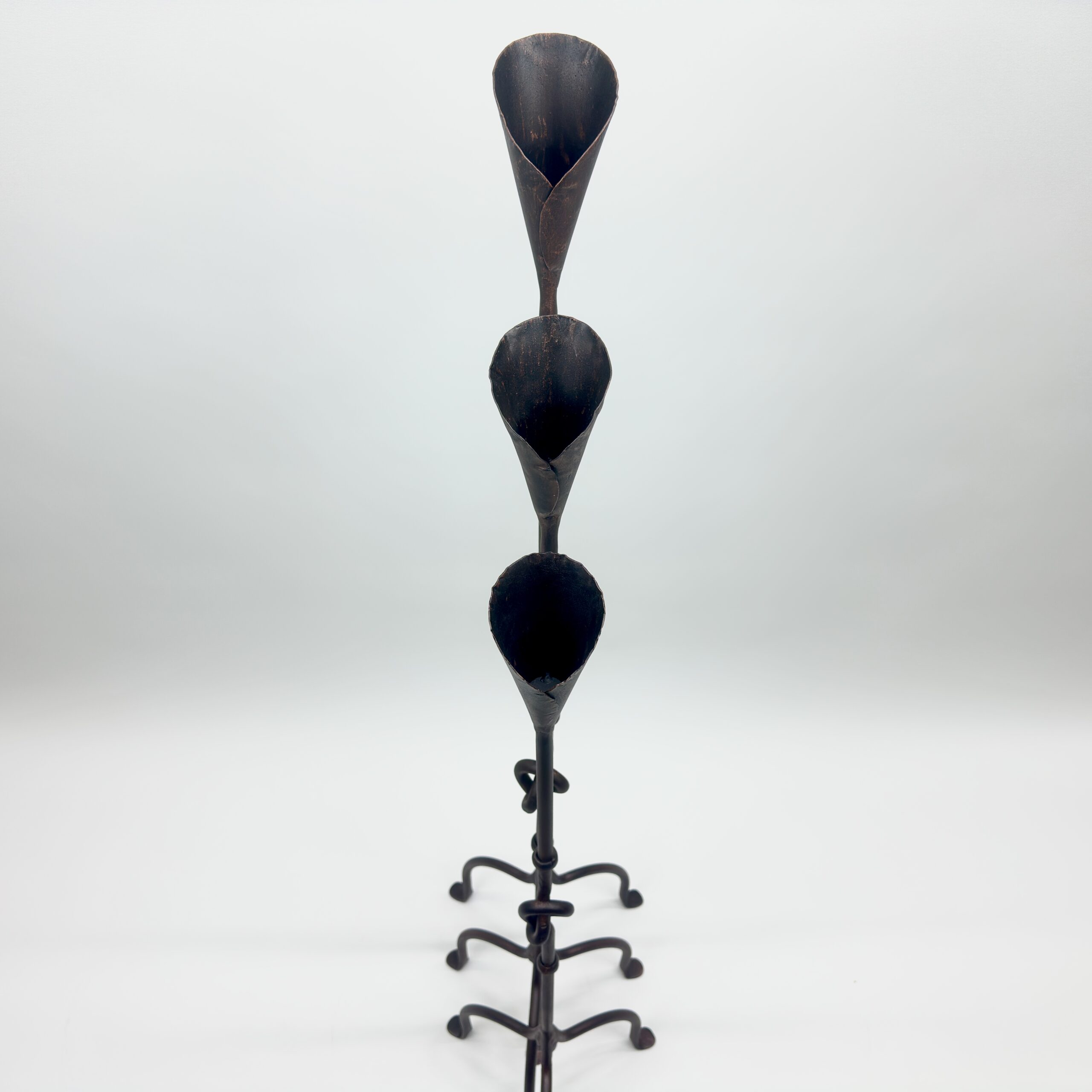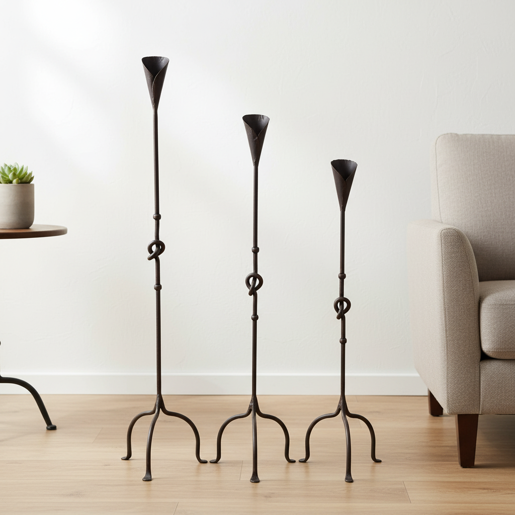 The Conic Cup: The top of each stand flares out into a hand-forged conic cup. This deep, funnel-like vessel is not just a holder; it’s a design statement that frames the candle beautifully.