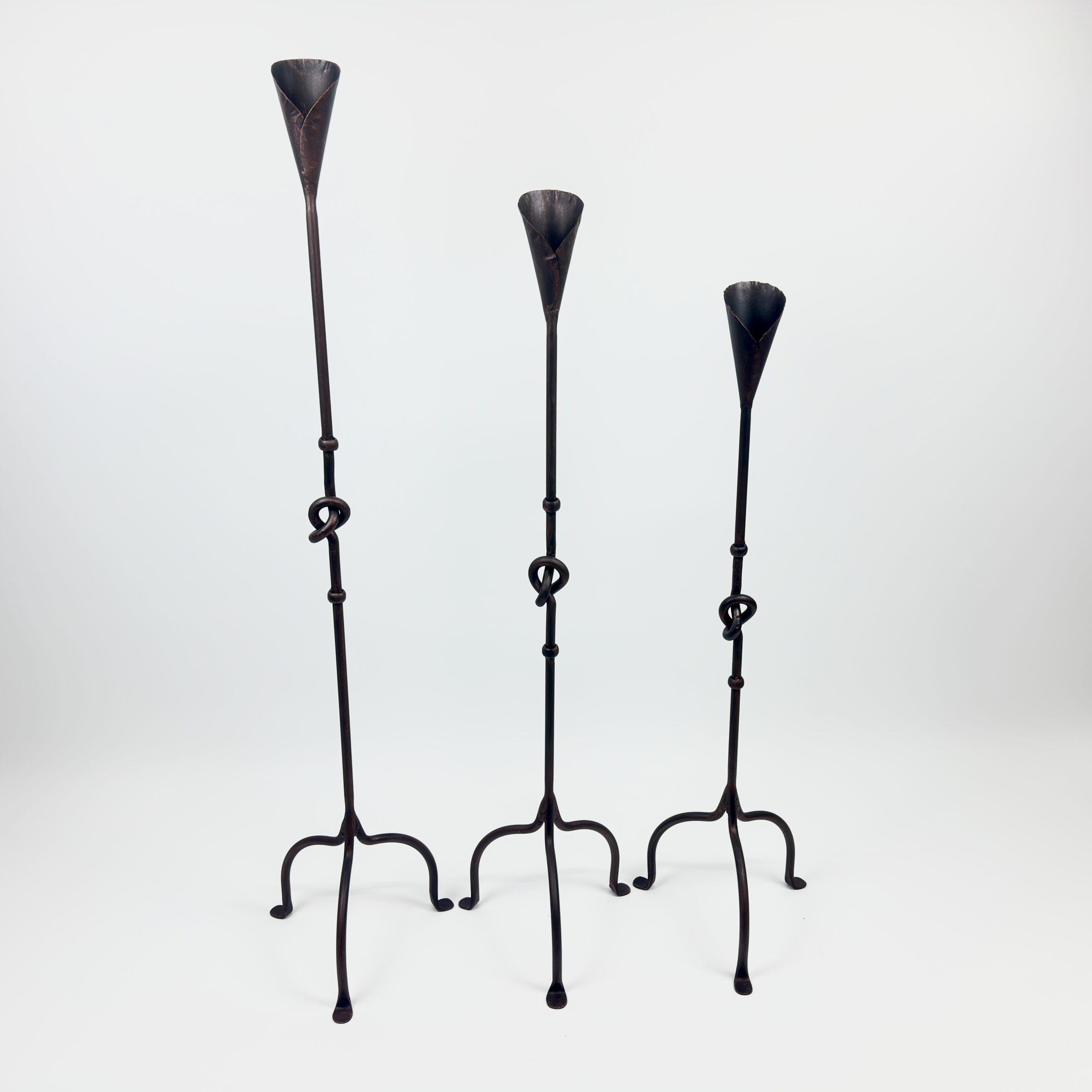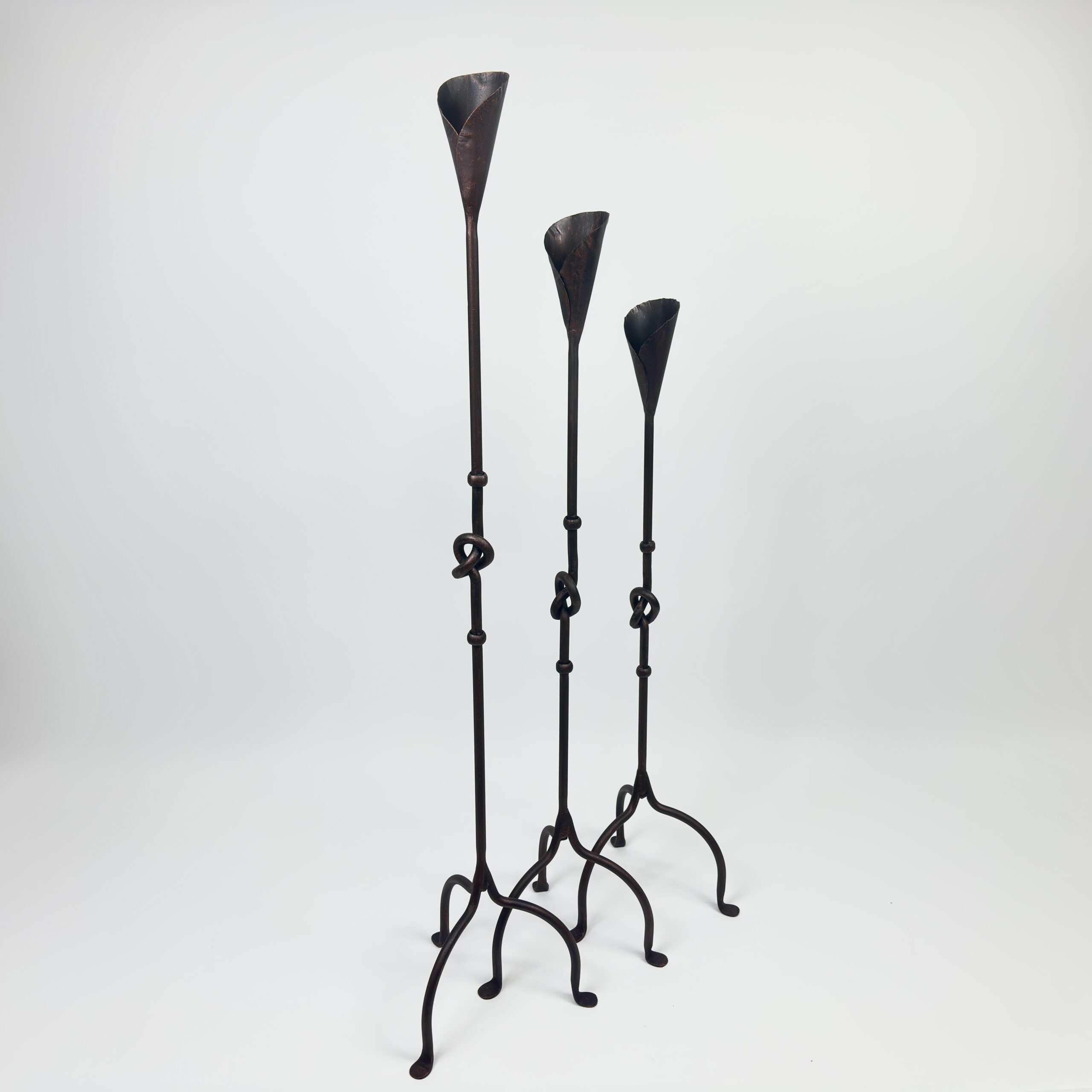 Hand Forged Iron Candelabra Set of 3 (90-110cm) Antique Copper Finish Knotted Stem with Conic Cup