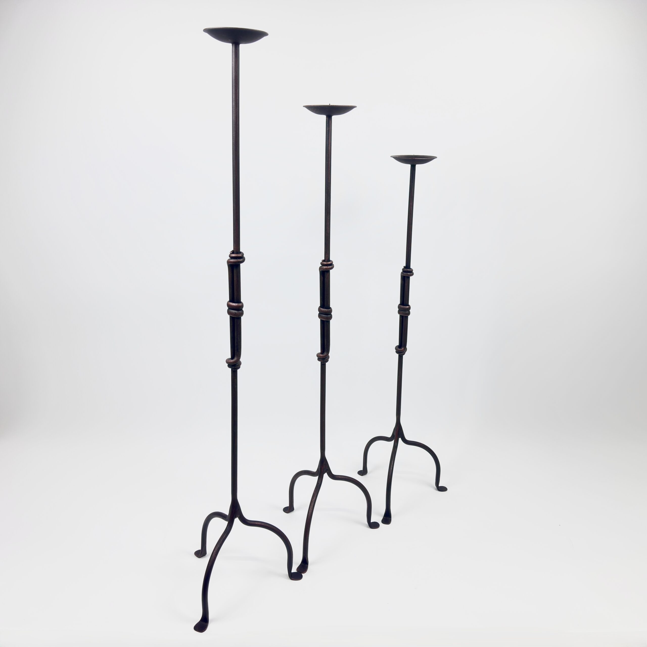Hand Forged Iron Candelabra Set of 3 (90-110cm) Antique Copper Finish Segmented Ring Node Floor Set
