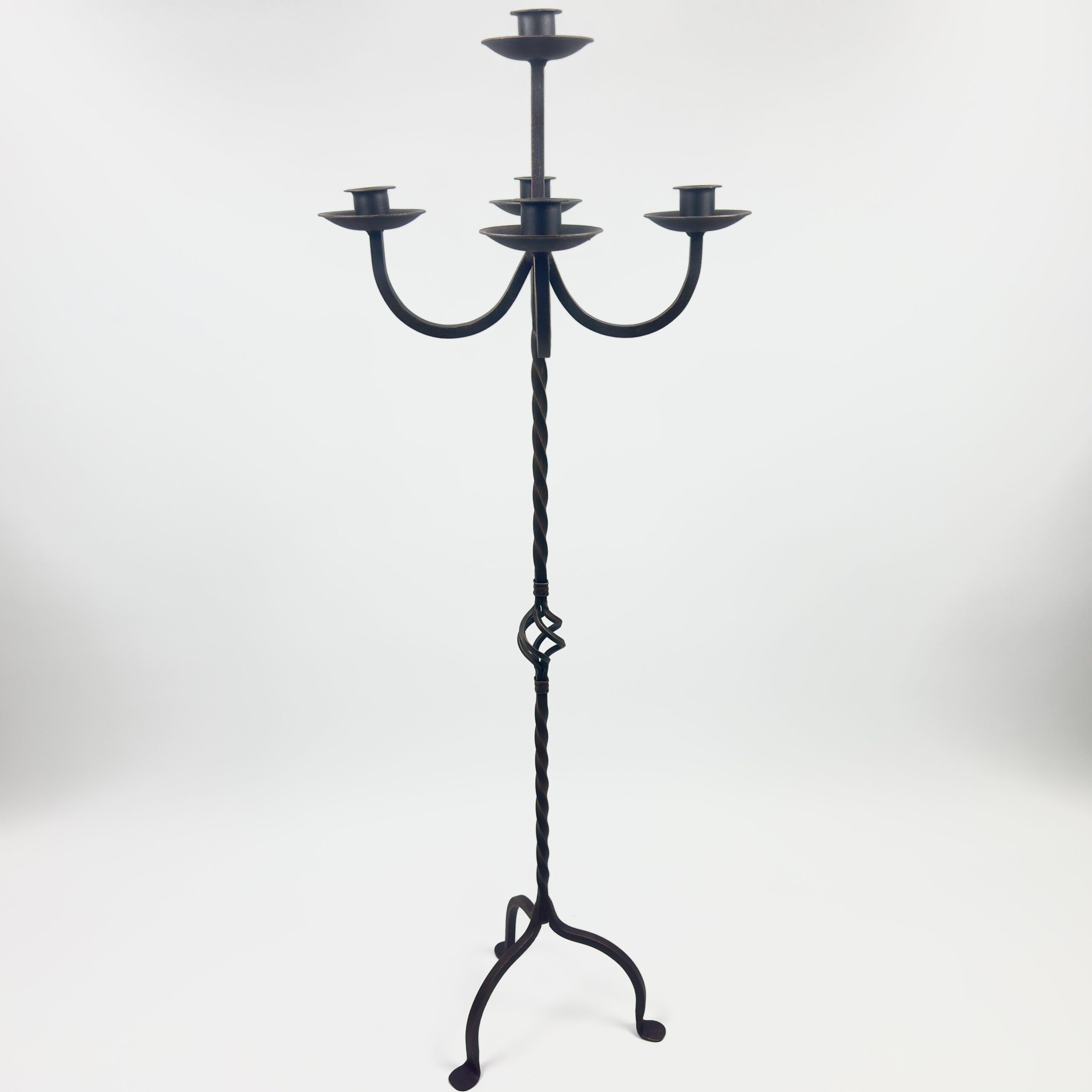 Bring a sense of permanence and warmth to your decor with this Hand-Forged Wrought Iron Floor Candelabra. Standing at 121 cm (47.5 inches) with a broad 43 cm (17 inch) base, this model is built for those who value both aesthetics and physical stability.