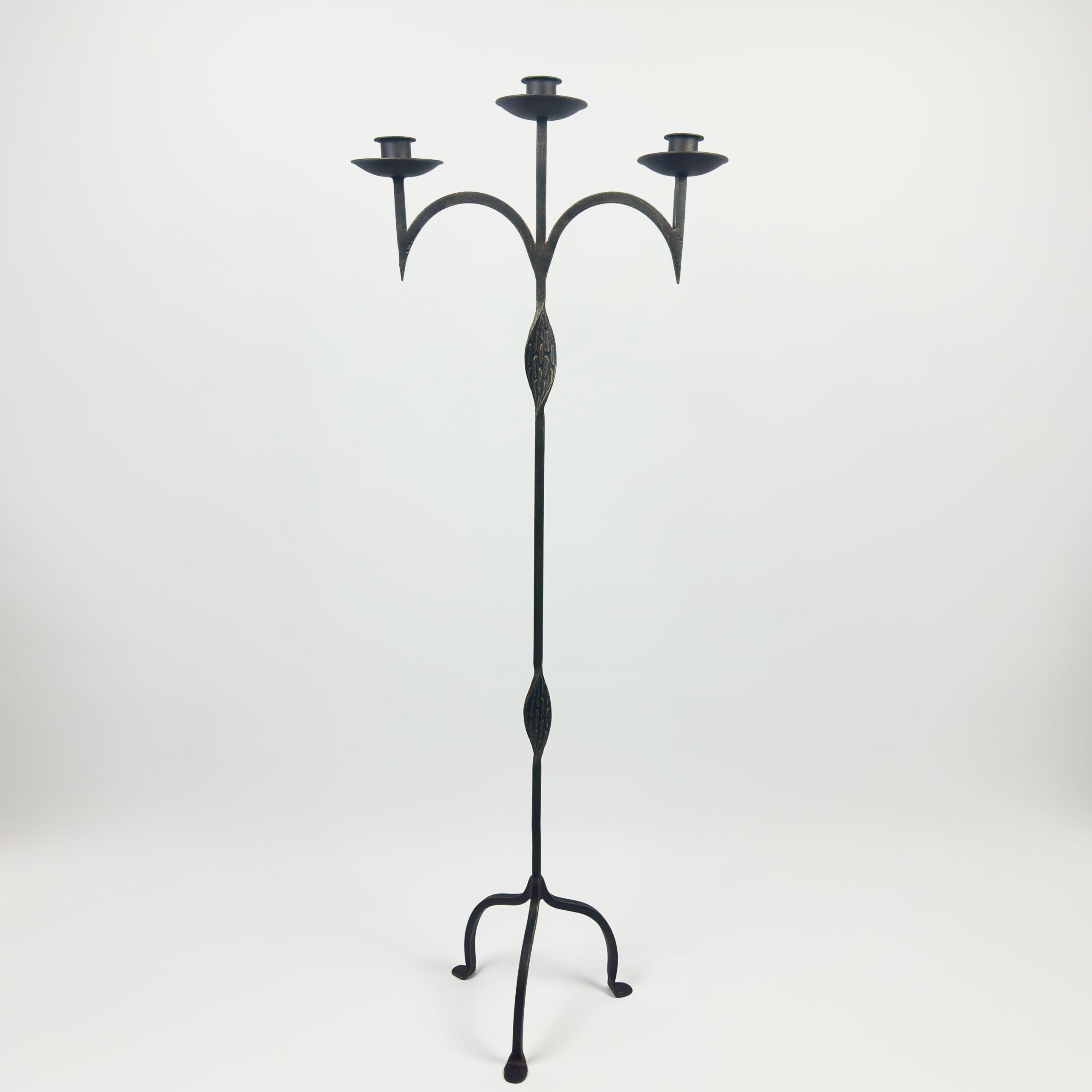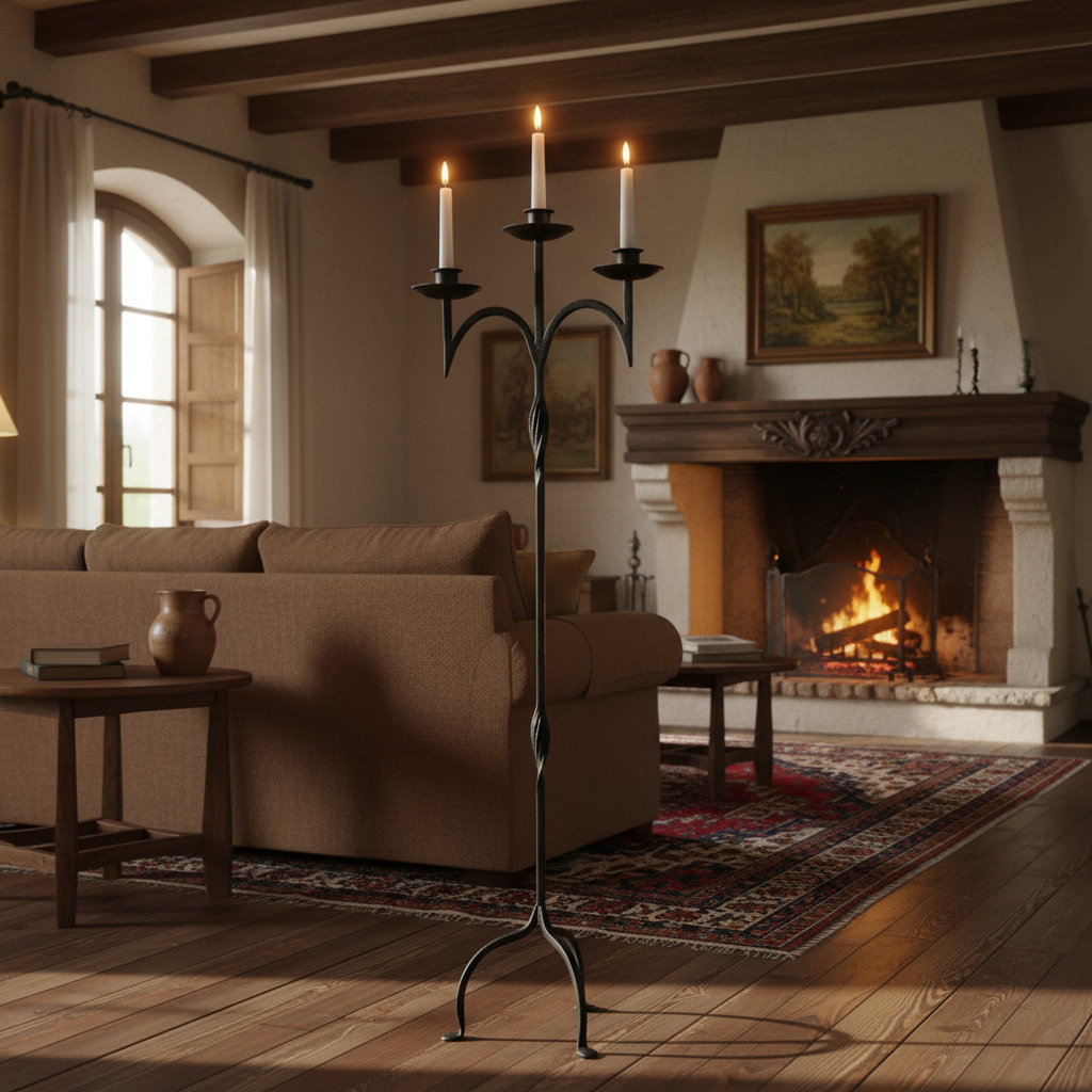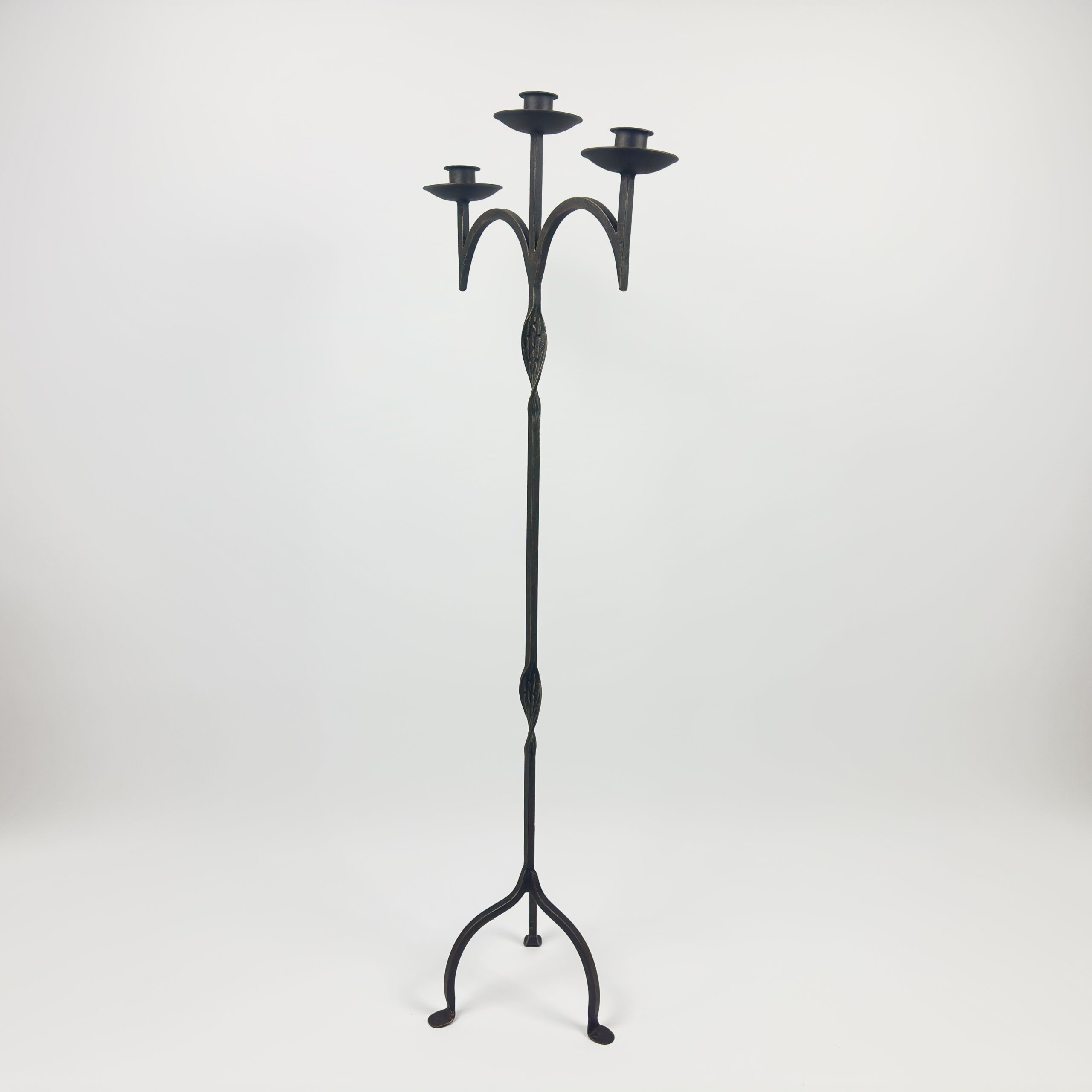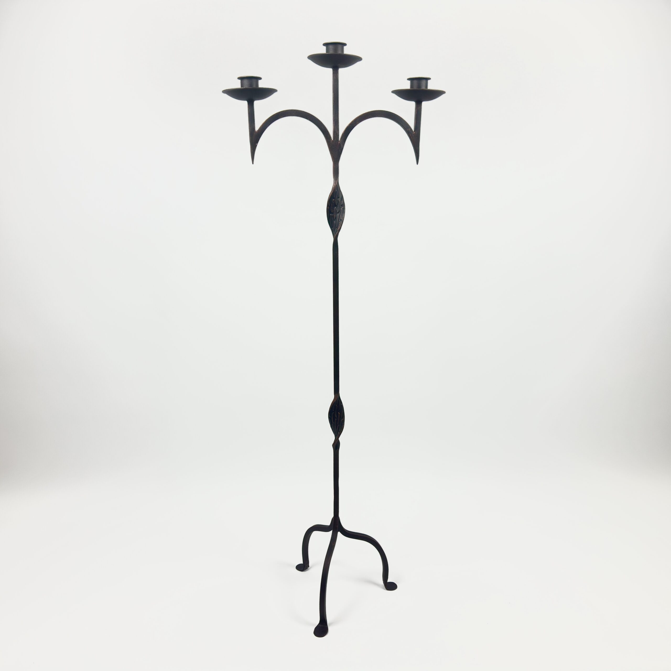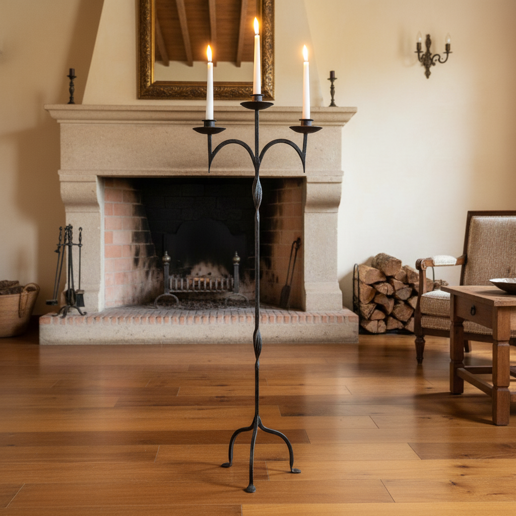 Bring the beauty of nature indoors with this Hand-Forged Wrought Iron Floor Candelabra. Standing at 121 cm (47.5 inches), this model departs from traditional twisted designs, offering a sleek silhouette highlighted by a masterful Leaf Detail.