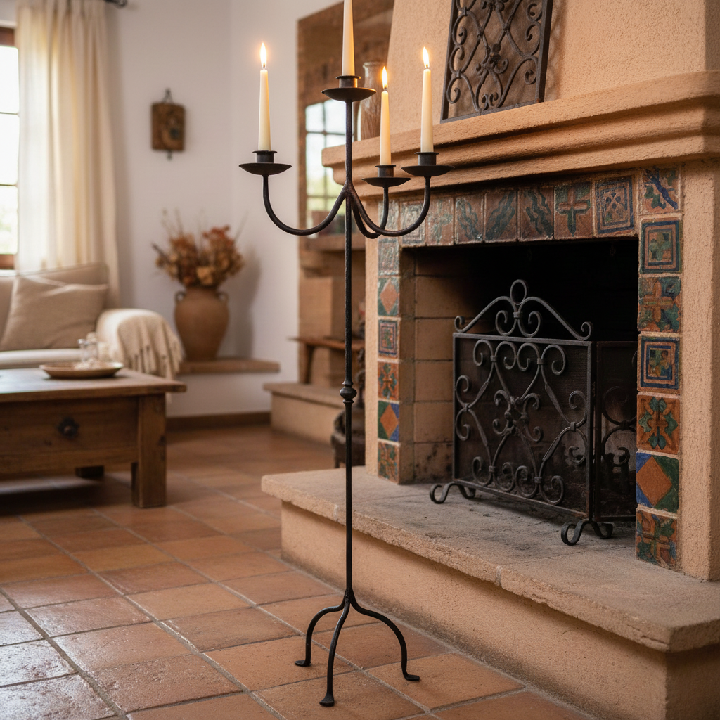 Illuminate your space with this 48.5-inch (123cm) hand-forged floor candelabra. Features a classic twisted stem, elegant curved arms, and your choice of Antique Copper or Antique Gold finish. Durable and timeless. 100% Handmade.