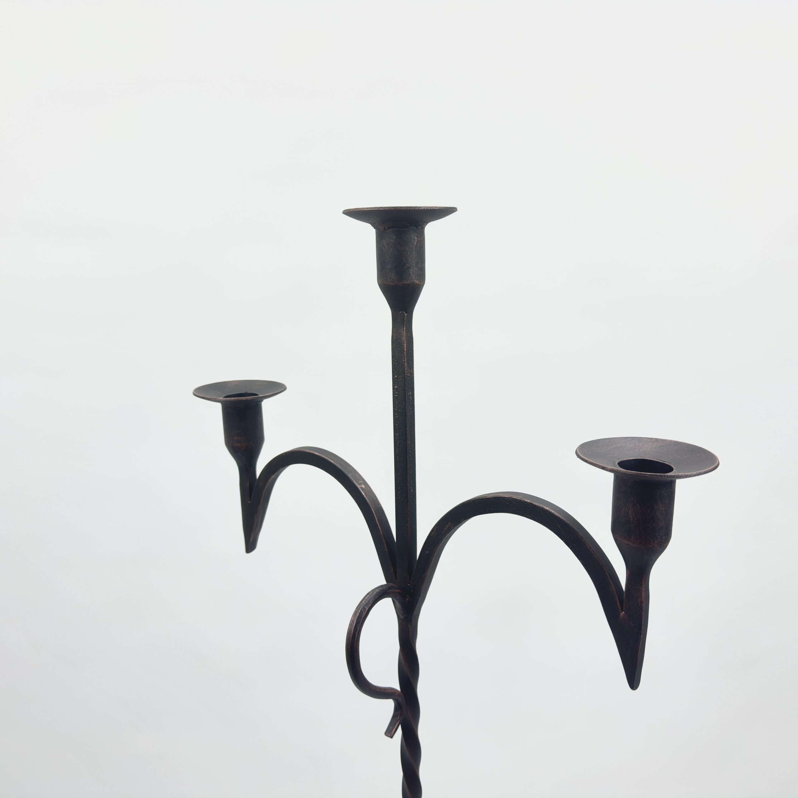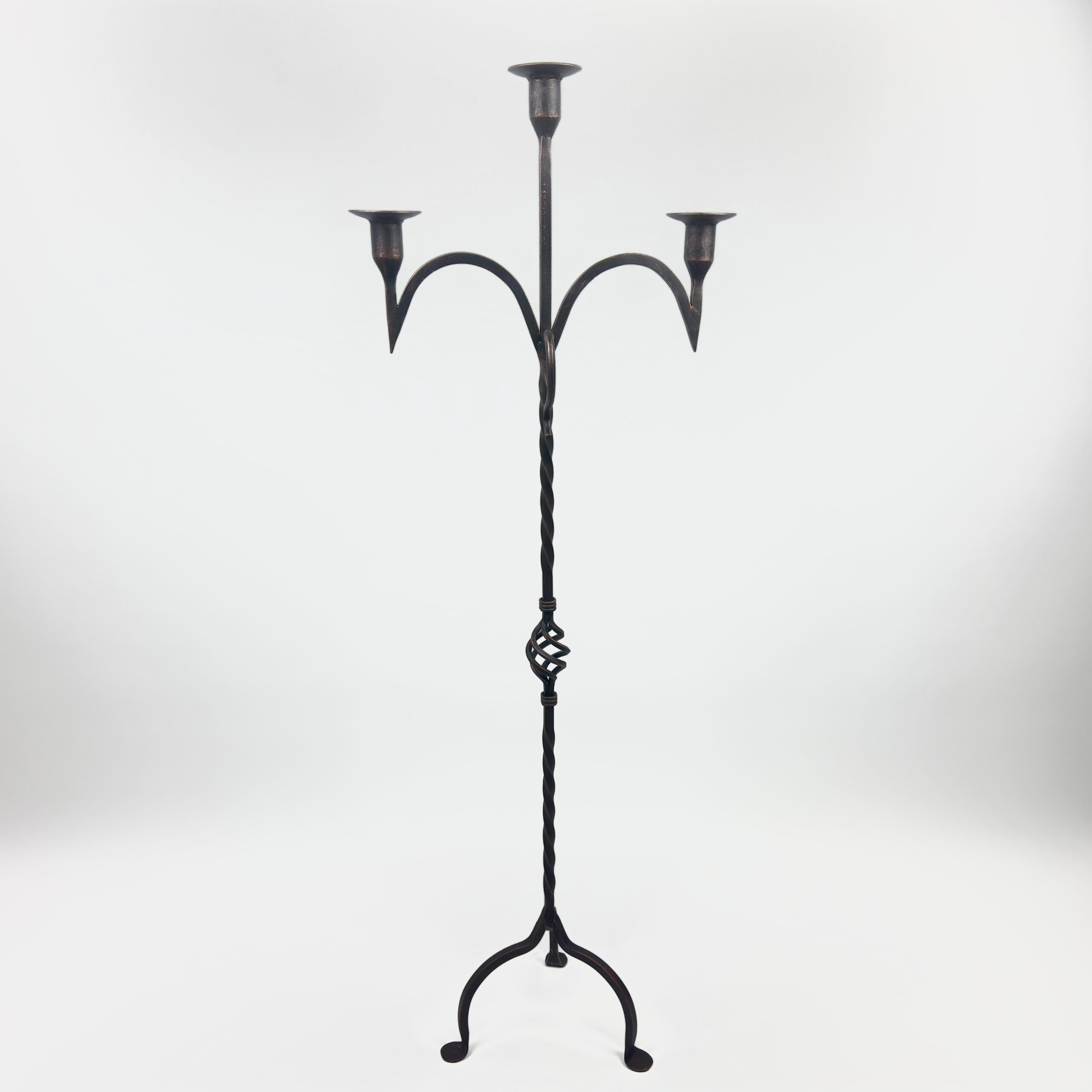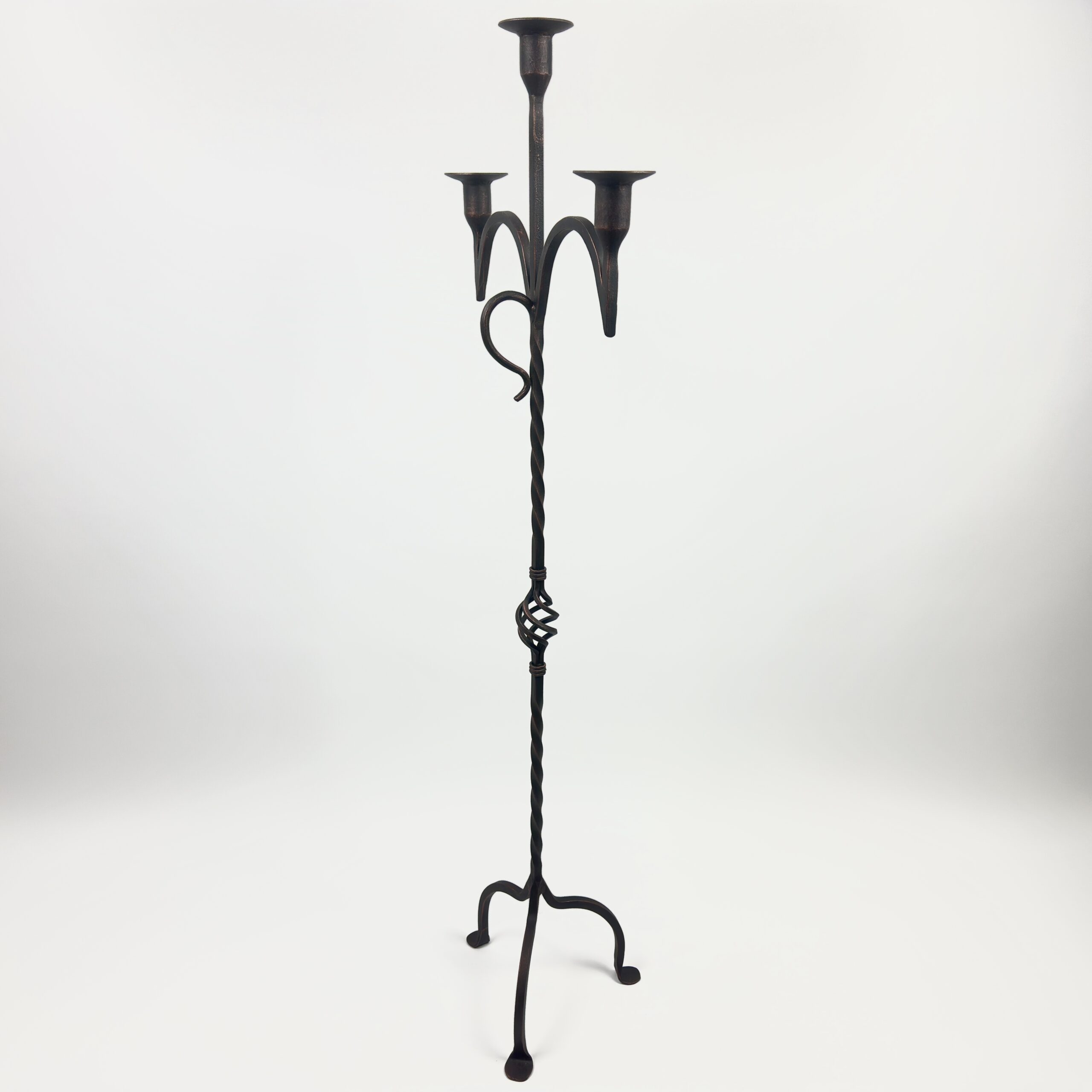 Hand Forged Iron Floor Candelabra 50.5″ (128cm) Antique Copper Patina 3-Arm Twist & Scroll Design Rustic Wedding Decor
