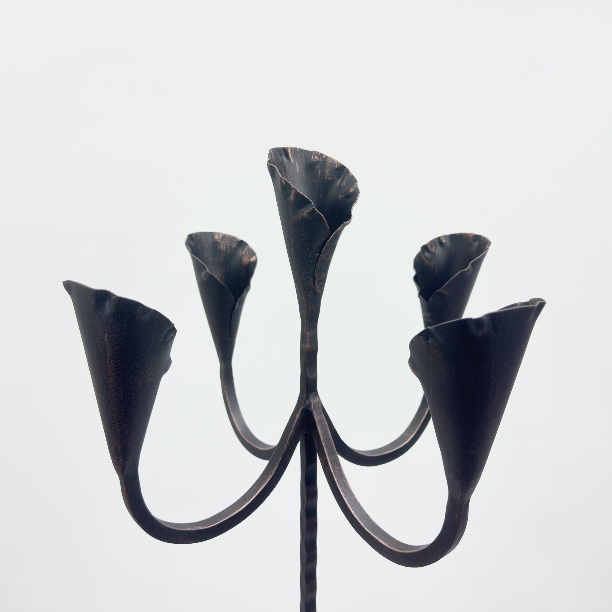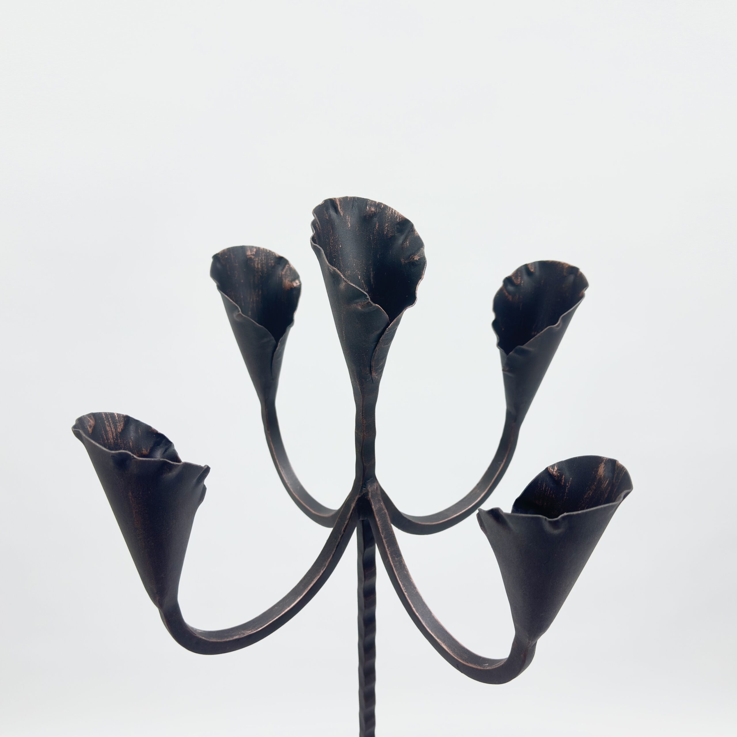 The “Lily” Cups: Unlike standard round holders, each of the 5 candle cups is hand-hammered into a conical, petal-like shape resembling a Calla Lily or Tulip. When lit, the candles look like the stamens of a blooming flower.