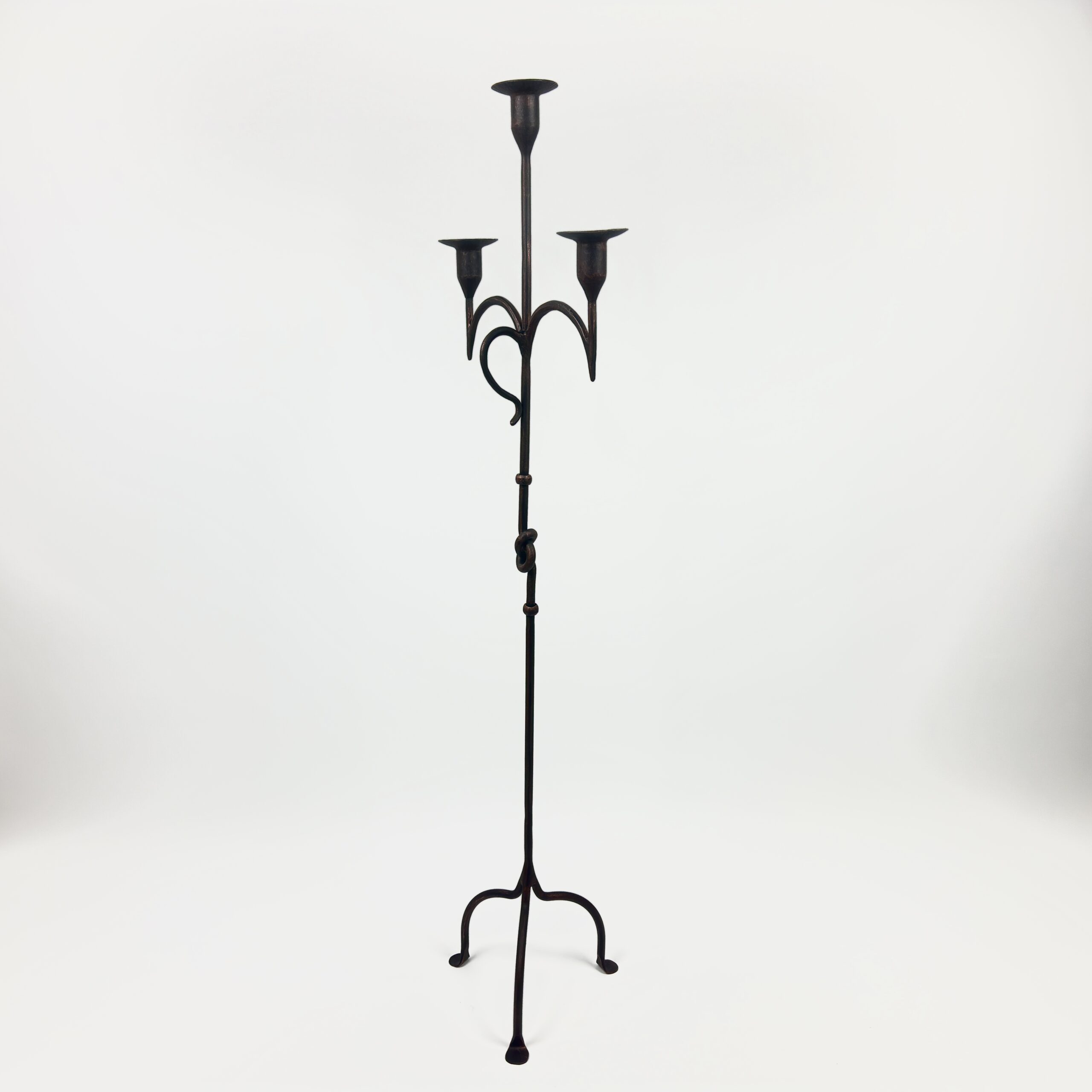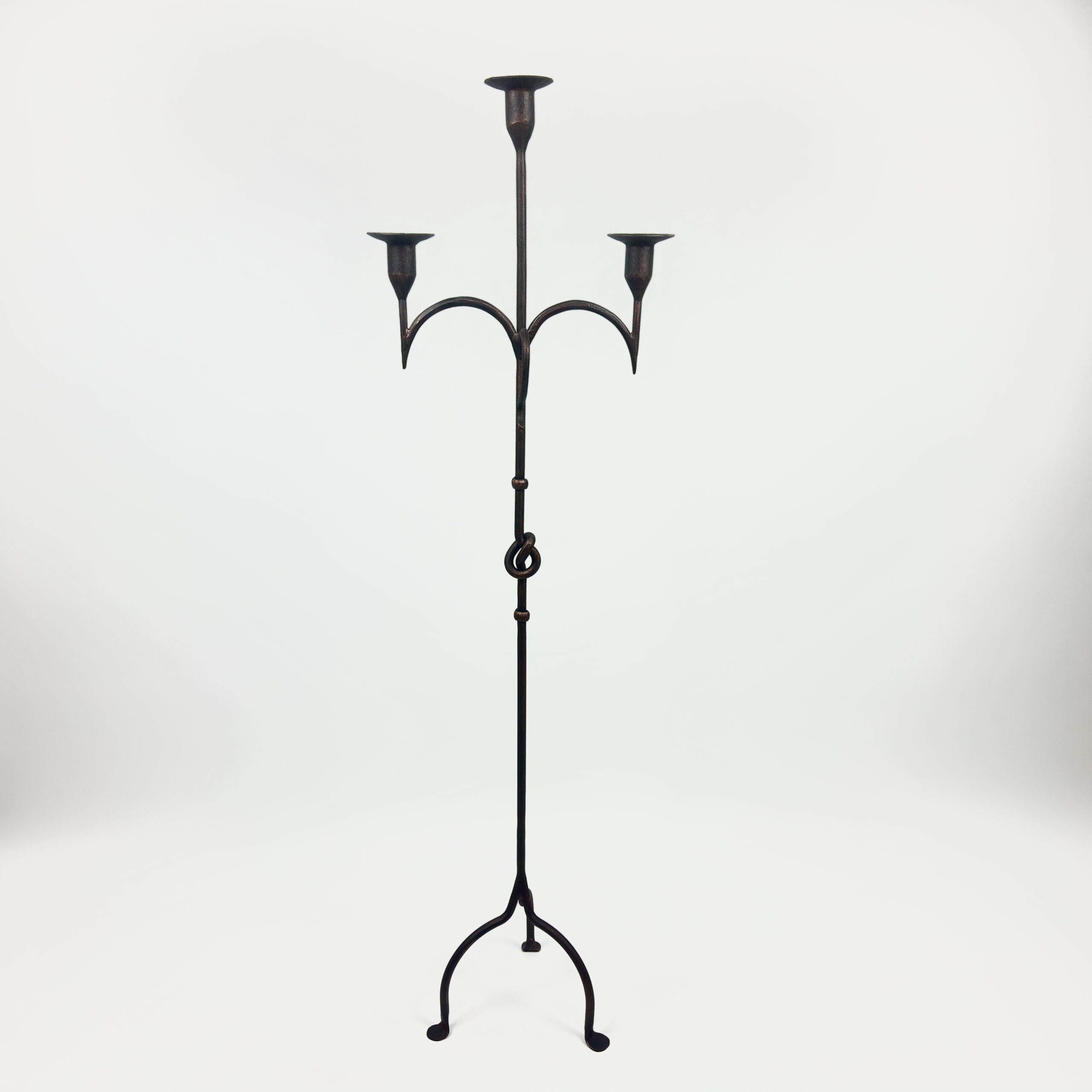 Make a meaningful statement in your home with this Hand-Forged Wrought Iron Floor Candelabra. Standing at 125 cm (49 inches), this piece transforms a rigid material like iron into a fluid form, showcased by the central Knot Detail.