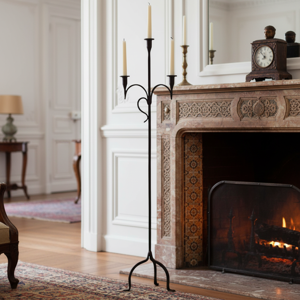 Prove that you don’t need a massive footprint to make a big statement with this Hand-Forged Wrought Iron Floor Candelabra. Standing tall at 126 cm (50 inches) but with a slender 36 cm (14 inch) base, this model is a masterclass in elegant efficiency.