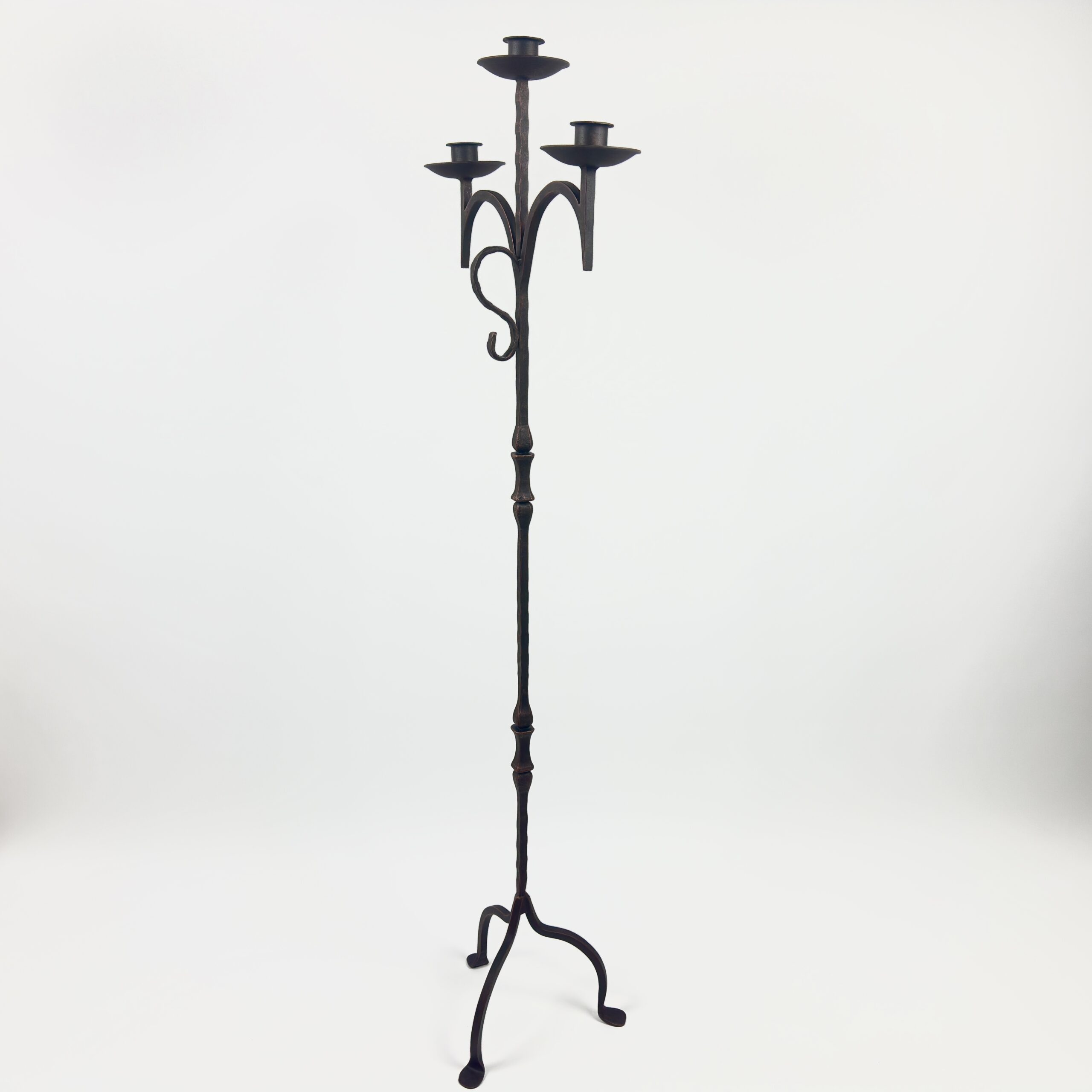 Hand Forged Iron Floor Candelabra 50.5″ (128cm) Antique Copper Patina 3-Arm Twist & Scroll Design Rustic Wedding Decor