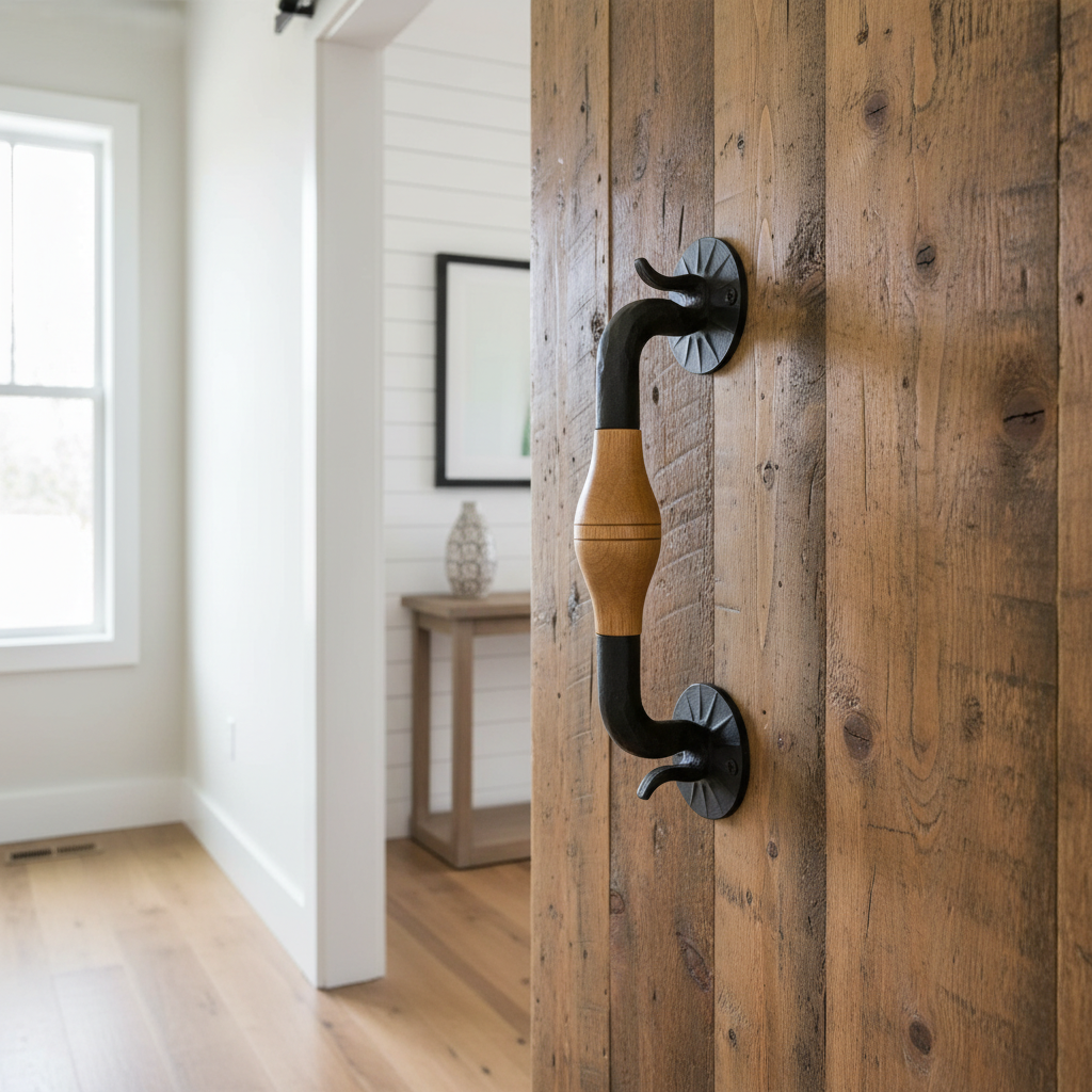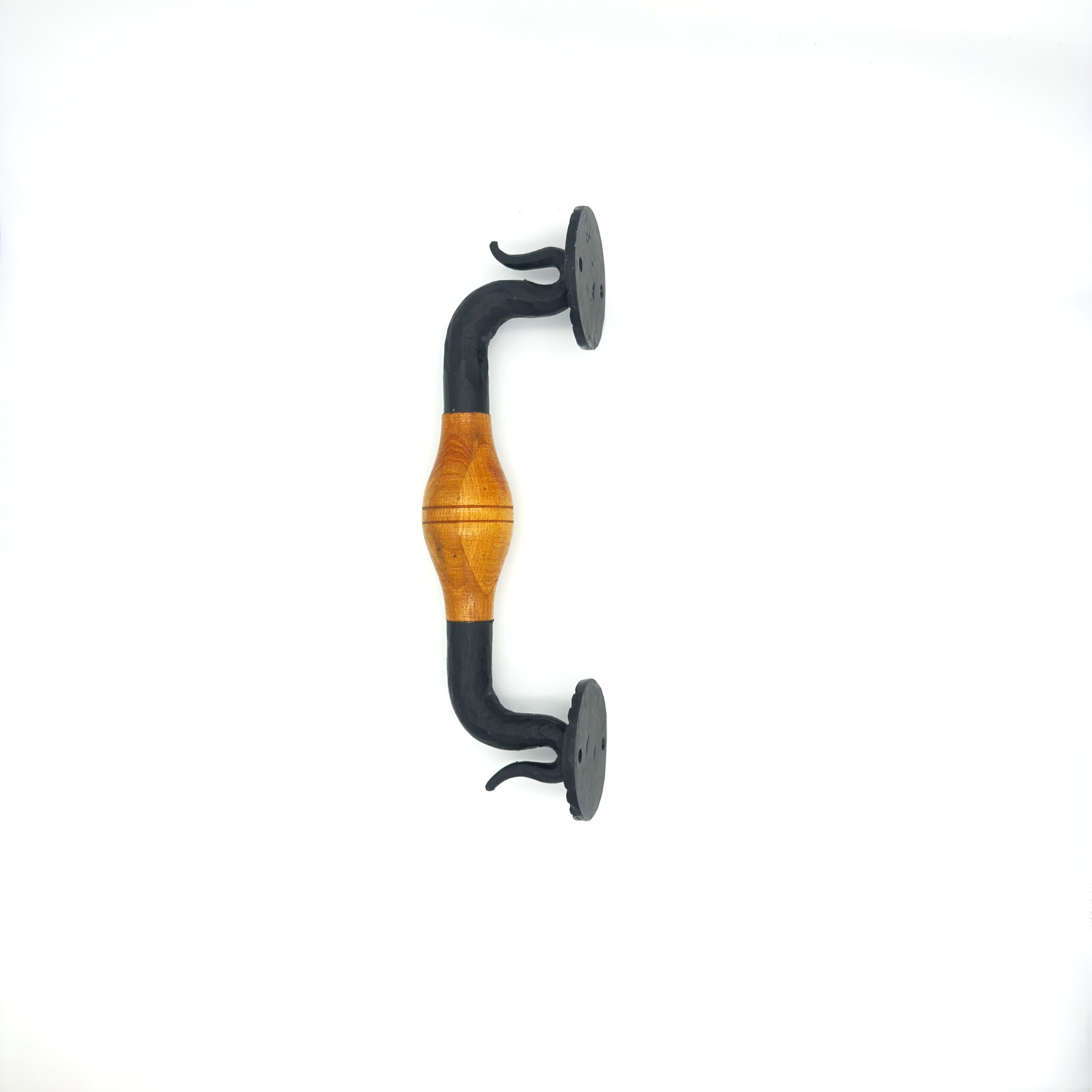 Comfort Meets Durability The central wooden grip is carefully turned and shaped with a subtle swell ensuring a highly comfortable and secure hold. It prevents the cold shock of grabbing bare metal in winter while still offering the extreme durability of an iron frame. The vivid contrast between the matte black iron and the warm wood tone creates a stunning focal point for any custom wood door.