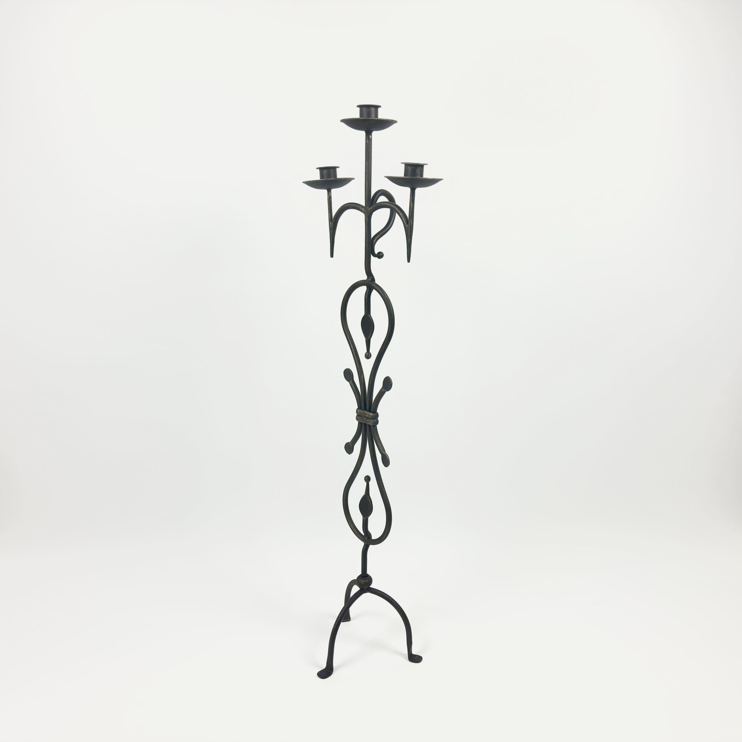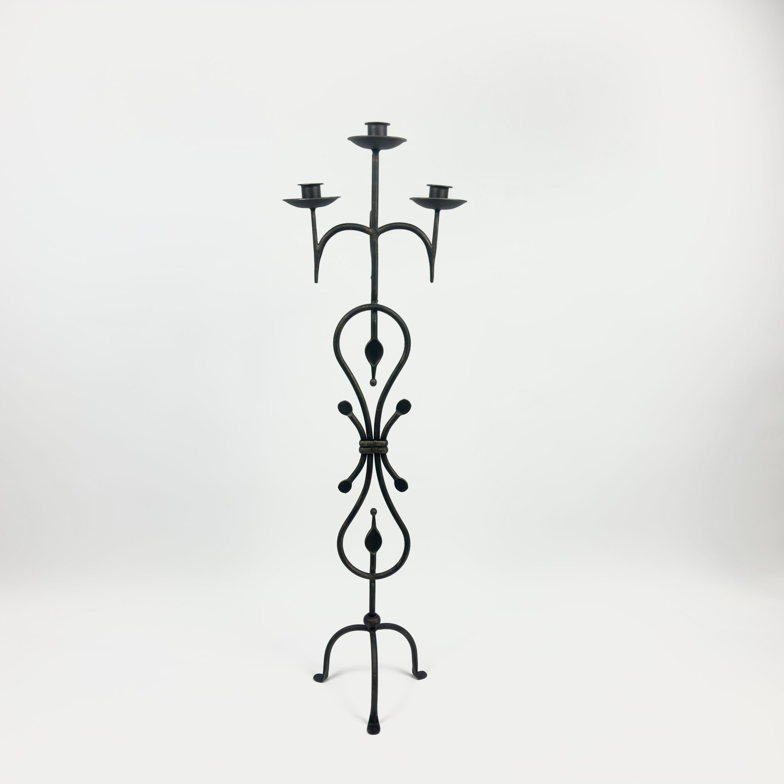 Bring a luxurious, classic touch to your living space with this Hand-Forged Wrought Iron Floor Candelabra. Standing at 113 cm (44.5 inches), this piece departs from straight lines, featuring a beautifully curved Scrollwork Body embellished with a rich gold finish.
