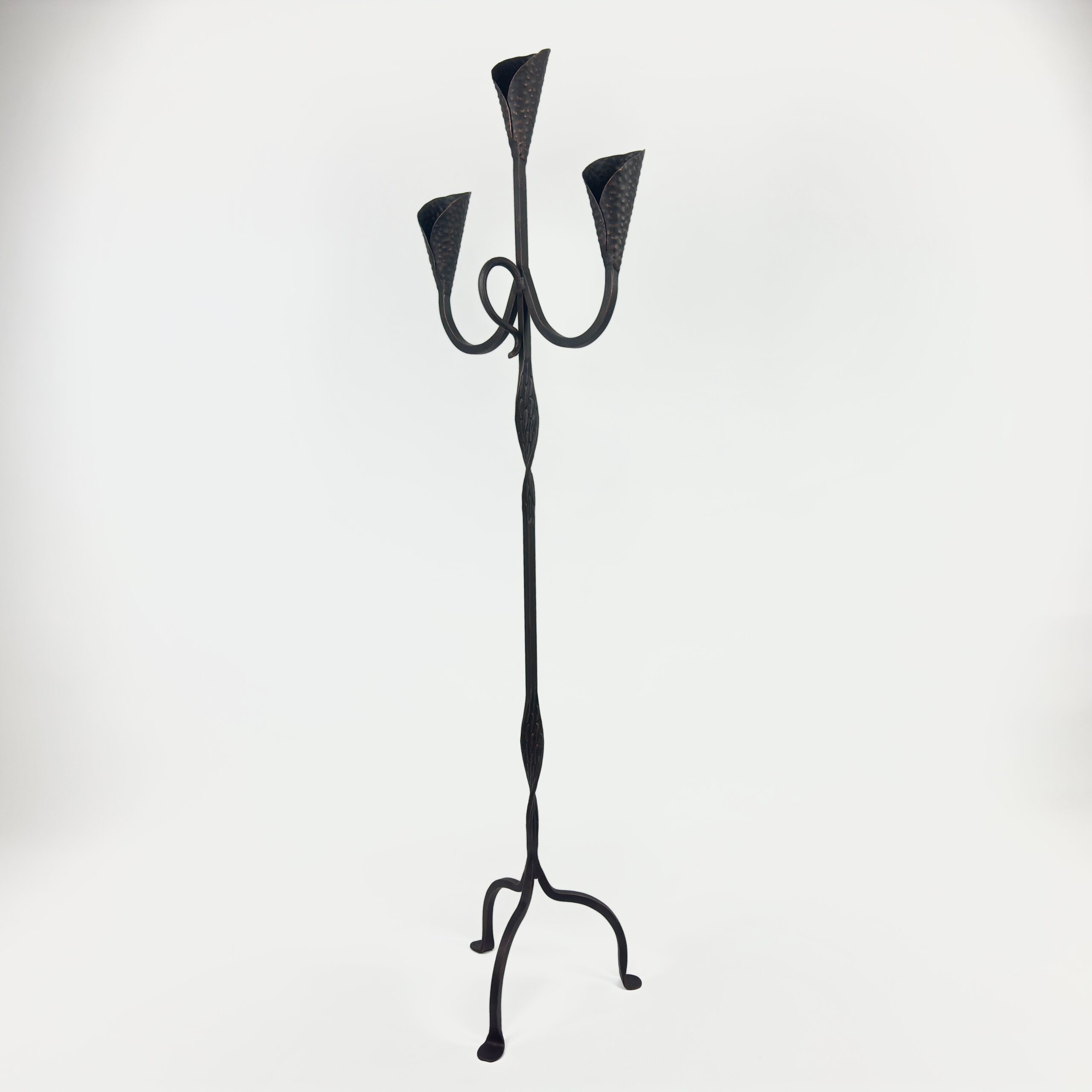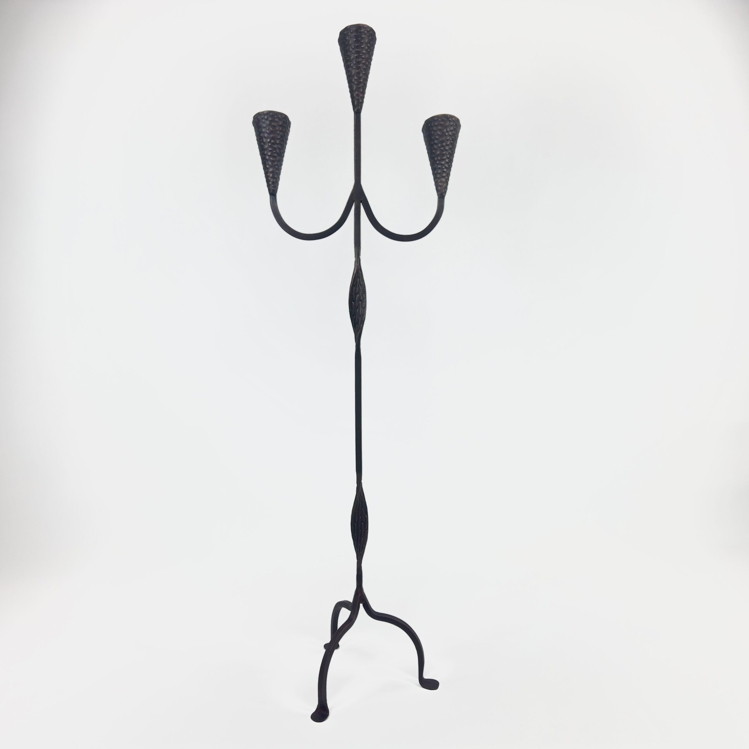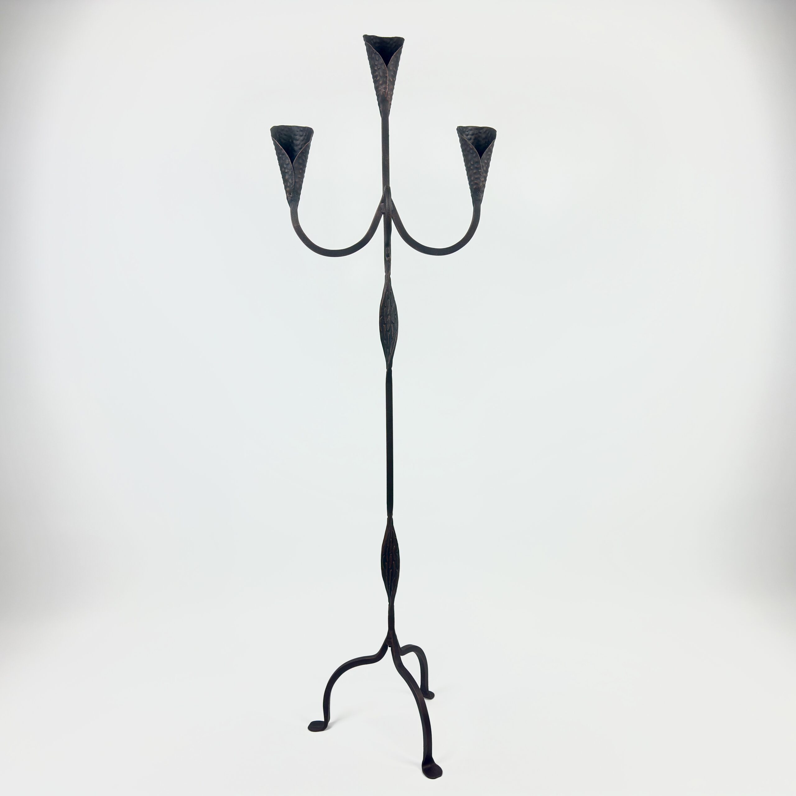 Transform your space with the artistic elegance of this Hand-Forged Wrought Iron Floor Candelabra. Standing at 127 cm (50 inches), this piece distinguishes itself with delicate, hand-forged leaf (almond) details integrated into the stem, showcasing the blacksmith’s skill.