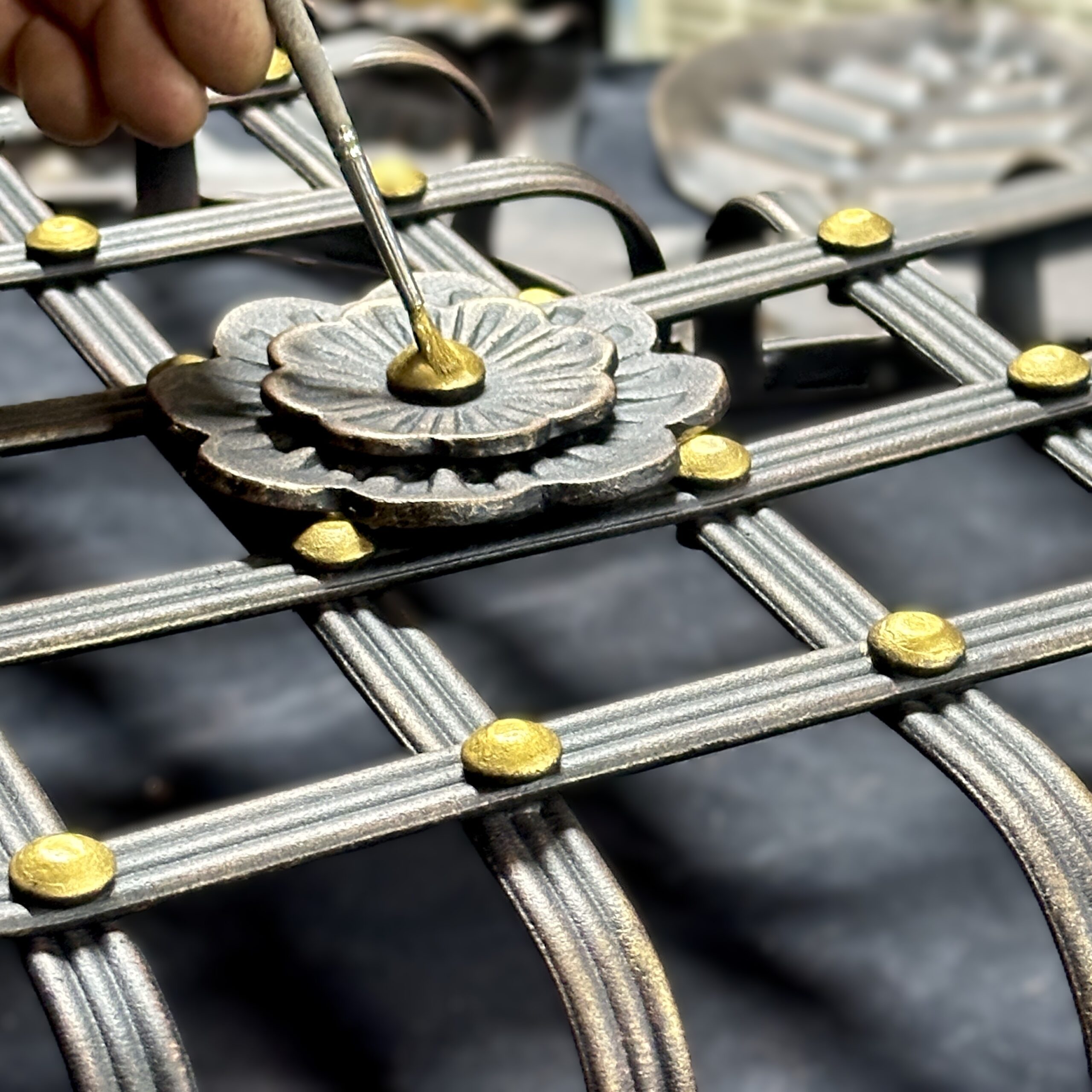 Artisan Construction Every inch of this sculpture shows the hand of the maker. From the wavy, ruffled border shaped on the anvil to the meticulous application of the gold rivets and the hand-painted central flower, this is true craftsmanship. The Antique Copper finish gives it the look of a cherished heirloom that has aged gracefully.