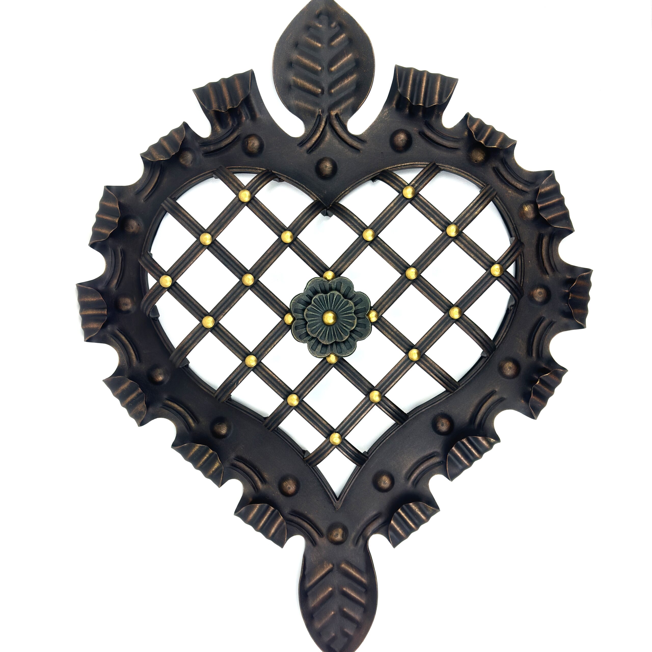 A crown jewel for your gate. This large (83cm) hand forged heart sculpture features elegant leaf finials, a ruffled iron border, and a studded lattice center finished in warm antique copper.