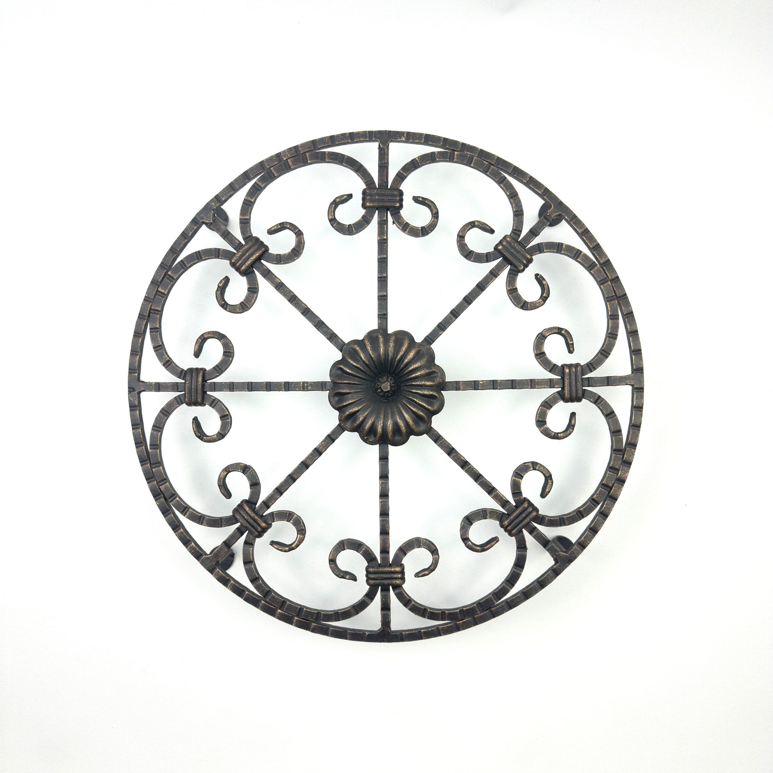 A timeless centerpiece. This handcrafted round wall medallion features intricate iron scrollwork and a central floral rosette, finished with elegant gold patina accents.